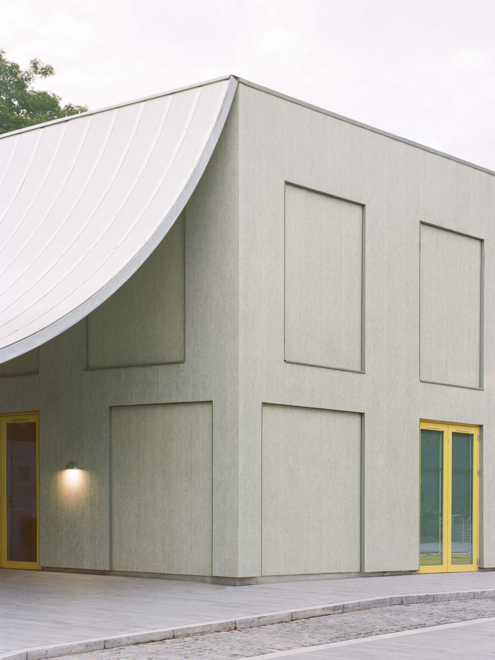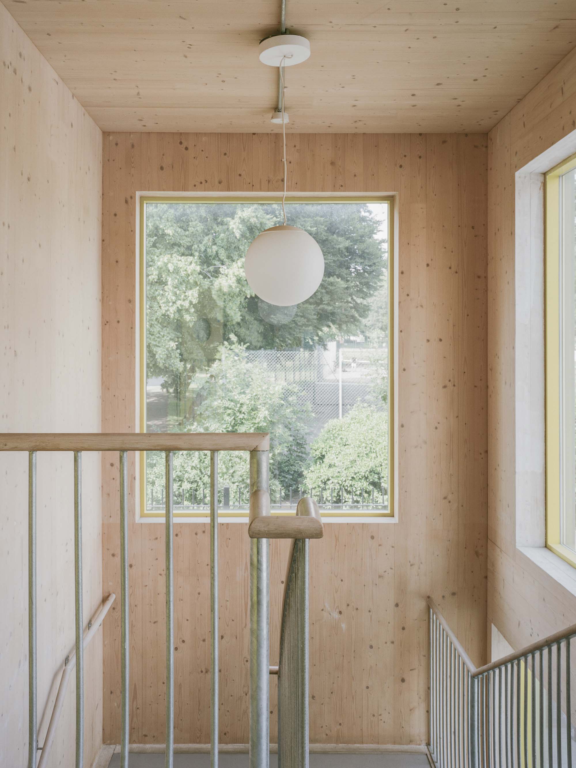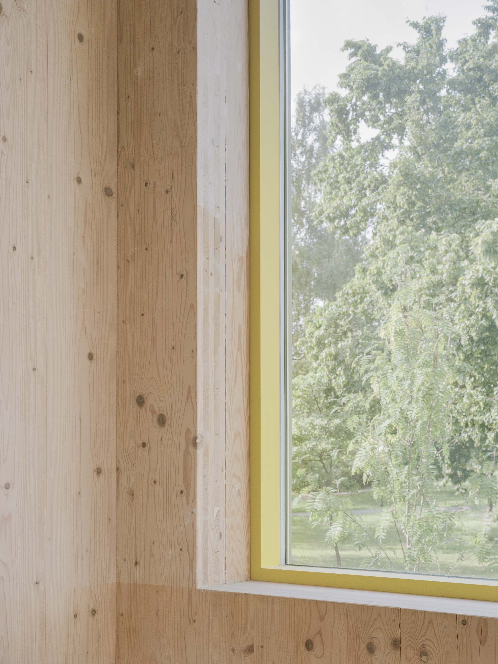 Towards the square, a yellow canopy defines the entrance to the community centre with a staircase that leads up to the hall on the first floor. As construction time was one of the key constraints, the cross laminated load-bearing timber walls and ceilings remain visible to the interior with services and conduits exposed. The CLT walls are treated only with a thin white coat of paint to give a warm feel to the interior. The facades are clad in a light-green fibreglass rain-screen that is contrasted with yellow timber aluminium composite window frames and the galvanised steel structures of the canopies.