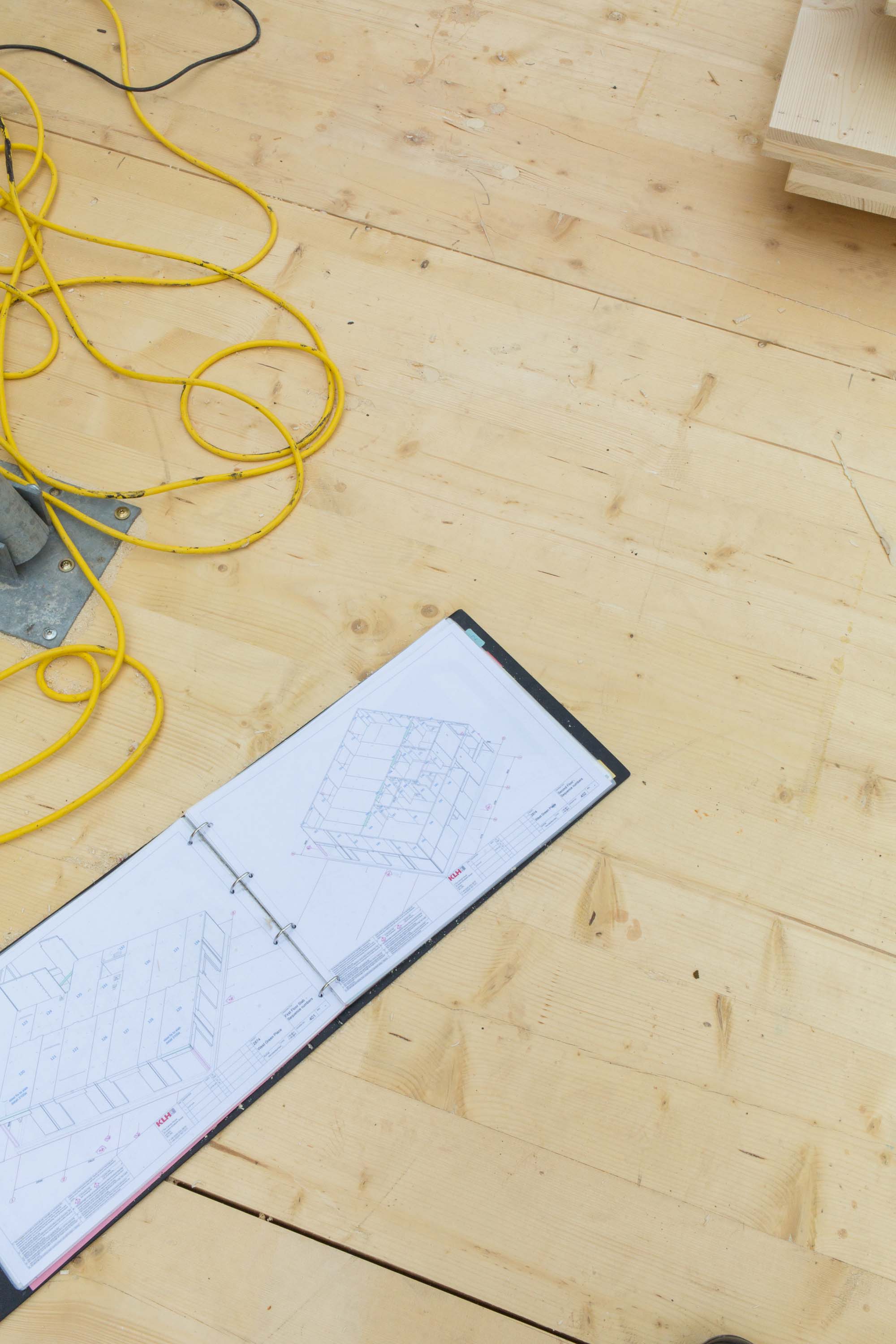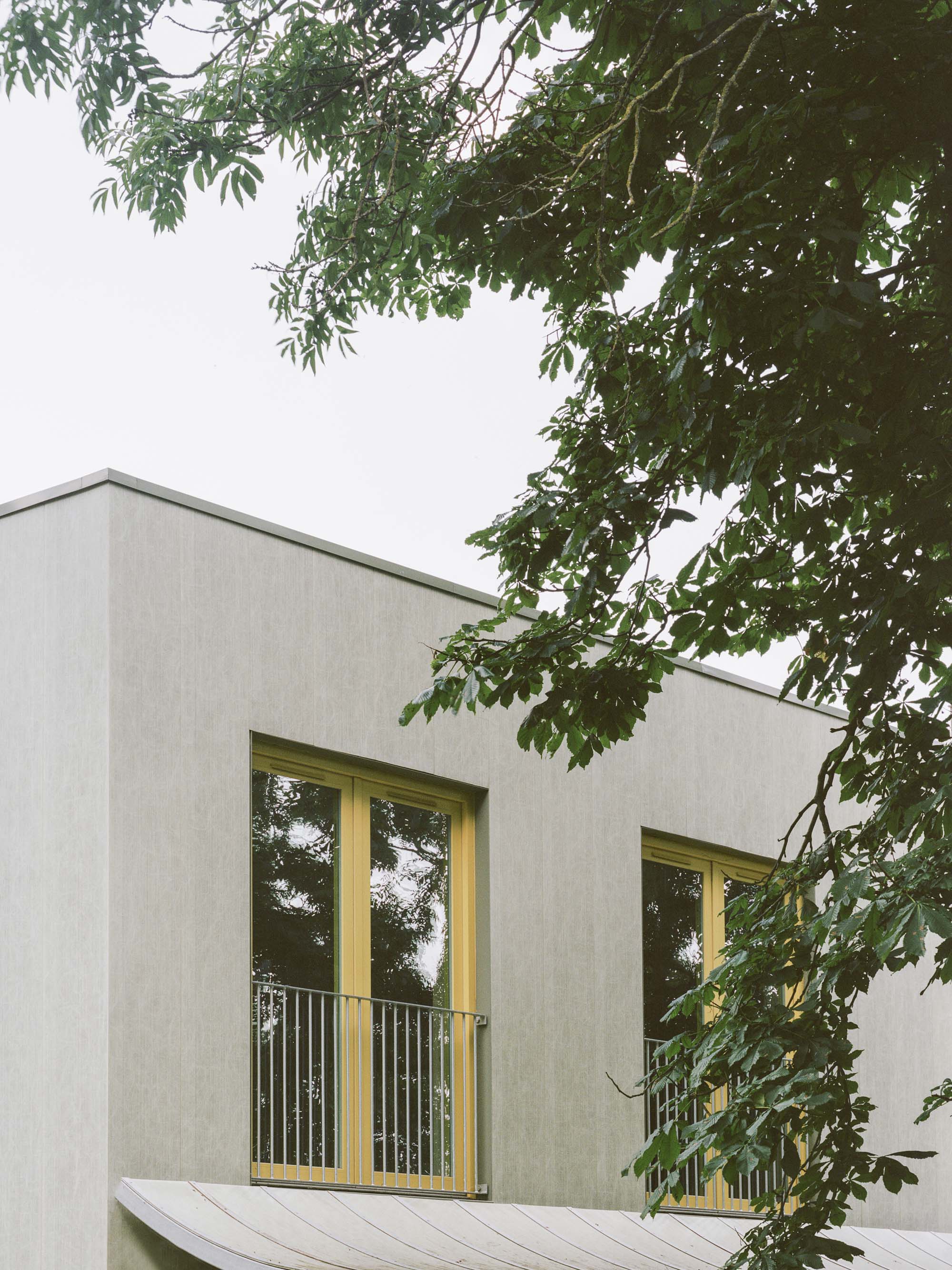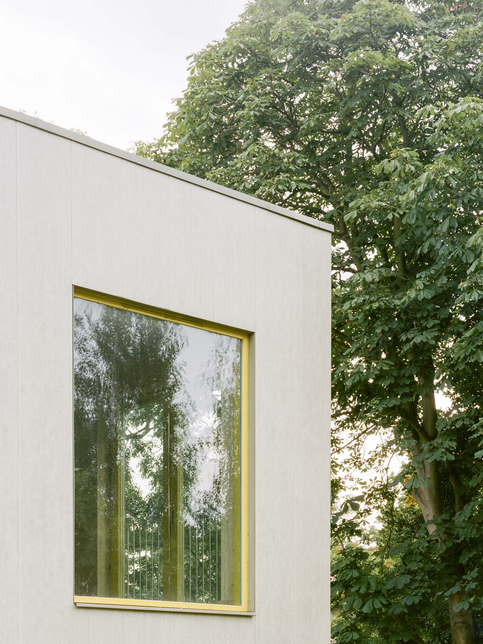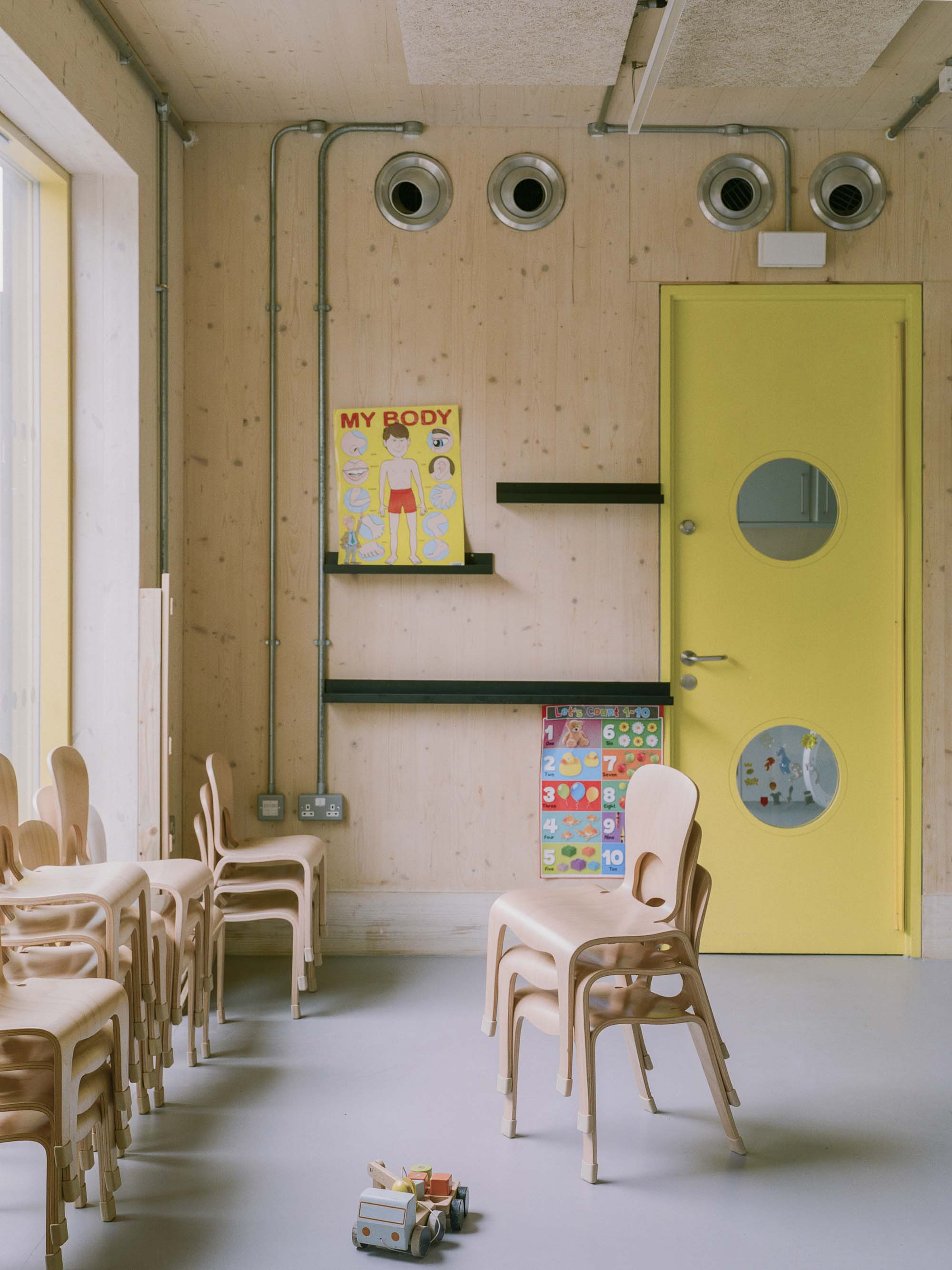 Towards the square, a yellow canopy defines the entrance to the community centre with a staircase that leads up to the hall on the first floor. As construction time was one of the key constraints, the cross laminated load-bearing timber walls and ceilings remain visible to the interior with services and conduits exposed. The CLT walls are treated only with a thin white coat of paint to give a warm feel to the interior. The facades are clad in a light-green fibreglass rain-screen that is contrasted with yellow timber aluminium composite window frames and the galvanised steel structures of the canopies.