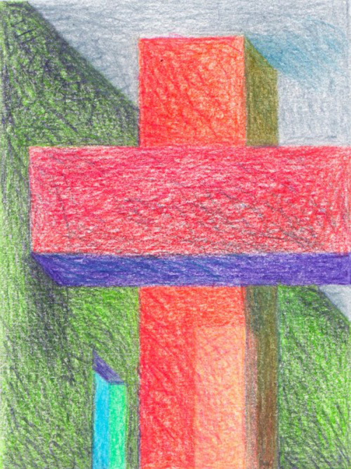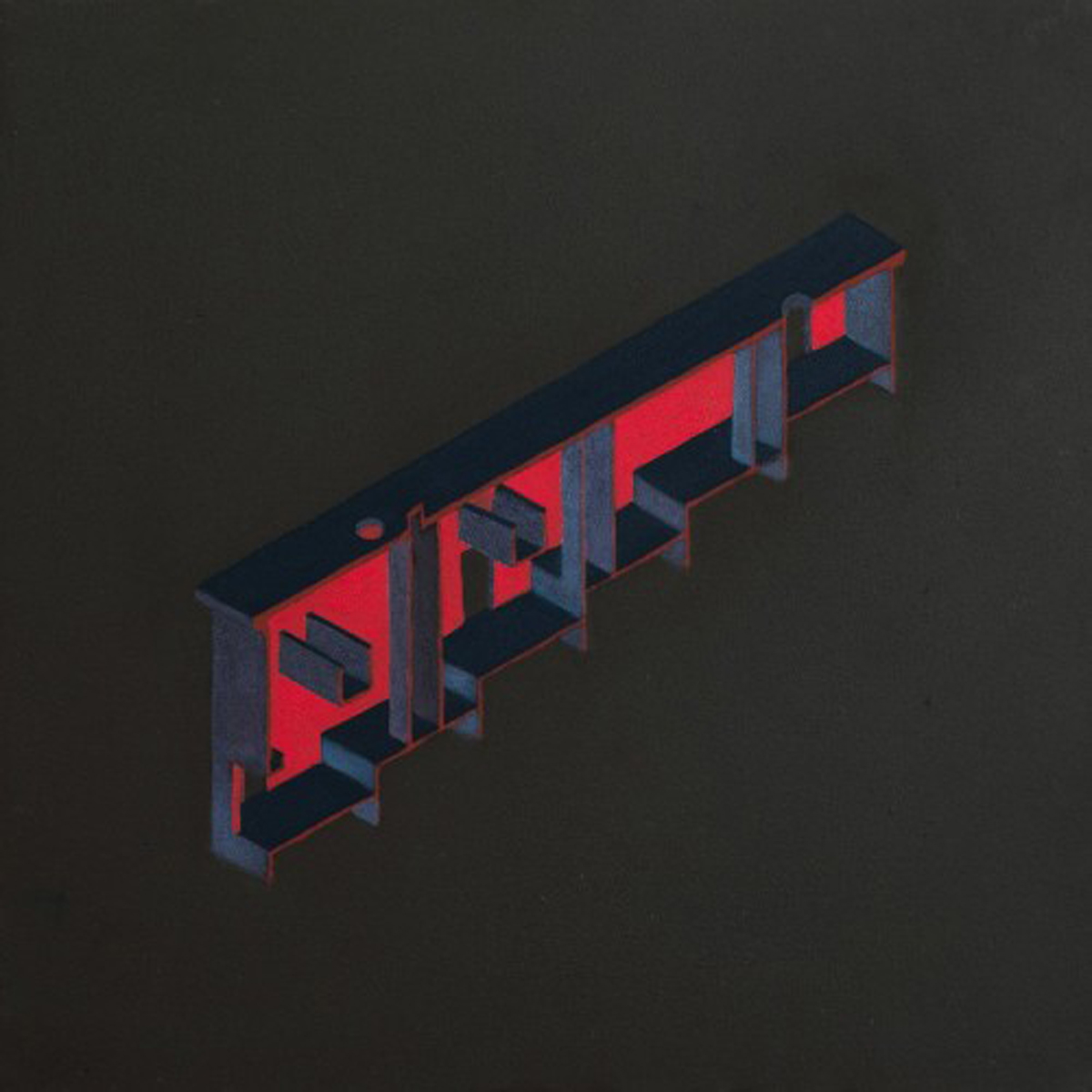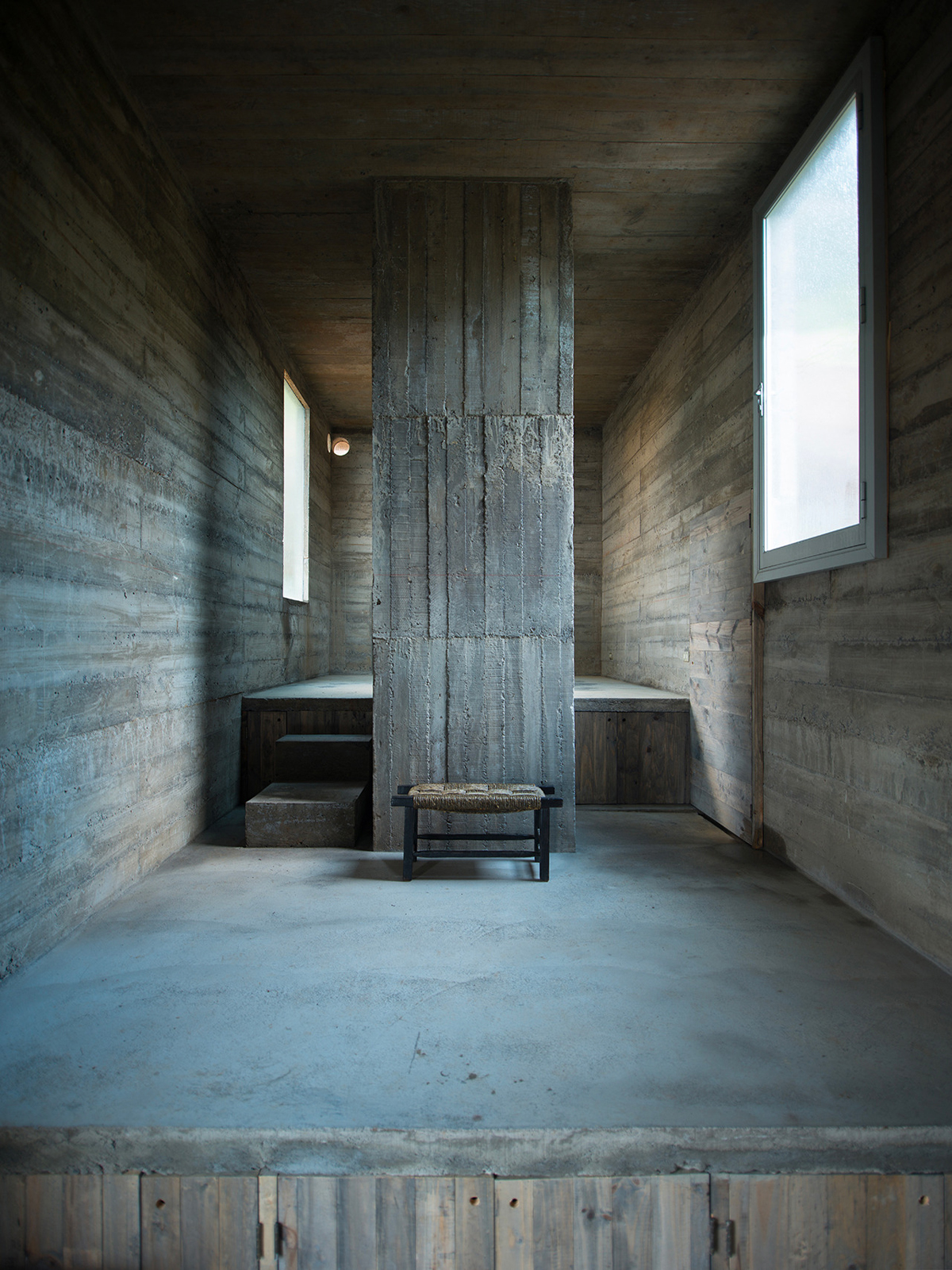 There is a discreet regime of openings at either sides of the long volume with some punctual skylights, a few half-moon perforations that could be used as sun clocks and a singular corner window divided by a round pillar. This is the only window with unframed glass flushed to the outer concrete surface. Mirroring the sunset, an almost impossible and illusory floating rock rests right on top of that reflection.