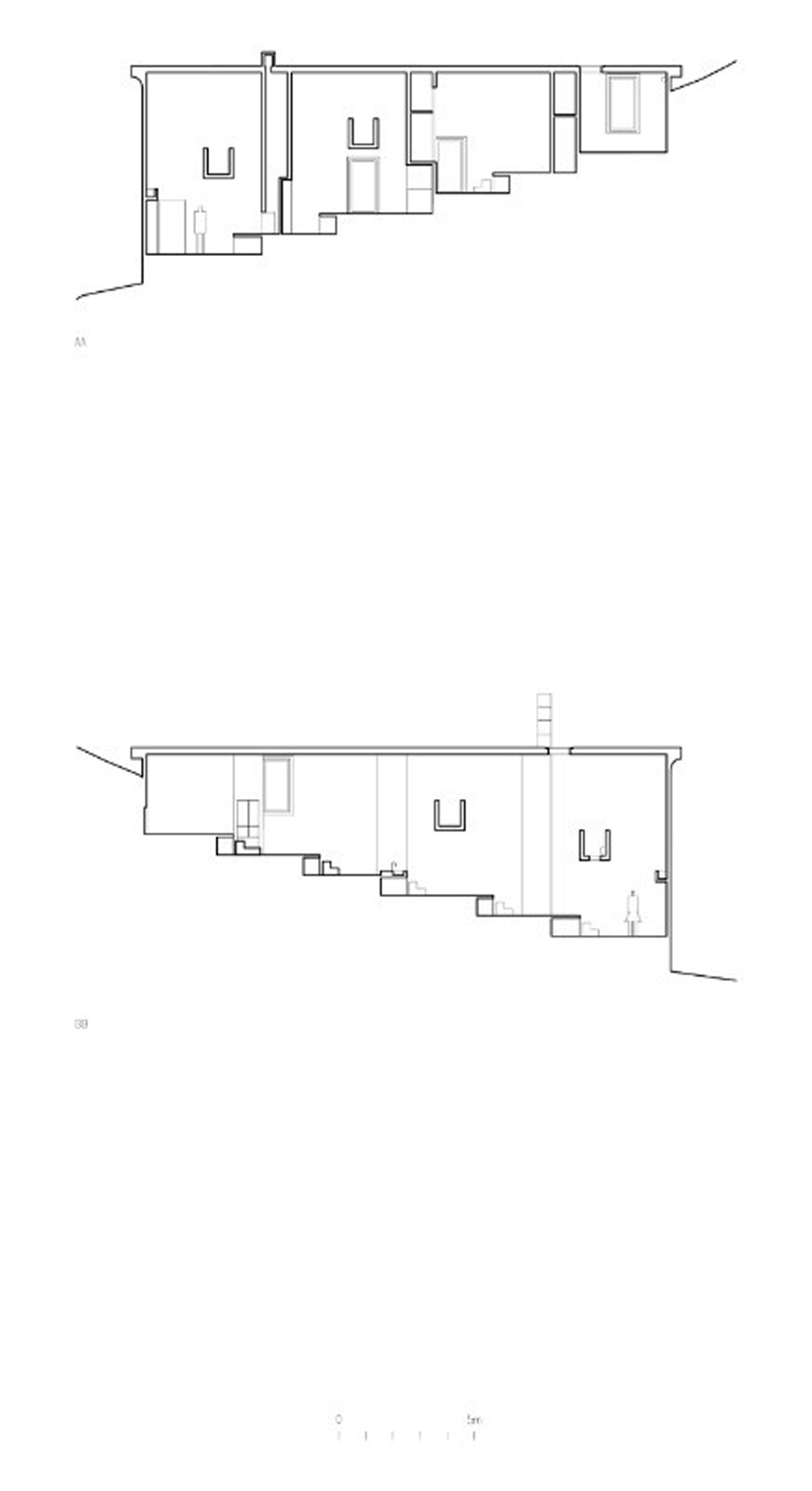 In its under dimensioned thickness, in its narrow and tall proportion, the building could be read as an inhabited wall that runs perpendicular to the natural topography. The height of this wall is determined by two lines: a continuous horizon and a stepped sequence of six platforms that descend towards the sea.