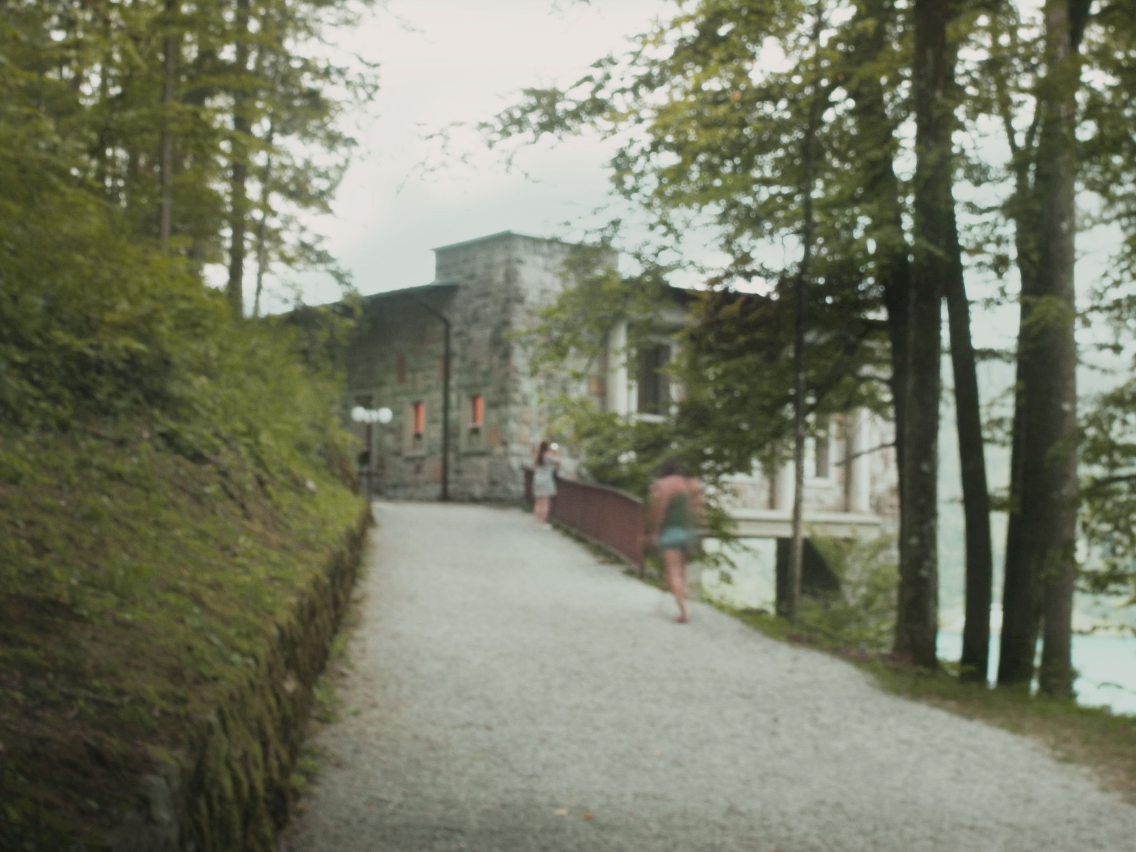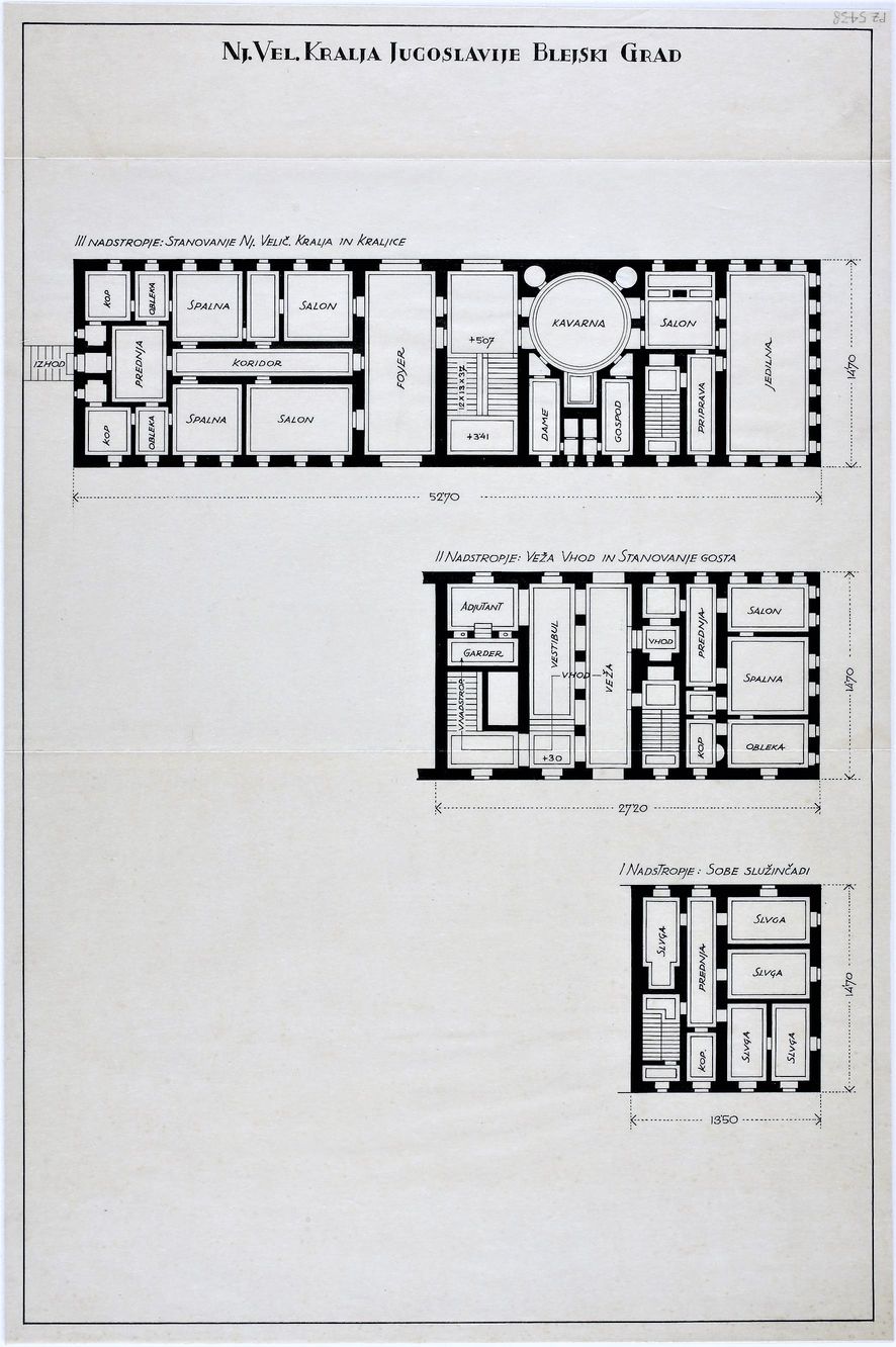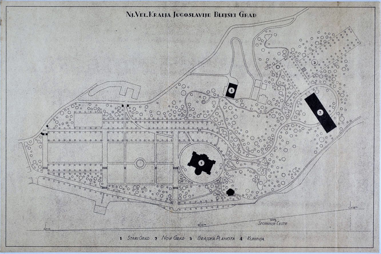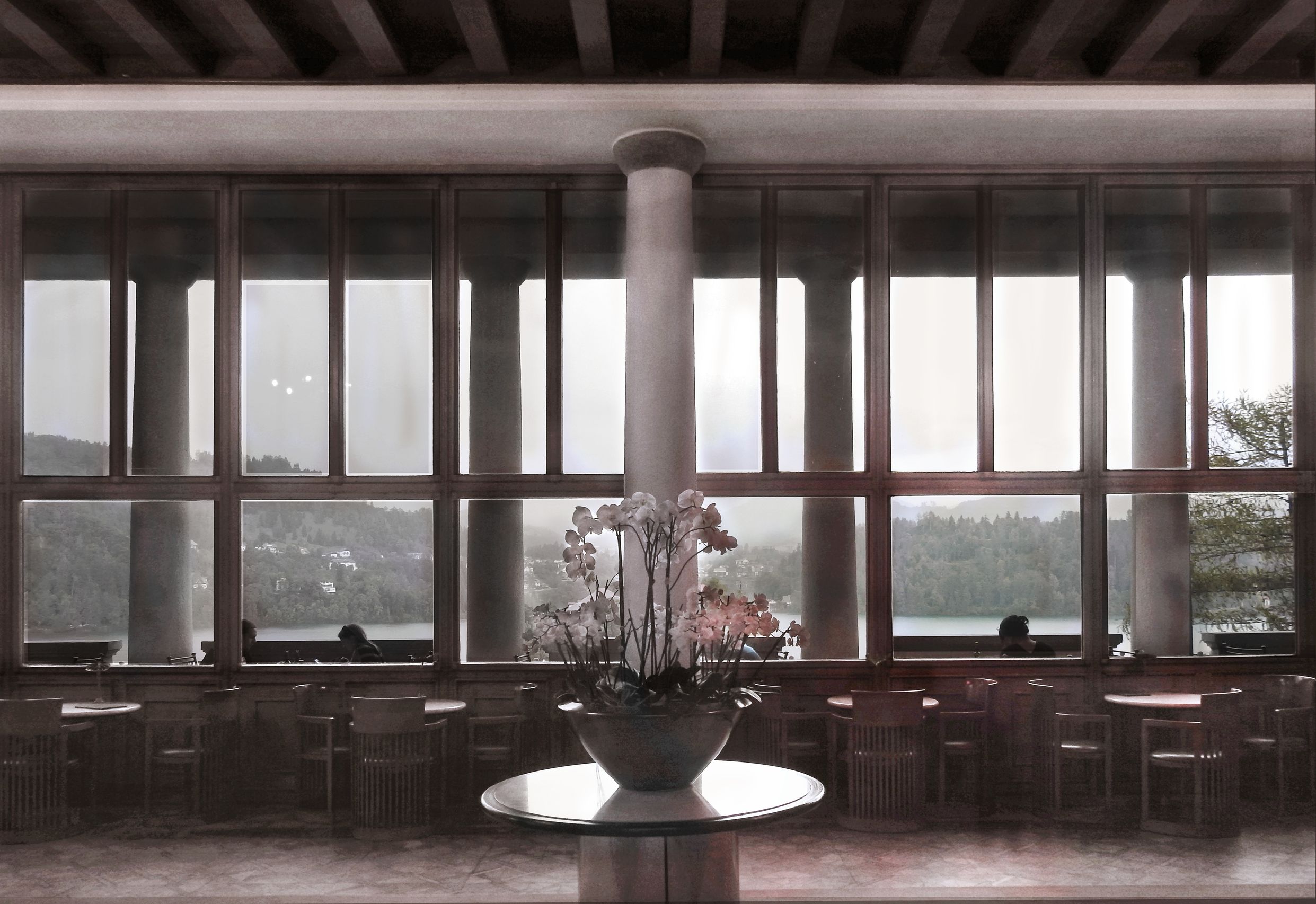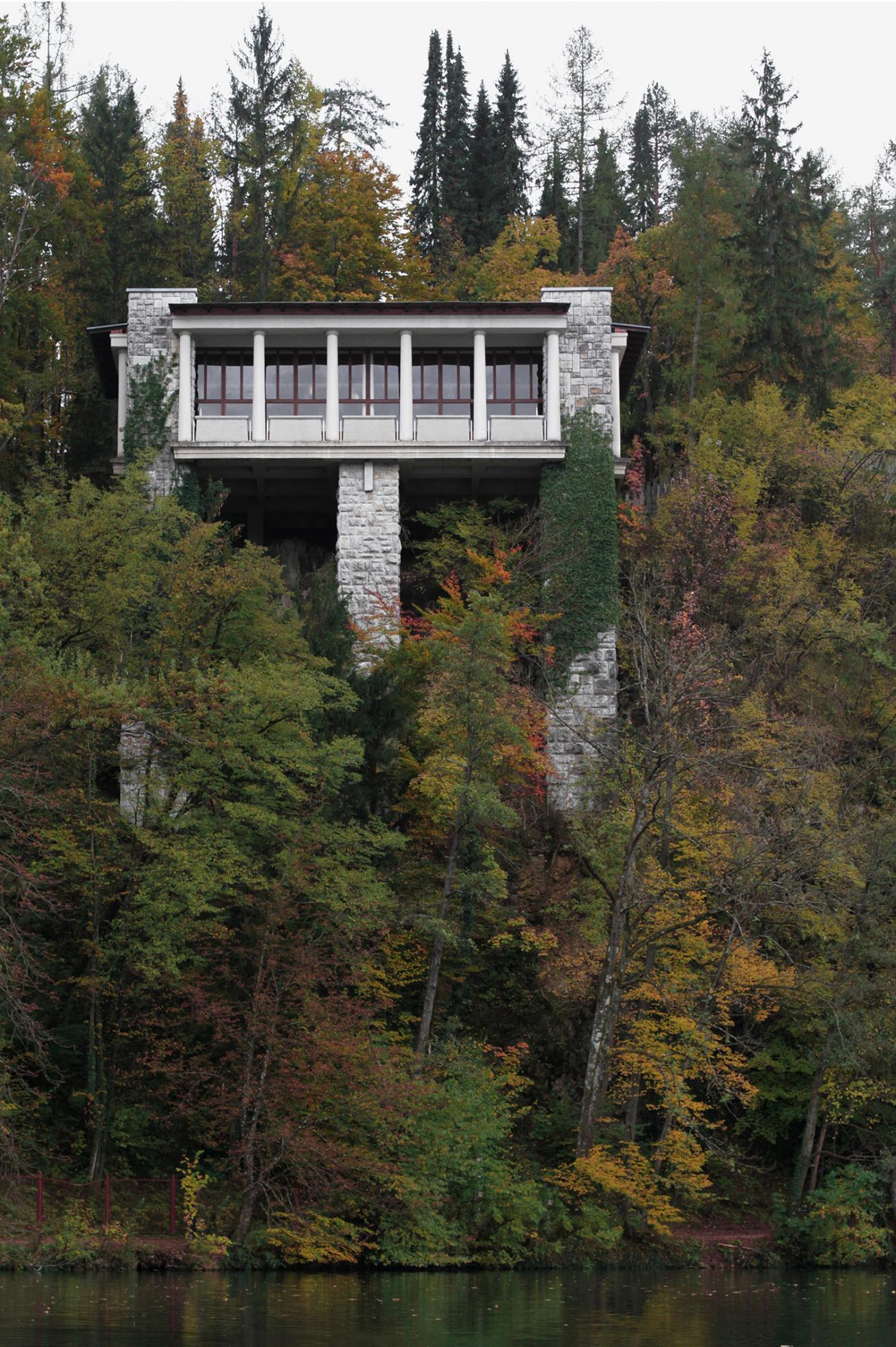 The Belvedere Pavilion, as the buildings are known as, has an unusual history. The dimension of the stone pillars and the steep terrain suggests an altogether different scale and programme to that of a small teahouse. Once a part of the princely Windischgrätz estate, the area was bought for Alexander, the new King of Serbs, Croats and Slovenes, later the first king of Yugoslavia. In the Alpine panorama of the old medieval castle across the lake and the catholic church on the small island in the middle of the lake, the king wanted to make his own architectural mark. He asked the foremost Slovene architect Jože Plečnik, the author of the renovation of the Prague presidential residence, to come up with suitably impressive plans for the new castle. Plečnik conceived an impressive compact mansion high on the rocky hill overlooking the island. It was designed as half a feudal manor and half a Hollywood villa, complete with a curved driveway for cars that would lead directly to the lower floor of the building. The three pillars were to support the main block of the house, which could then protrude all the way to the lakeshore. Construction on the ambitious undertaking started in the 1930s; by October 1934, when King Alexander was assassinated in Marseilles, only the three great pillars were completed. The royal residence on top of them was never built; the royal widow stopped the construction and started to build a new villa on the site of the Windischgrätz mansion not far away from the original construction site.