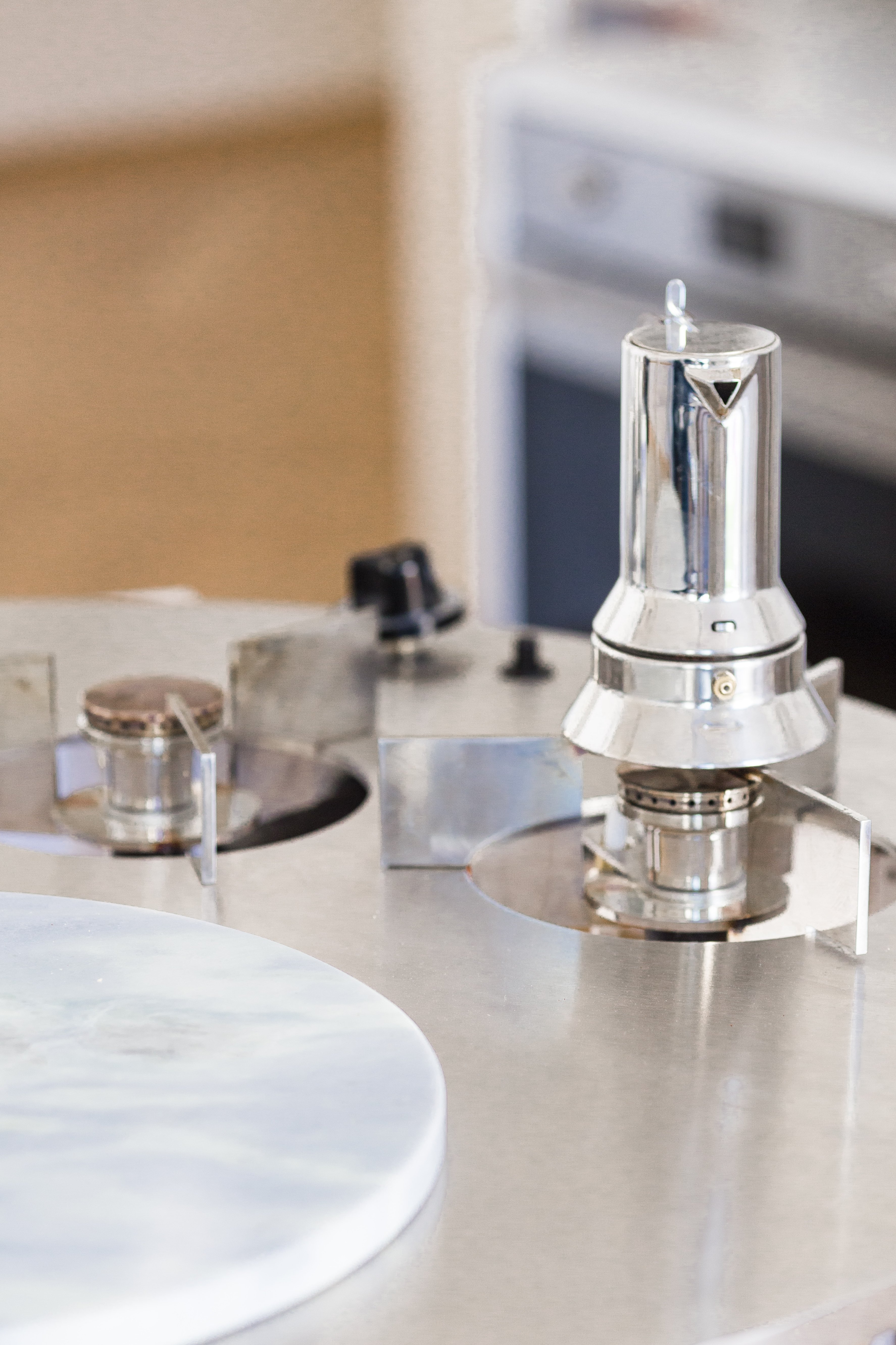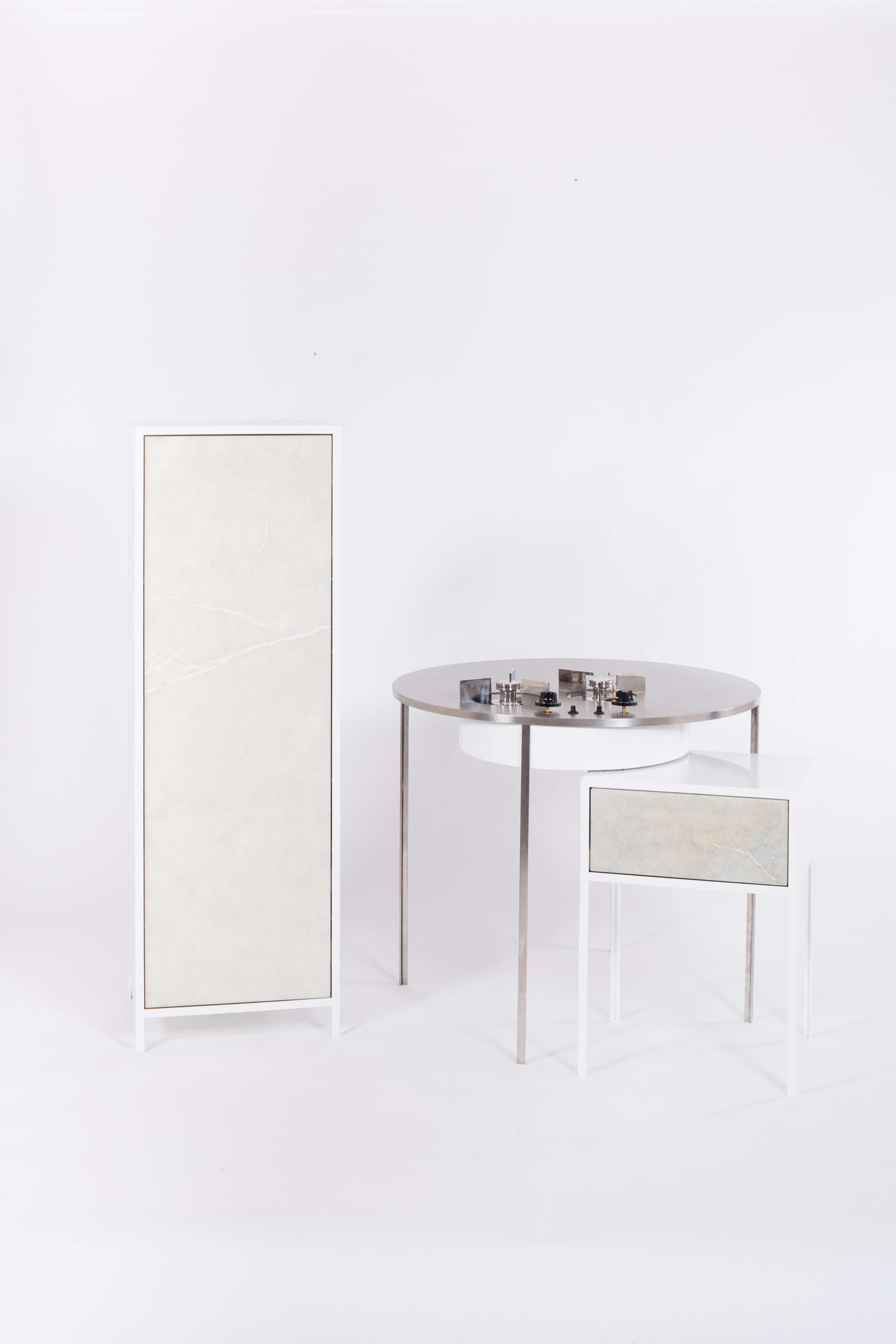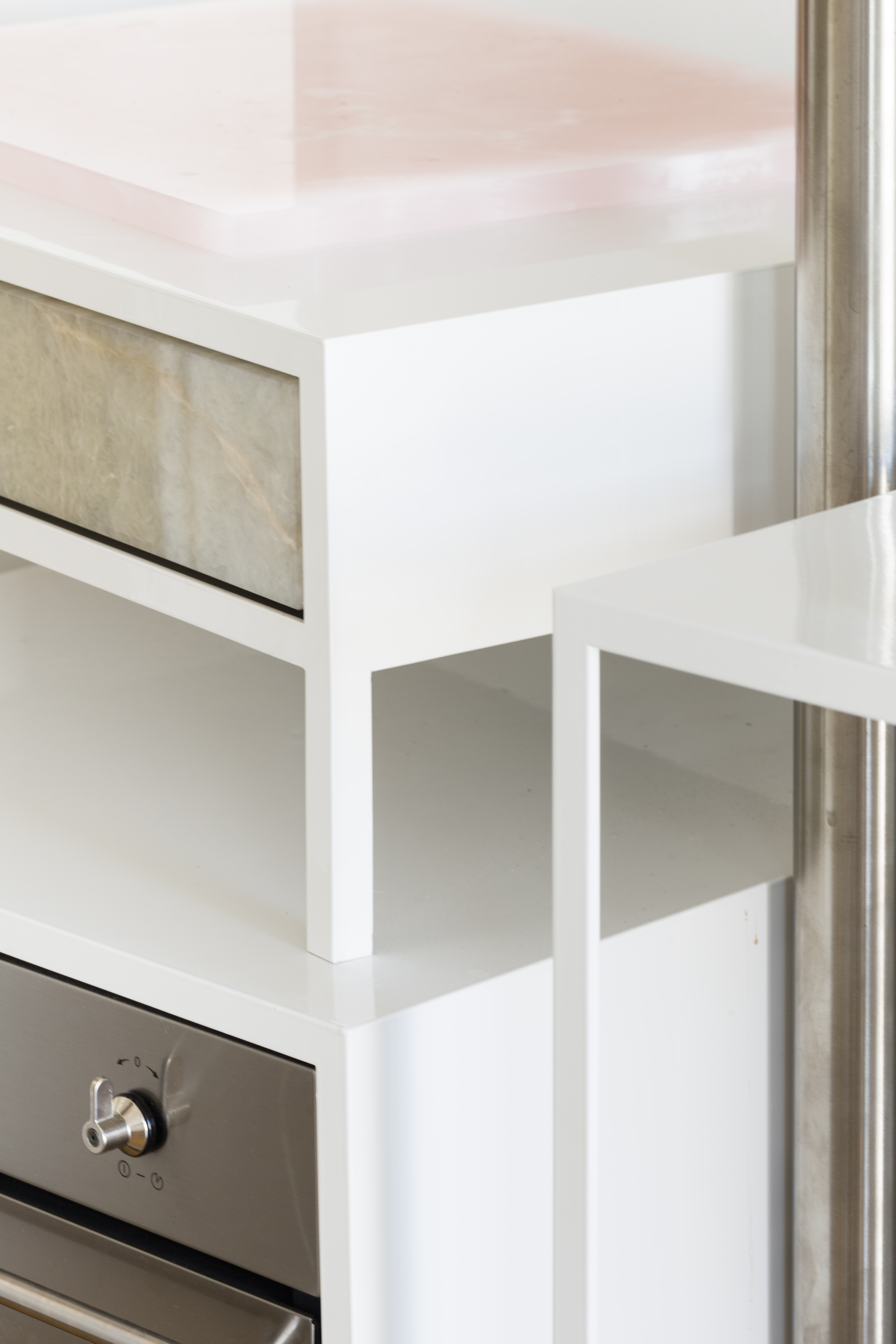 The kitchen consists of a round cooking table and a kitchen-utensil rack in stainless steel, a small drawer with marble front, countertop with sink, cupboard on long legs, tall shelf tower, dishwasher box, oven box with marble drawer, and marble storage on a plinth. All are built with steel plate on steel angle legs and powder-coated. The series is completed by a set of marble cutting boards in various colours and shapes. It can be flexibly arranged for cooking together.