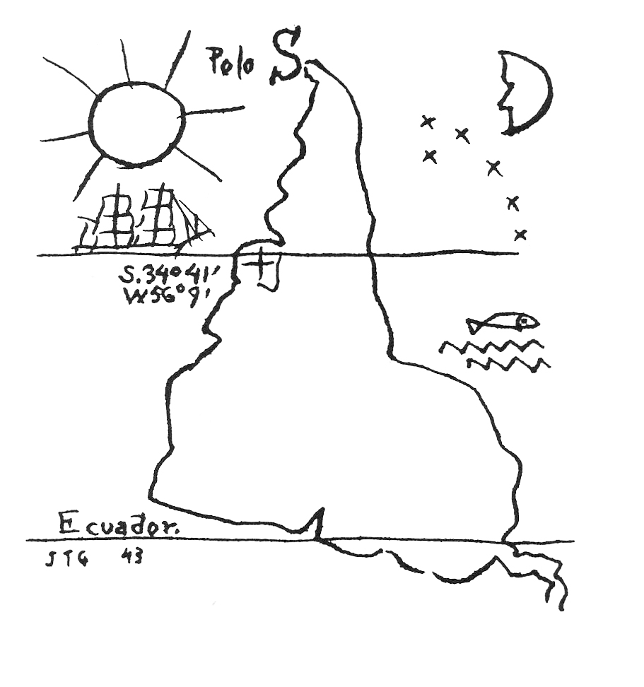 A finales de los años cuarenta el uruguayo Joaquín Torres García, dibujó un famoso plano que colocaba la Patagonia en la parte superior del mundo. Su “escuela del sur” reclamaba de ese modo una completa reorientación mundial. Ese poner las cosas patas arriba supuso una liberadora revolución ideológica para todo un continente. Un simple cambio de orientación puede alterar el modo en que miramos las cosas y puede abrir ventanas a nuevas formas de ver. El derecho y el revés es una manía gravitatoria que ha impregnado ideológicamente y cargado de prejuicios todo lo que ha tocado. Dislocar el punto de vista supone abrir una puerta a lo impensado.