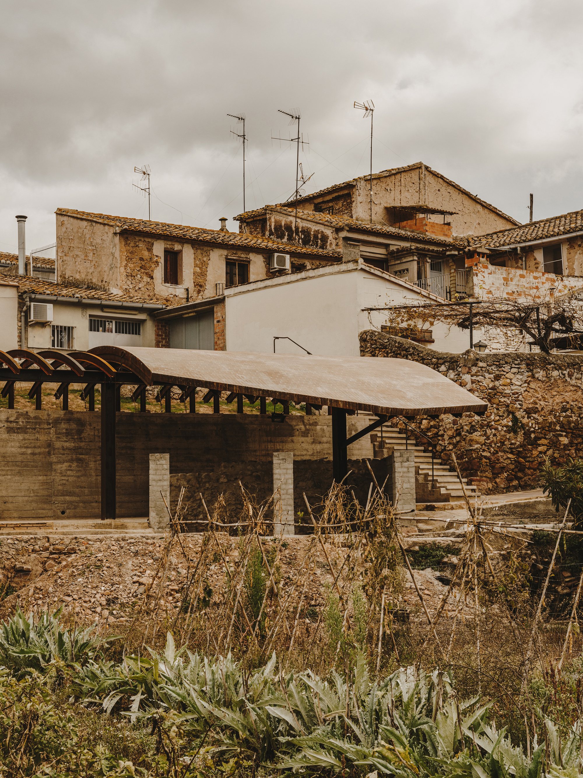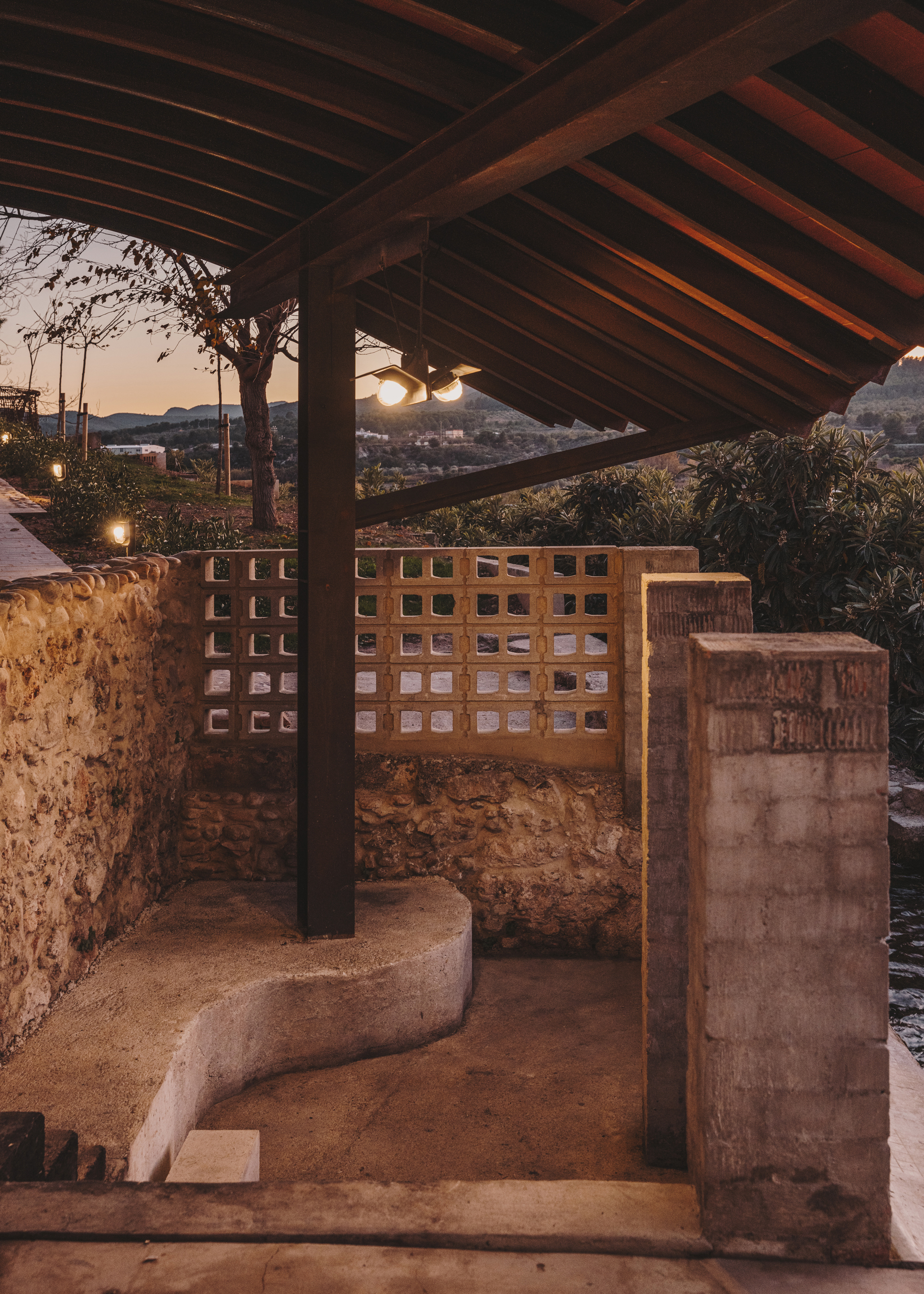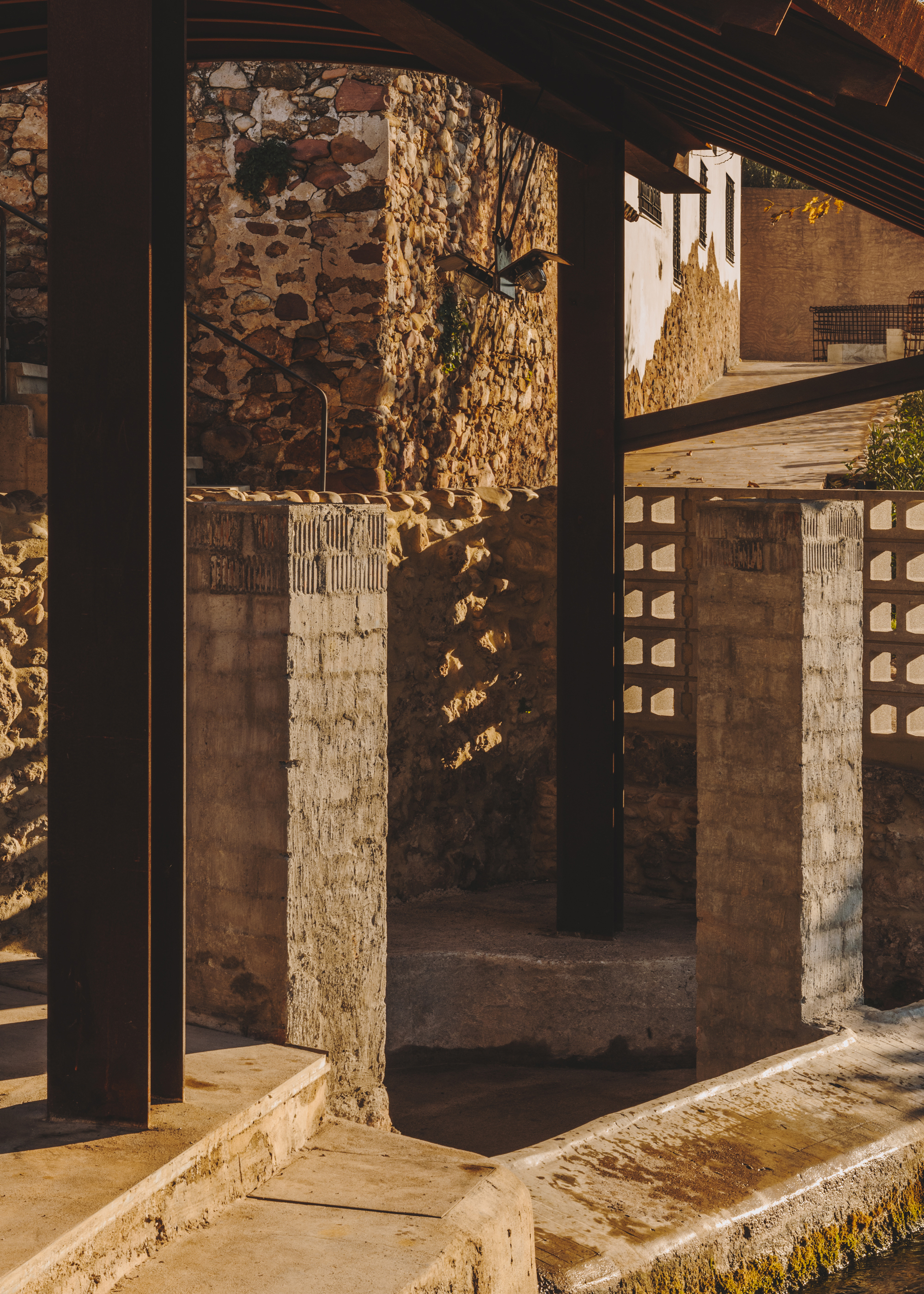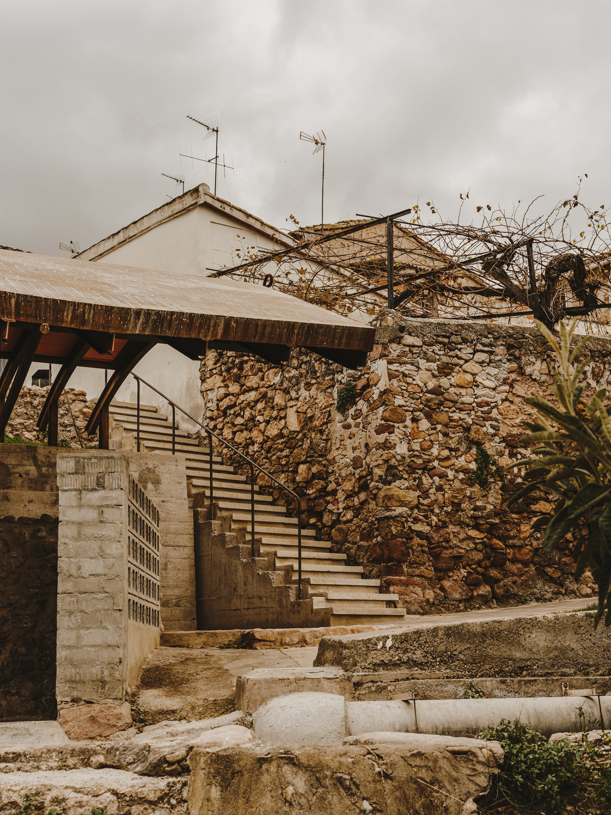 On the other side, a path gently slopes downward to the remains of the old washhouse. New stairs provide access and sitting –surprisingly, it is still in use by a few neighbors of age-.