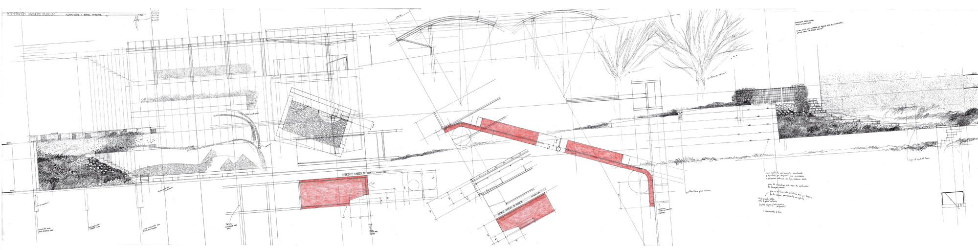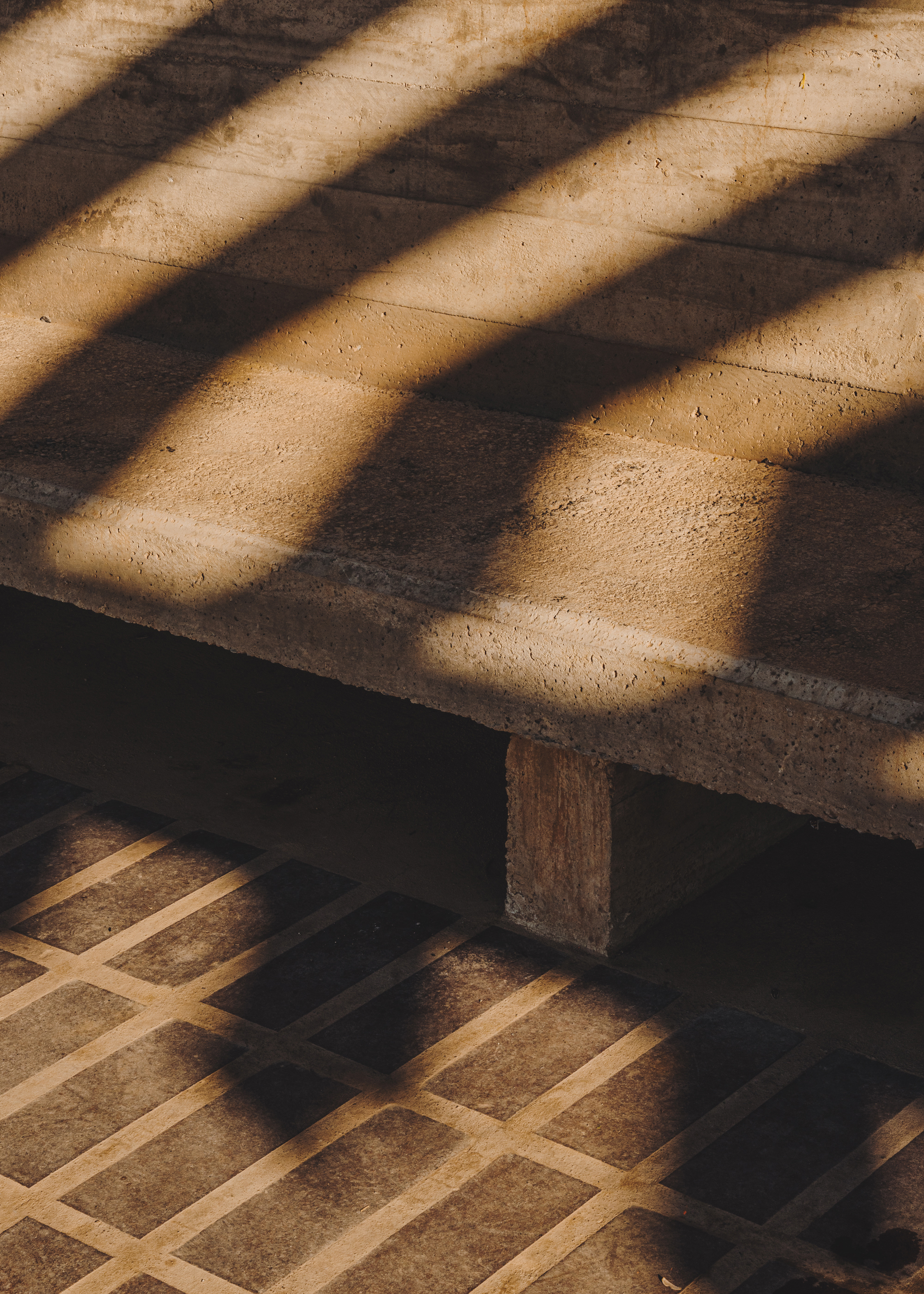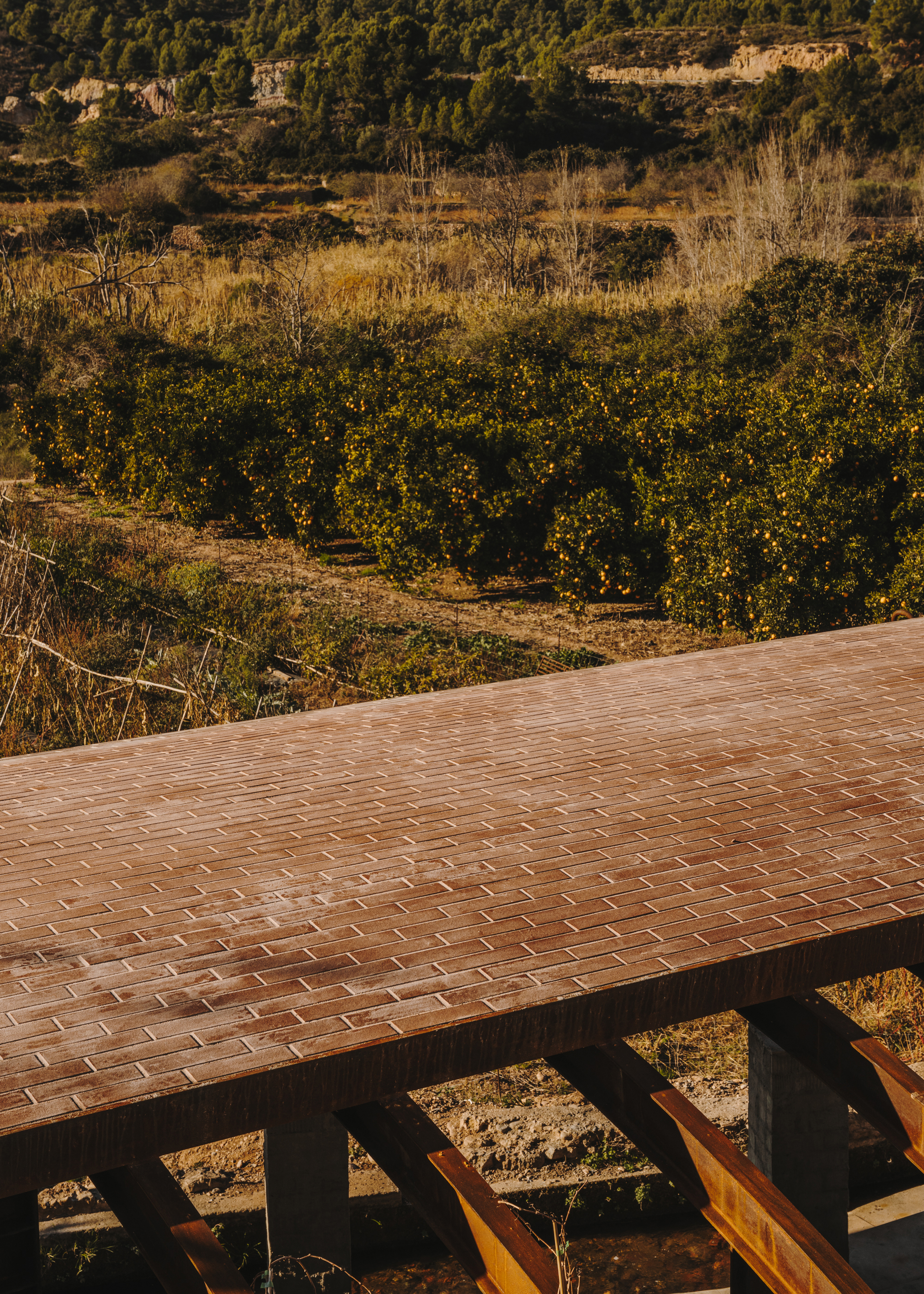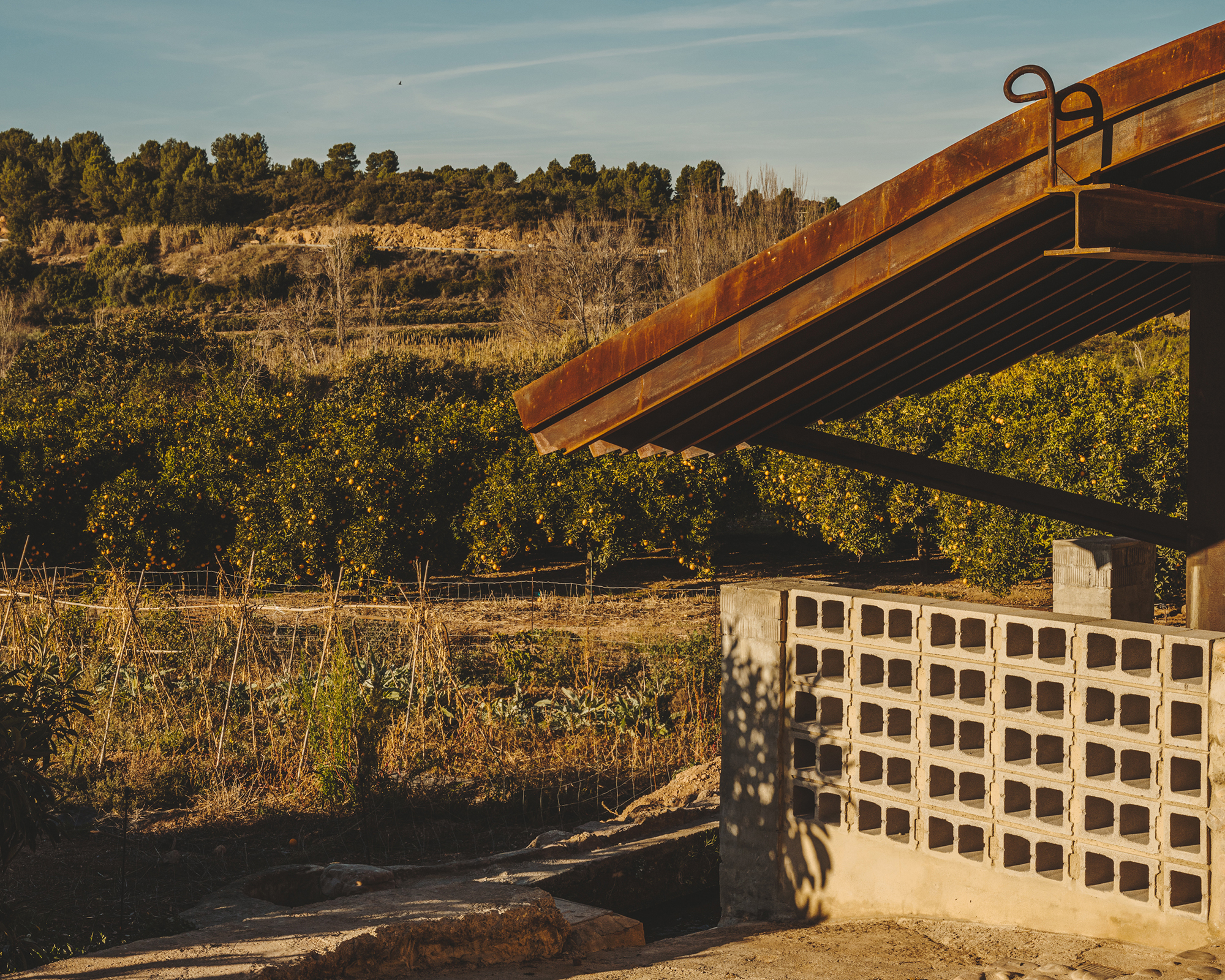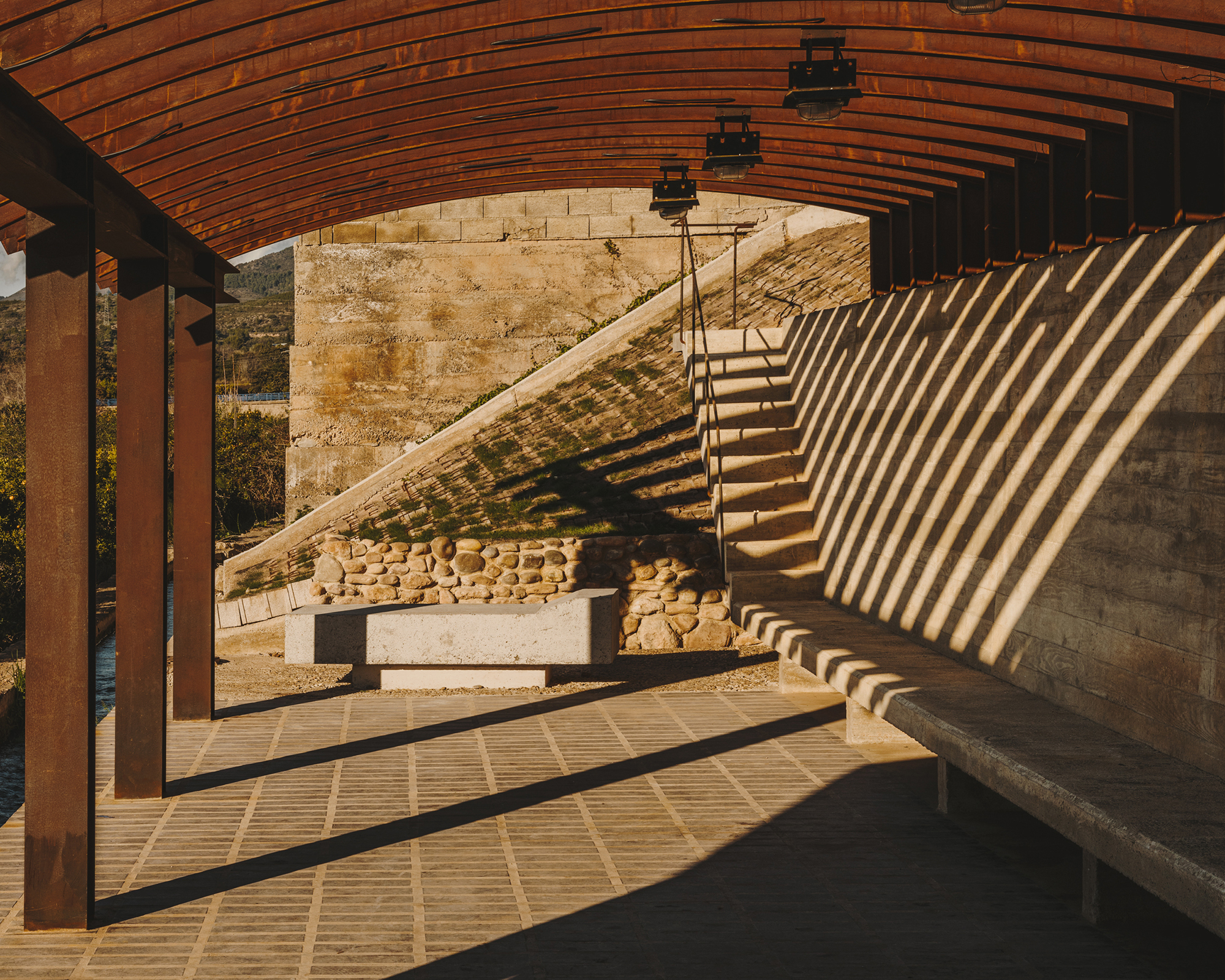 The concrete wall allows for a small plaza open to the fields and the trees that follow the stream of the river. One can sit on its edge and refresh their feet in the main irrigation ditch, as it always carries water.