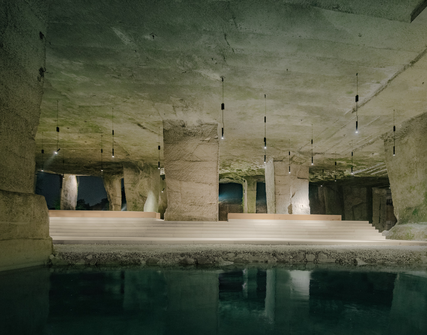 The caves are the result of 60 years of quarrying which left a cavernous space supported by irregular massive piers and largely filled with with water underneath a wooded hill in Zovencedo, near Vicenza. Upon entering the caves, it is possible to experience space, material and structure as one unique entity, where nature and architecture seem to imitate each other. Recognising these extraordinary qualities, the Morseletto family had often used the space for informal events, which encouraged them to develop a more permanent solution.