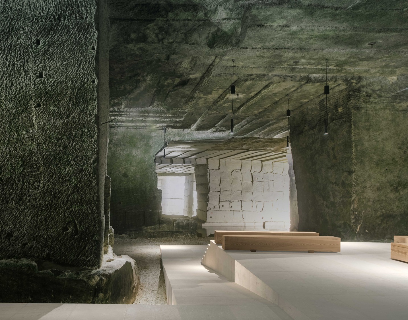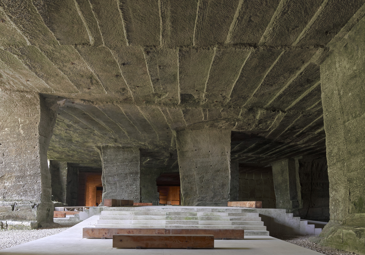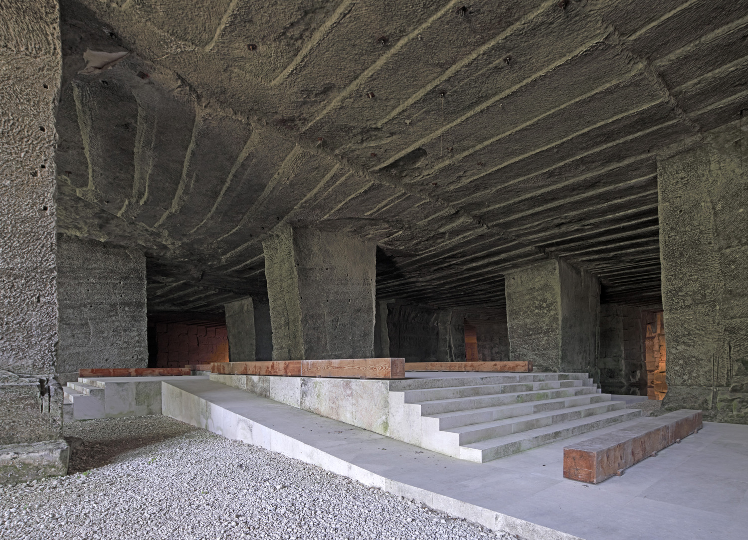 The romantic and tectonic qualities of the quarry with the carved stone and the filtered water were already so strong that minimal interventions were required. The project reintroduces the typical white Vicenza stone into the space with a series of platforms, steps and ramps, reminiscent of Adolphe Appia’s stage sets. The platforms are known as Cavea, a reference to the stepped tiers in ancient Roman theatres. The intervention has created a dialogue between the accidental architecture of the caves and the formalised stage and seating platforms that represent occupation and performance.