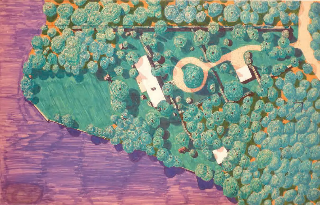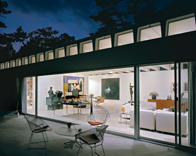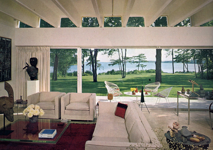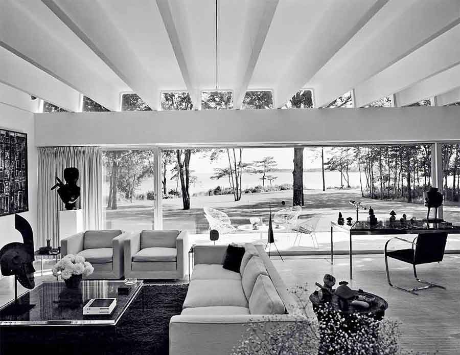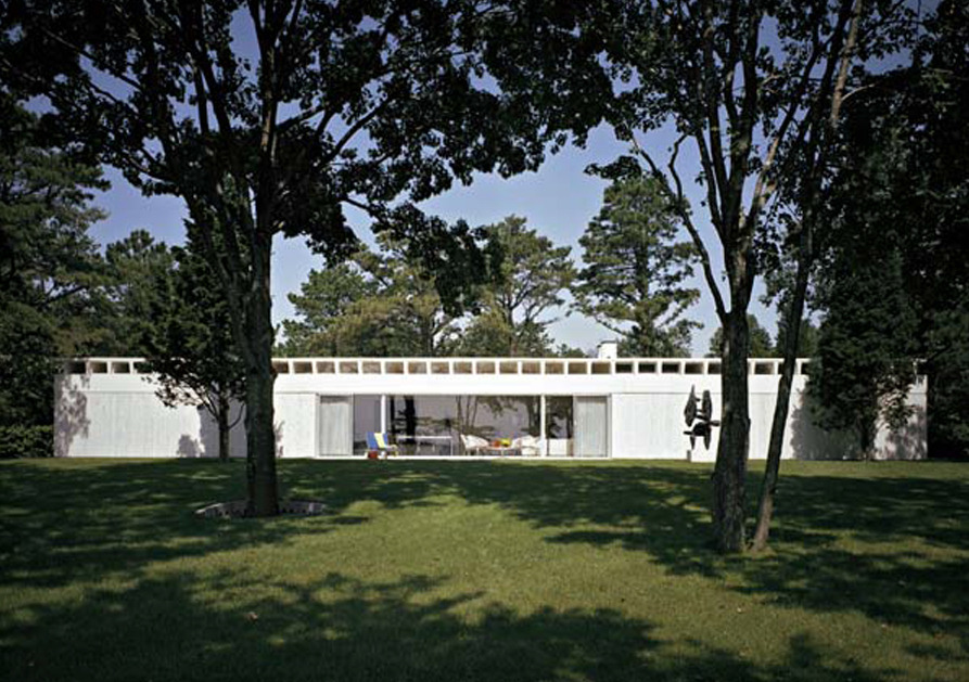 La estructura también actuó decisivamente en la integración física y visual de estos interiores con el exterior. Las jácenas, que ejercieron en relación a las fachadas lo que las losas del forjado ejercieron en relación a la planta, se colocaban en toda la extensión longitudinal del edificio, posibilitando al arquitecto suprimir los tramos de muro exterior que interesaban. De esa manera tanto los dormitorios como la sala de estar se abrían al espacio abierto circundante – césped, los árboles y el lago Georgica. En entrevista a Betty J. Blum, Bunshaft afirmaba que “En East Hampton, las personas creen que el frente de nuestra casa es el lugar de donde se debe apreciarla. Esa es una pared en blanco en nuestra casa. Por el otro lado todo es cristal con vistas a un estanque y un gran césped. Lo llaman de ‘fondos’”.