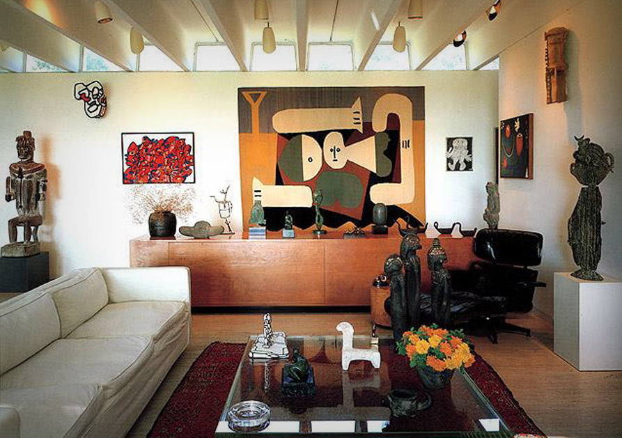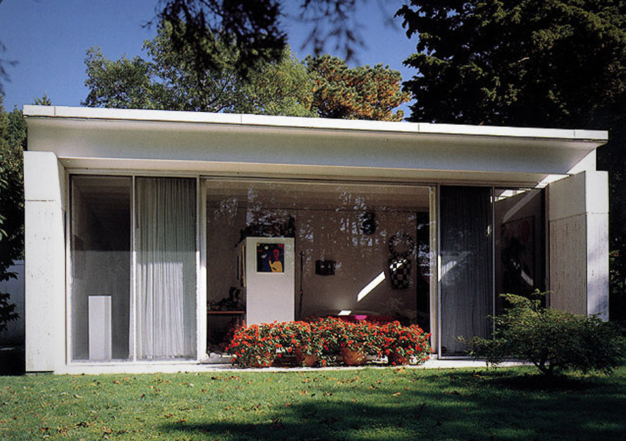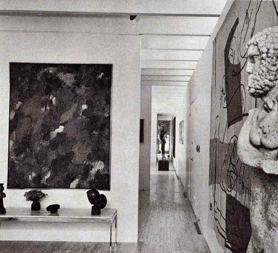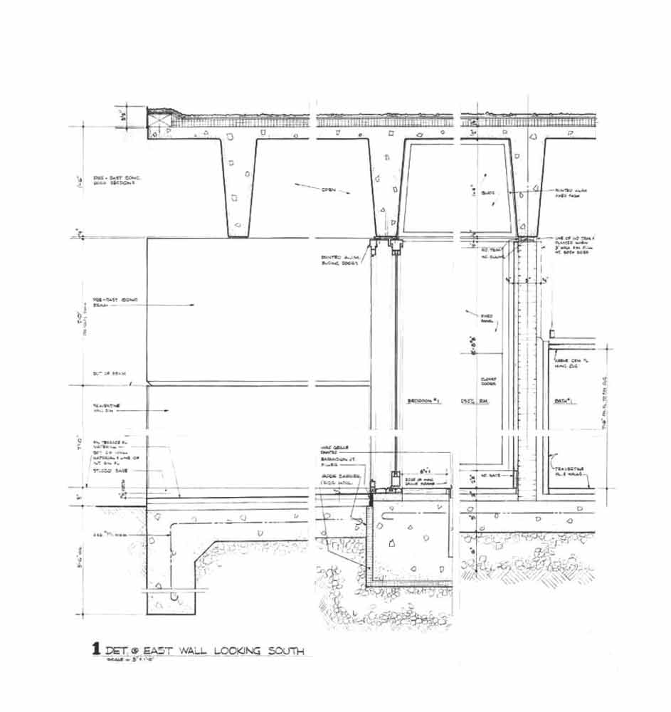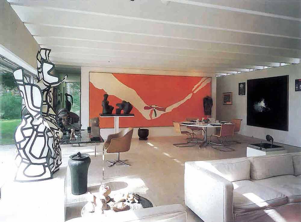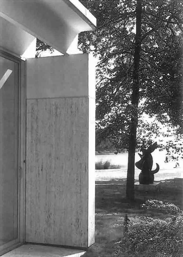 Las placas de travertino que cubrían las caras exteriores de los muros estructurales seguían la misma regla. Los tramos de esos muros y las aperturas al exterior fueron alternados, no dejando que los primeros tuvieran larguras iguales. Así, las fachadas largas de la casa eran asimétricas, pero de ninguna manera desequilibradas. La unidad del volumen era dada por los elementos principales: las jácenas y el forjado de cubierta. Los elementos estructurales eran enseñados de manera franca, con todas sus dimensiones a la muestra. Los huecos llegaban hasta las caras inferiores de las jácenas, evidenciando la independencia entre los diferentes tramos de muros exteriores, que son visualmente percibidos como planos. Una de las demostraciones de la utilización de ese criterio puede ser vista en las dos diferentes maneras que Bunshaft recubrió los muros exteriores de la casa. La cara exterior, como acaba de ser explicado, enseña el muro – recubriéndolo con travertino – como “plano” estructural que sostiene la jácena y la cubierta. Ya en la cara interior del mismo muro Bunshaft cubre con yeso toda la superficie vertical disponible, o sea, el muro de bloques propiamente dicho y también la jácena estructural. Este gesto tiene justificativa en el hecho de que los Bunshaft eran coleccionadores de obras de arte, y querían tener lo máximo de superficie libre para su colocación en el interior de la vivienda. De tiempos en tiempos las obras de su apartamento en Manhattan eran intercambiadas con las de la residencia en East Hampton. Los muros internos blancos, pavimentos internos y externos en mármol travertino dotaban el espacio de una sobriedad que no permitía que las muchas obras de arte entrasen en conflicto. Otro aspecto que hizo con que la armonía espacial fuera alcanzada era la ausencia de puertas en casi todos los ambientes. La economía de elementos en el interior fue decisiva: salvo las obras, los únicos elementos percibidos por el ojo son las losas de la cubierta, los tabiques blancos – concebidos como planos elementales – y el piso de travertino. Los elementos estructurales de la casa – los muros y el forjado superior – desempeñaban también la función de configurar planos de fondo exentos. Esta condición fue alcanzada en el caso del forjado mediante la repetición de sus nervios a lo largo del espacio, y en el caso de los muros mediante la separación visual en relación a los demás elementos. Así eran percibidos como planos independientes dentro de la casa.