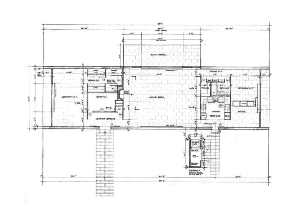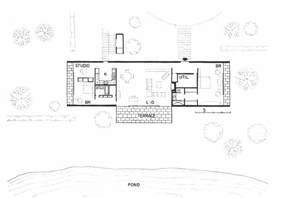 Esta configuración generó algunas interesantes posibilidades de proyecto. El centro de la planta podría ser totalmente liberado, ya que los apoyos verticales eran los muros periféricos laterales. La ausencia de apoyos verticales internos fue posible por la adopción de las losas π para formación de la cubierta. Bunshaft dispuso los dos espacios íntimos en las extremidades, y el espacio principal de la casa – la sala de estar – en el centro de la planta. Entre medio de estos tres espacios habían núcleos de servicio, con baños, cocina, depósitos y sala de máquinas de aire acondicionado. En el lado Este se encontraba el dormitorio de Nina y Gordon. En el Oeste estaba la habitación para huéspedes y un recinto contiguo utilizado como taller de pintura por Nina.