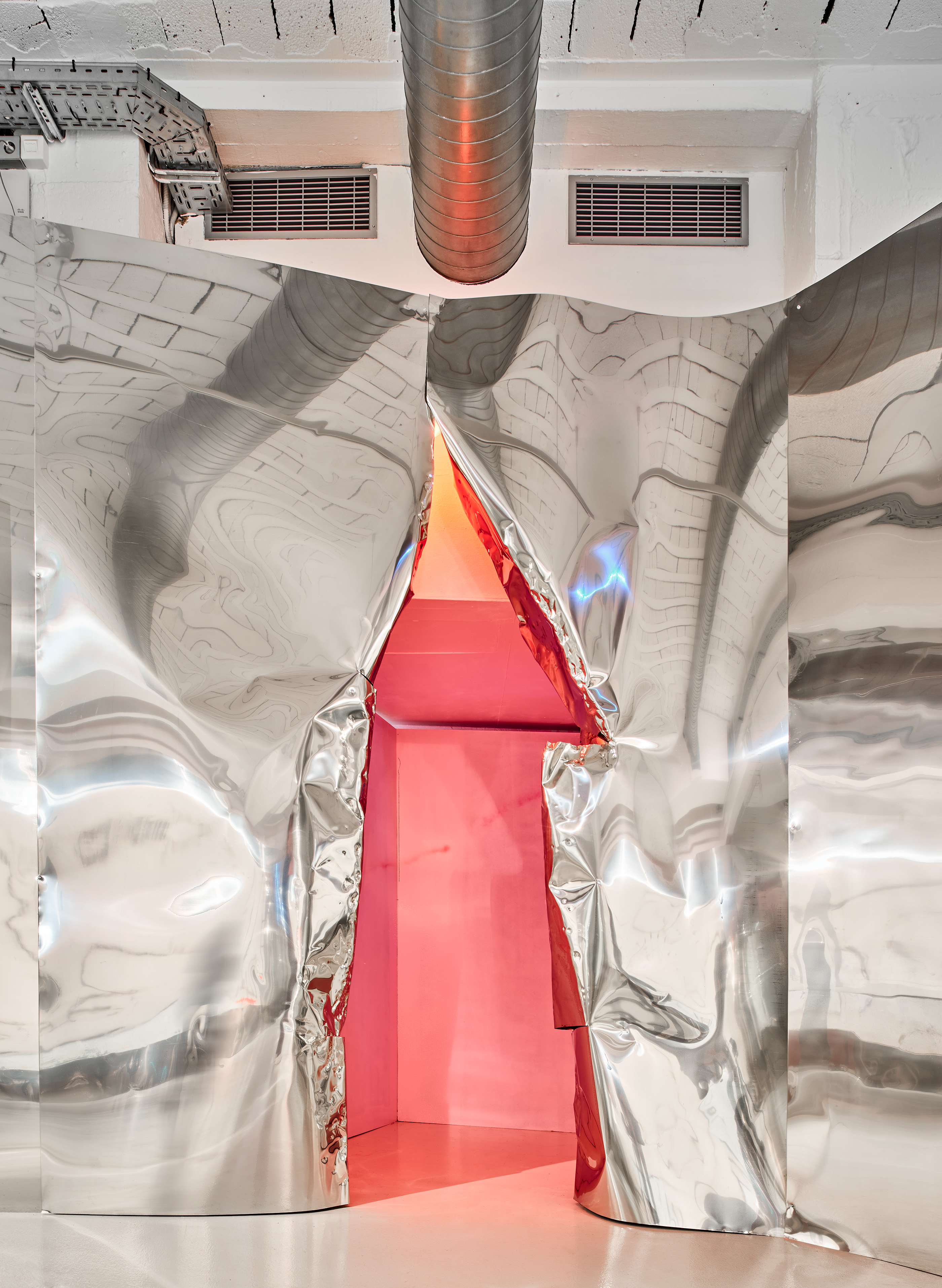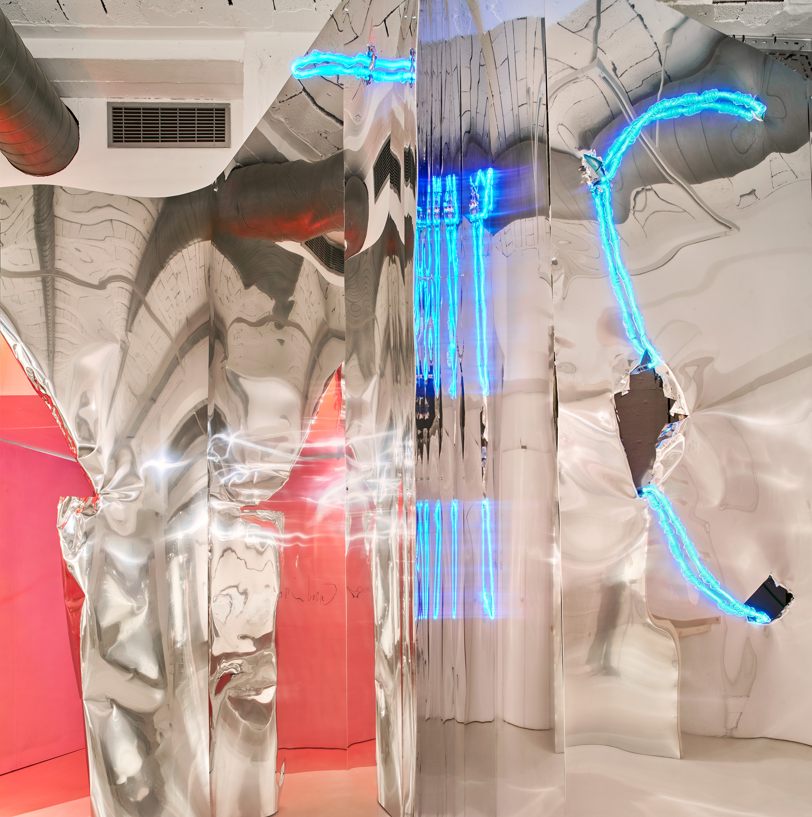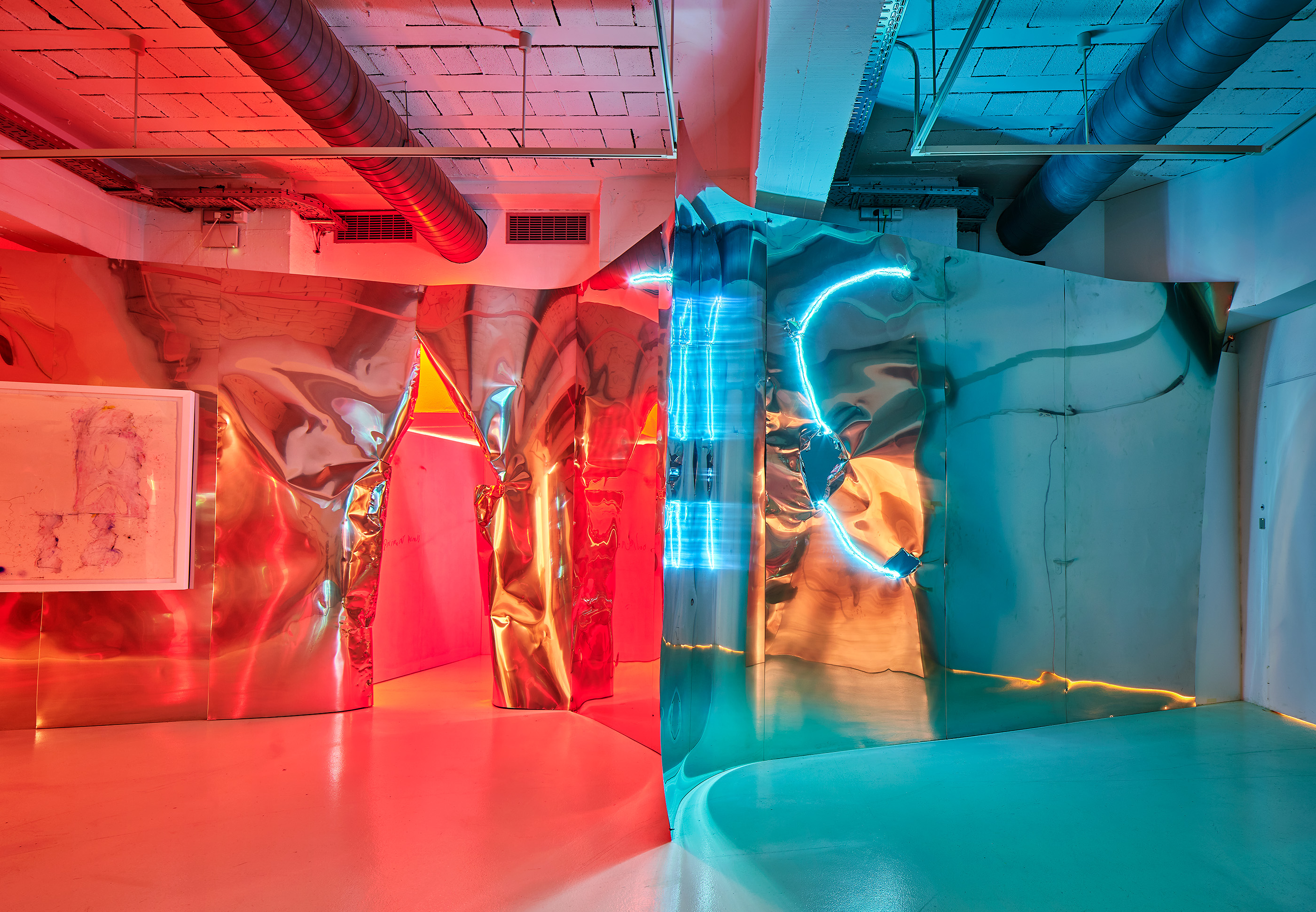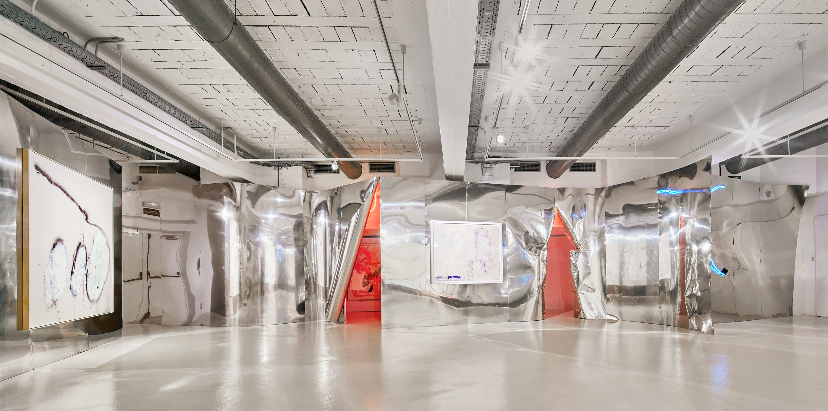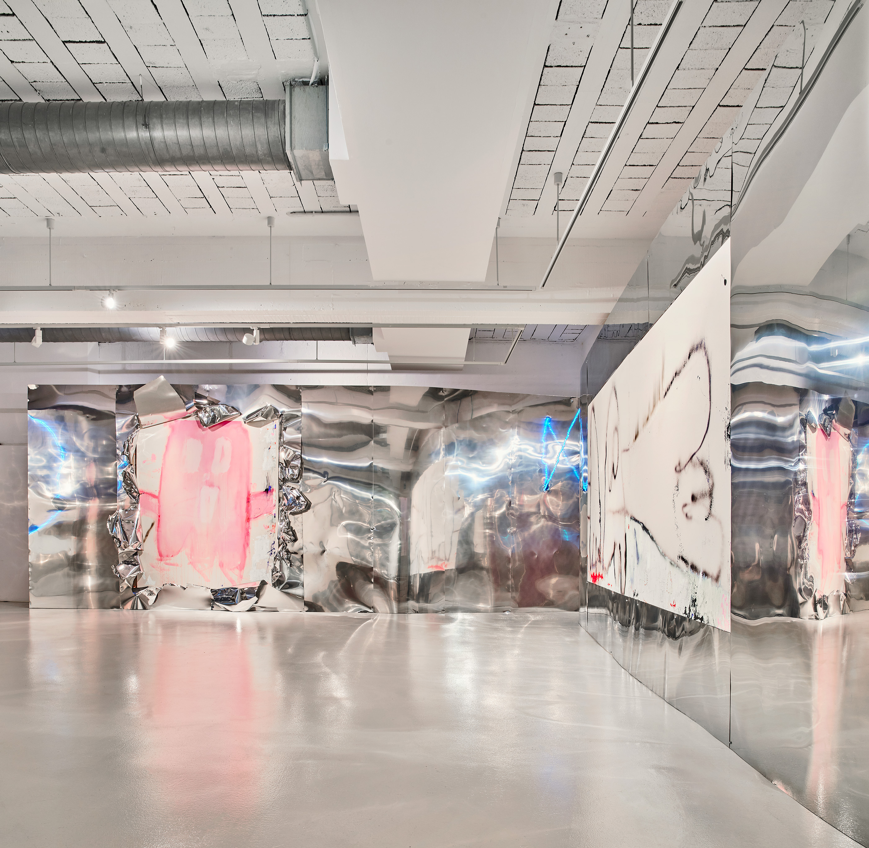Mediante sábanas de acero inoxidable desplegadas por toda la sala, no sólo se ligan físicamente las obras entre ellas, sino que emergen cacofonías, disoluciones y reflexiones de unos diálogos pictóricos crudos, a veces ásperos y cantos pero del todo cautivadores y desgarradores.