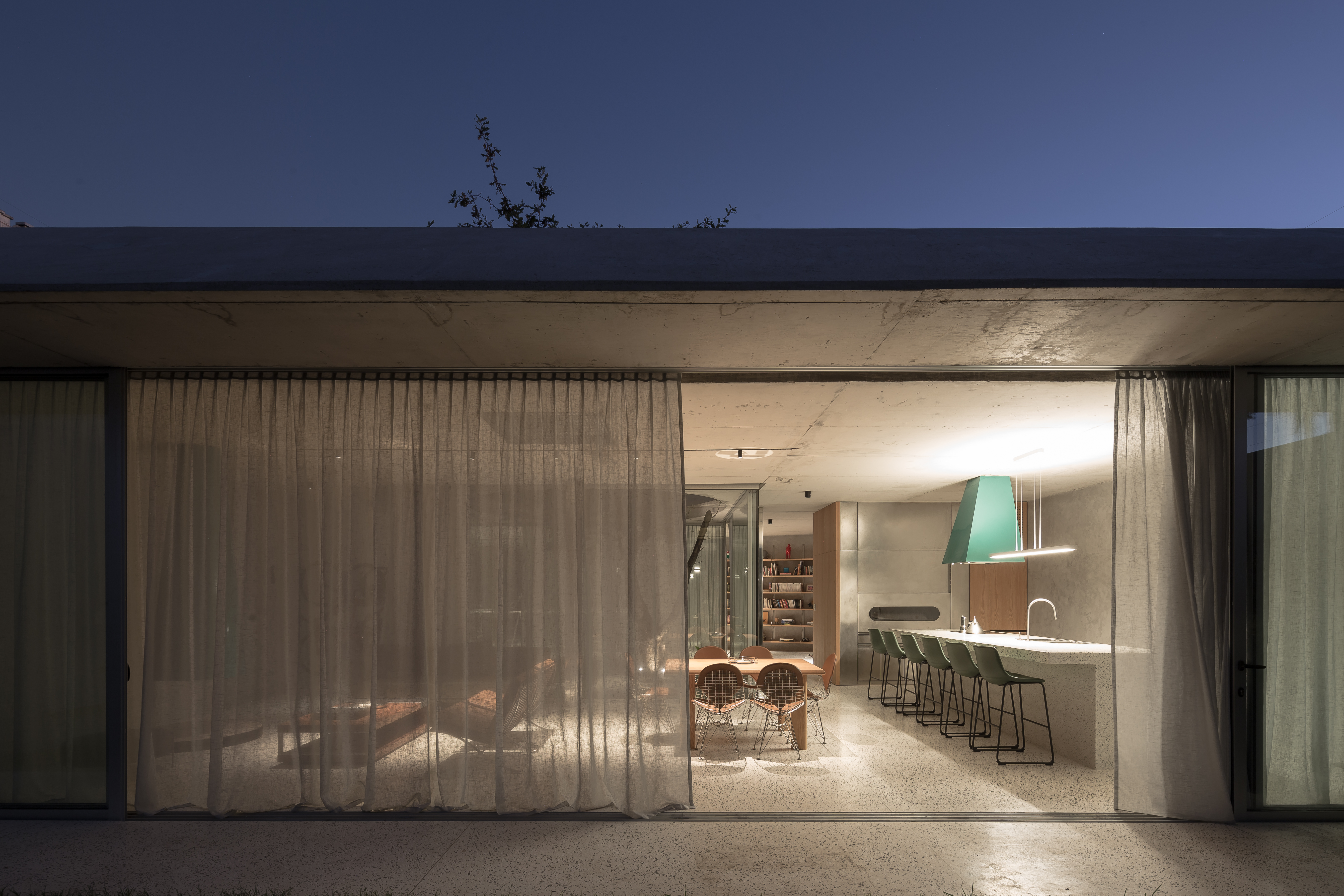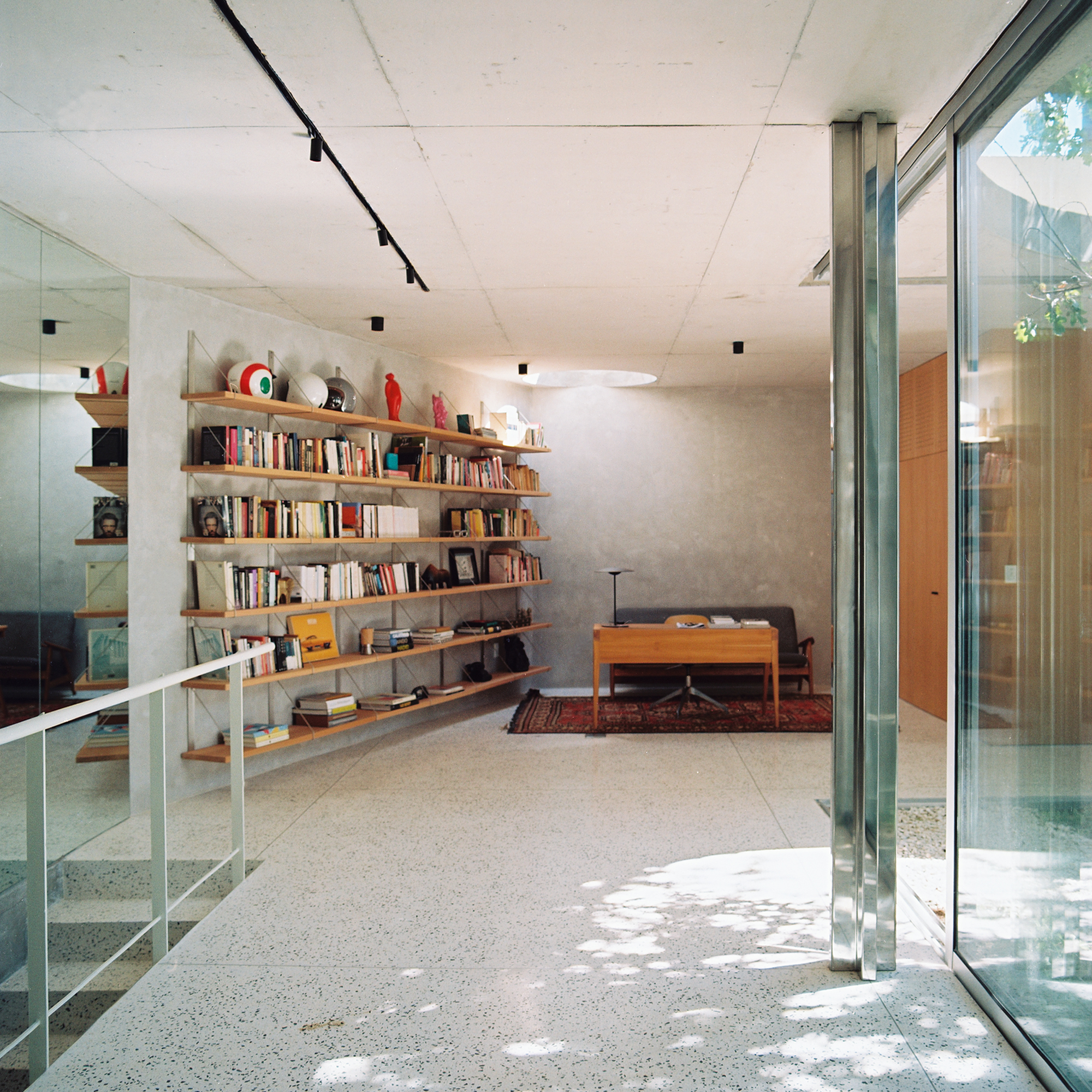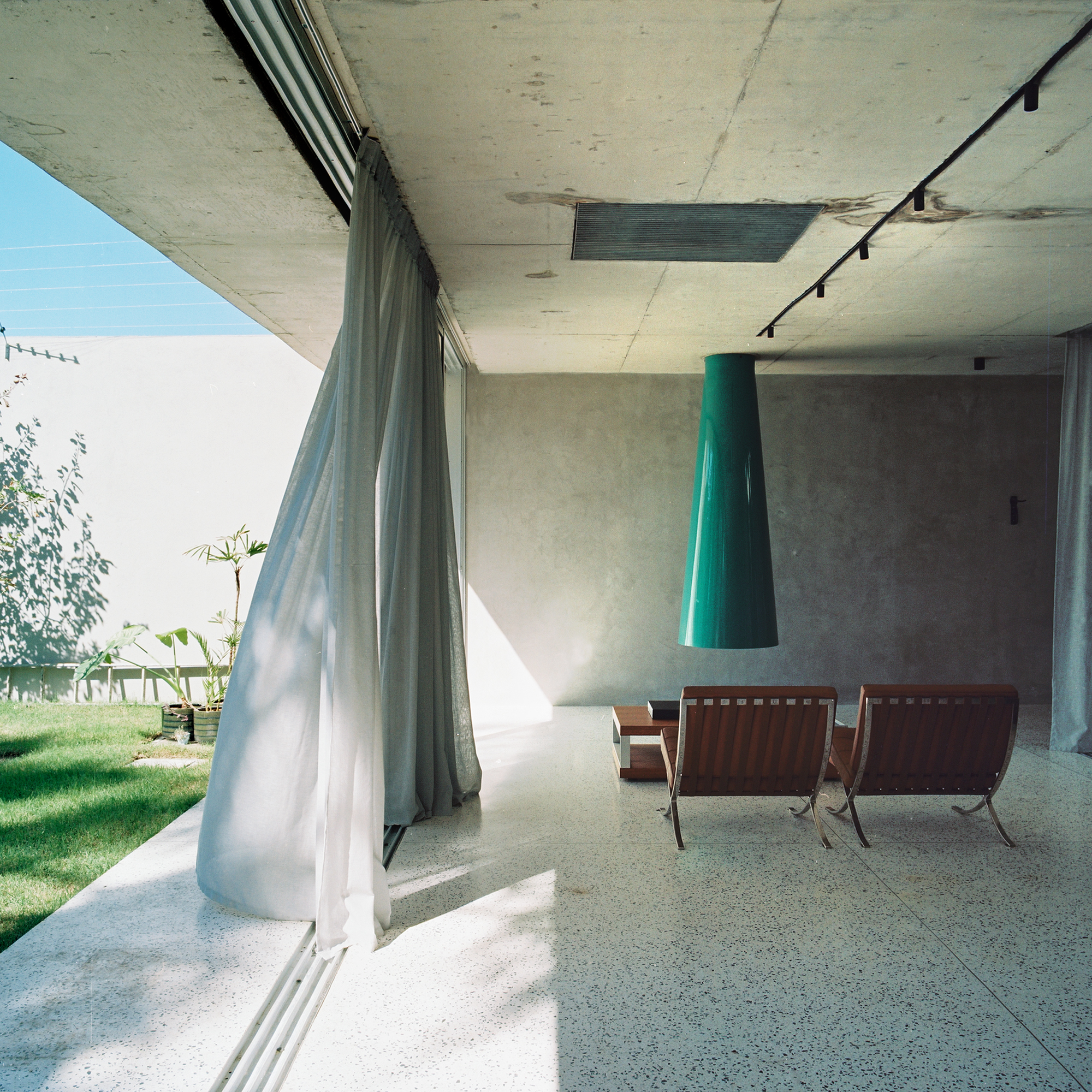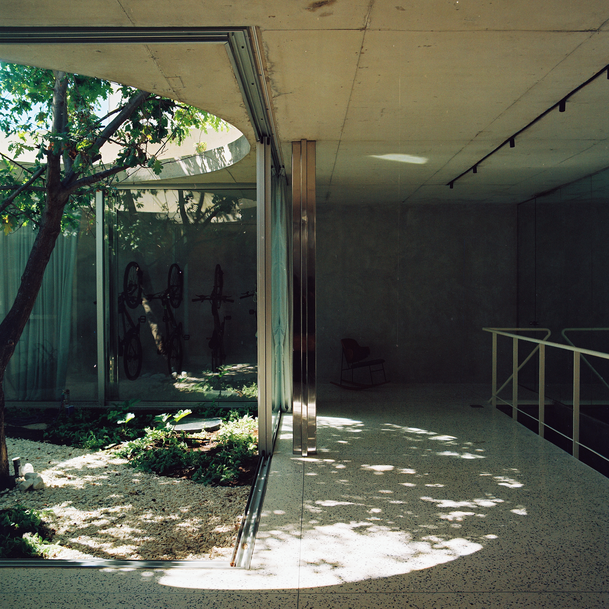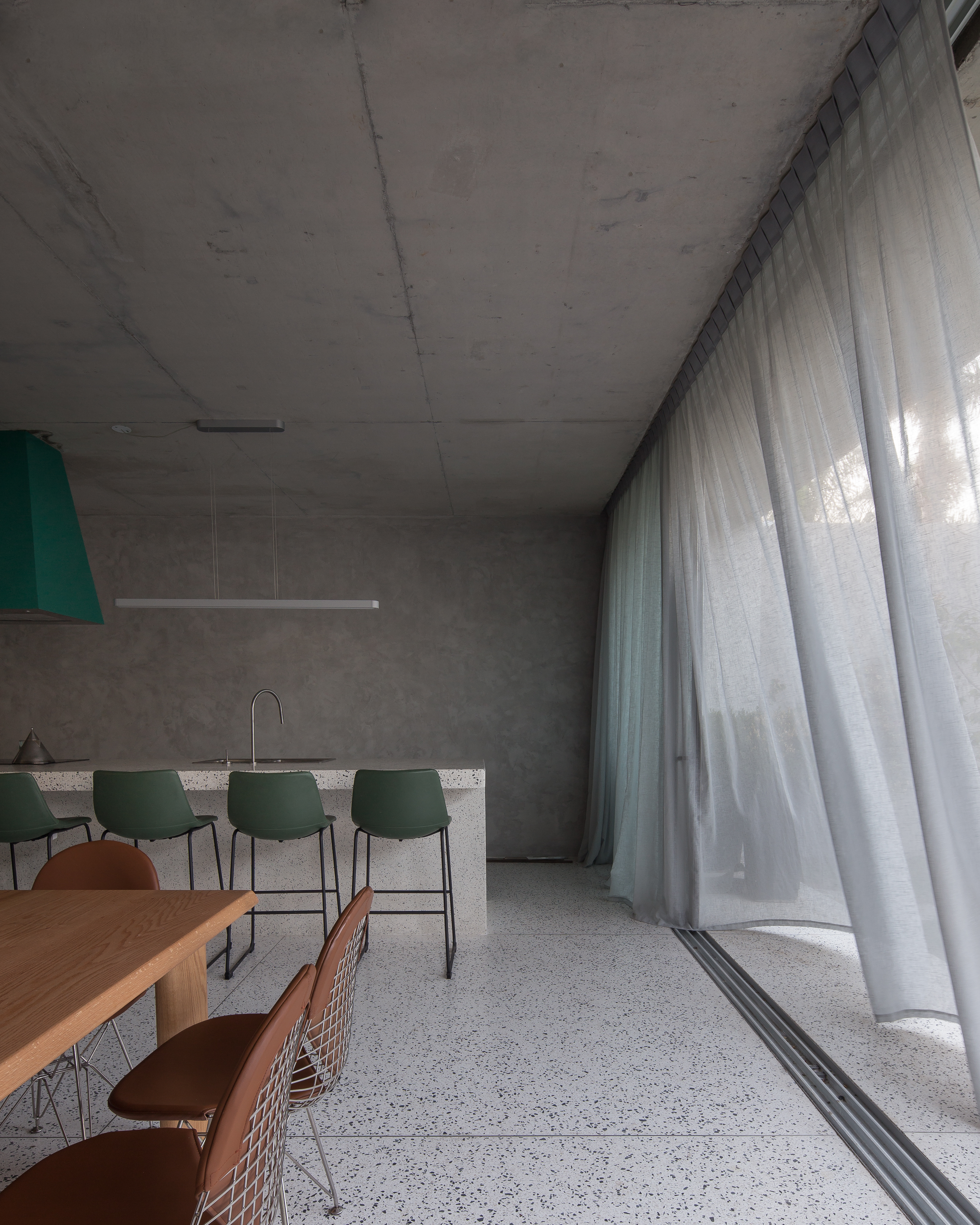 Walls and ceilings of concrete, polished monolithic floors, define a monomaterial and neutral condition of space. As a counterpoint, color is introduced as singular green elements that talk with the enclosed nature. The green is taken from Le Corbusier’s Pantone. A sequence of reflections on the polished surfaces aims to psych out the relationship between the inside and the outside.