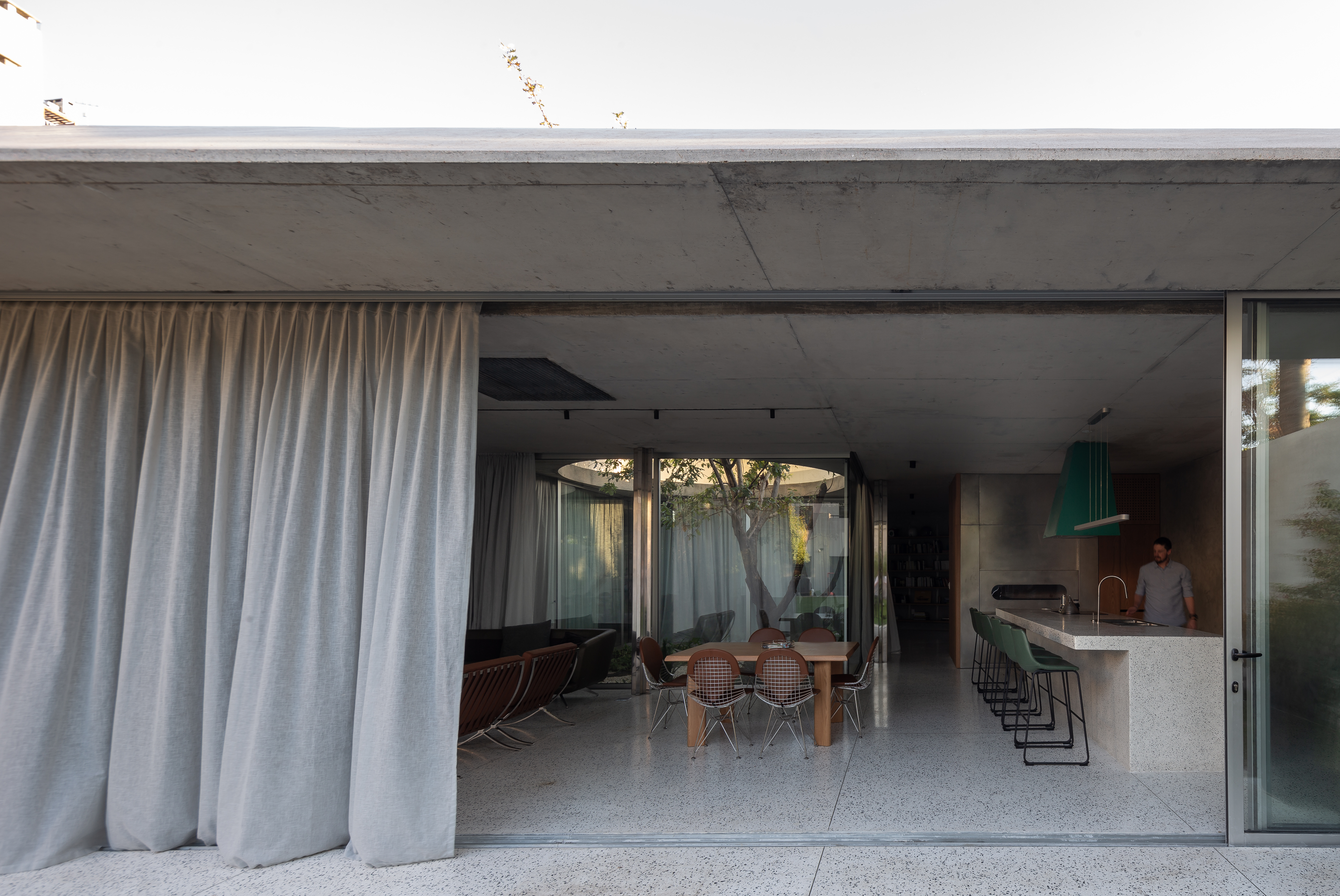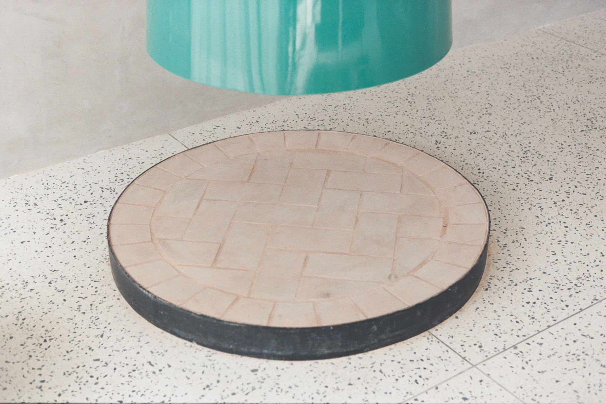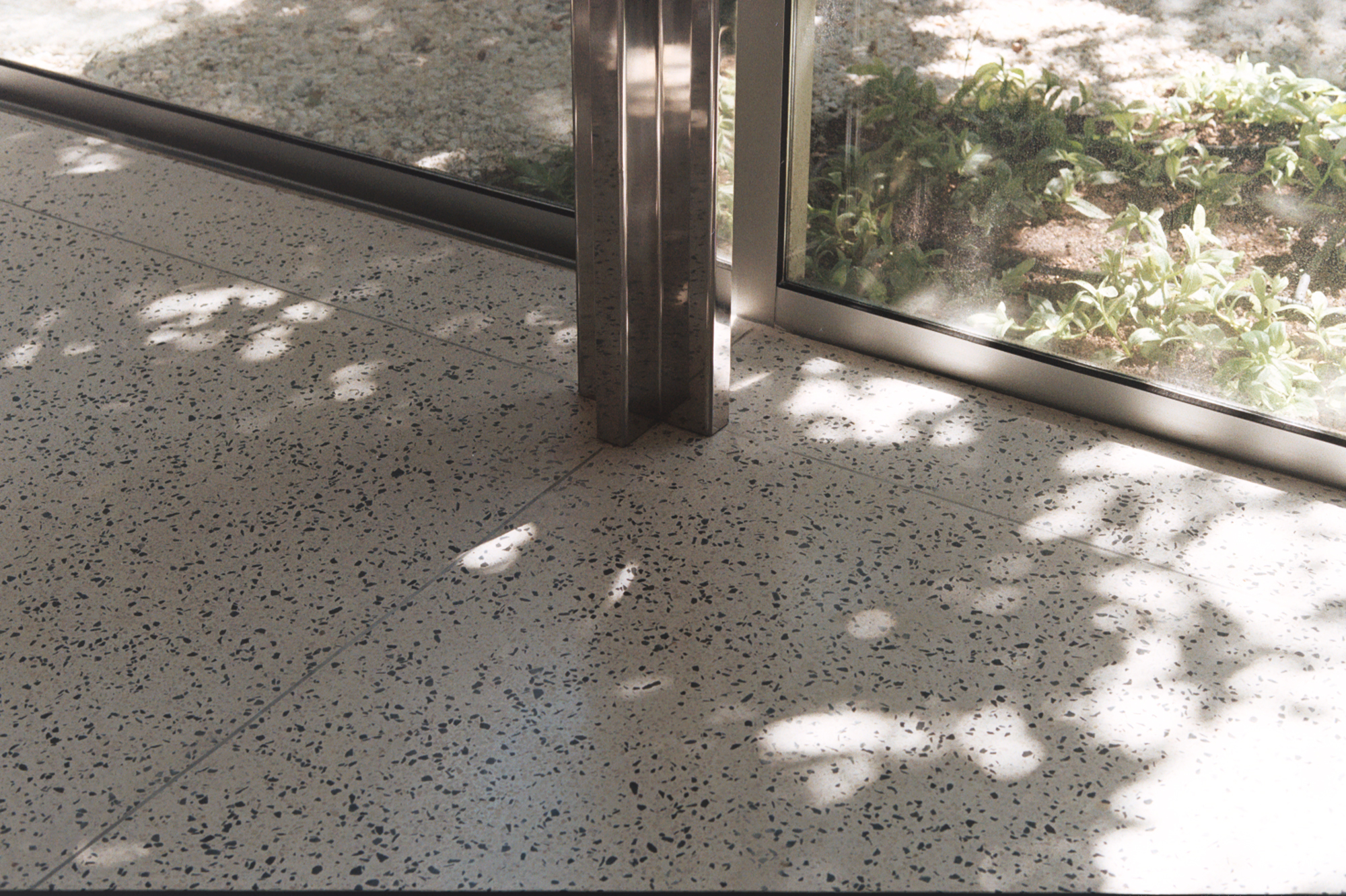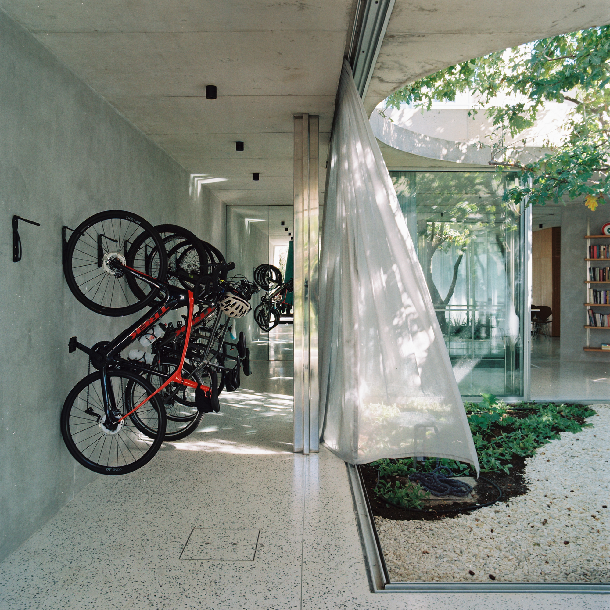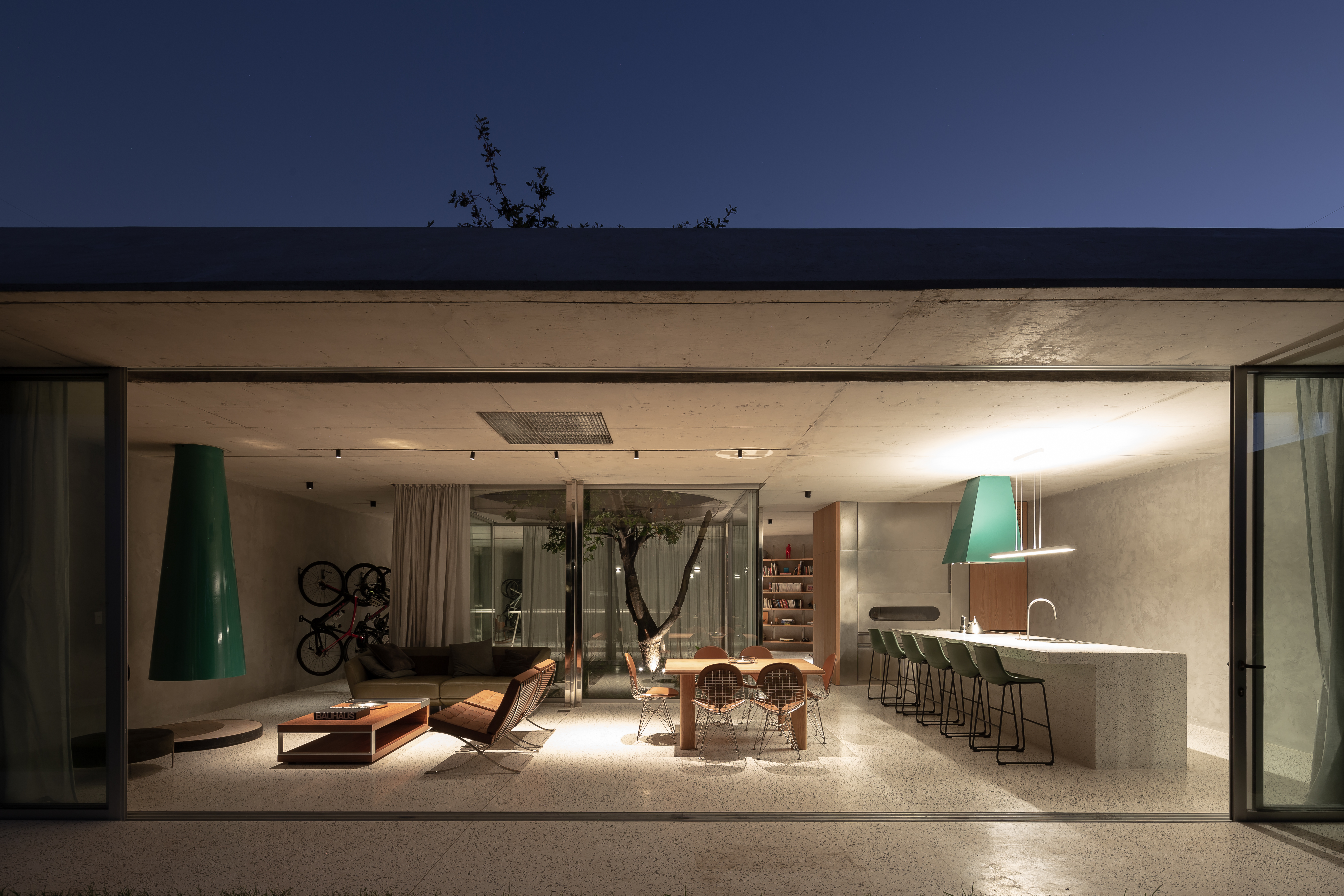 Walls and ceilings of concrete, polished monolithic floors, define a monomaterial and neutral condition of space. As a counterpoint, color is introduced as singular green elements that talk with the enclosed nature. The green is taken from Le Corbusier’s Pantone. A sequence of reflections on the polished surfaces aims to psych out the relationship between the inside and the outside.