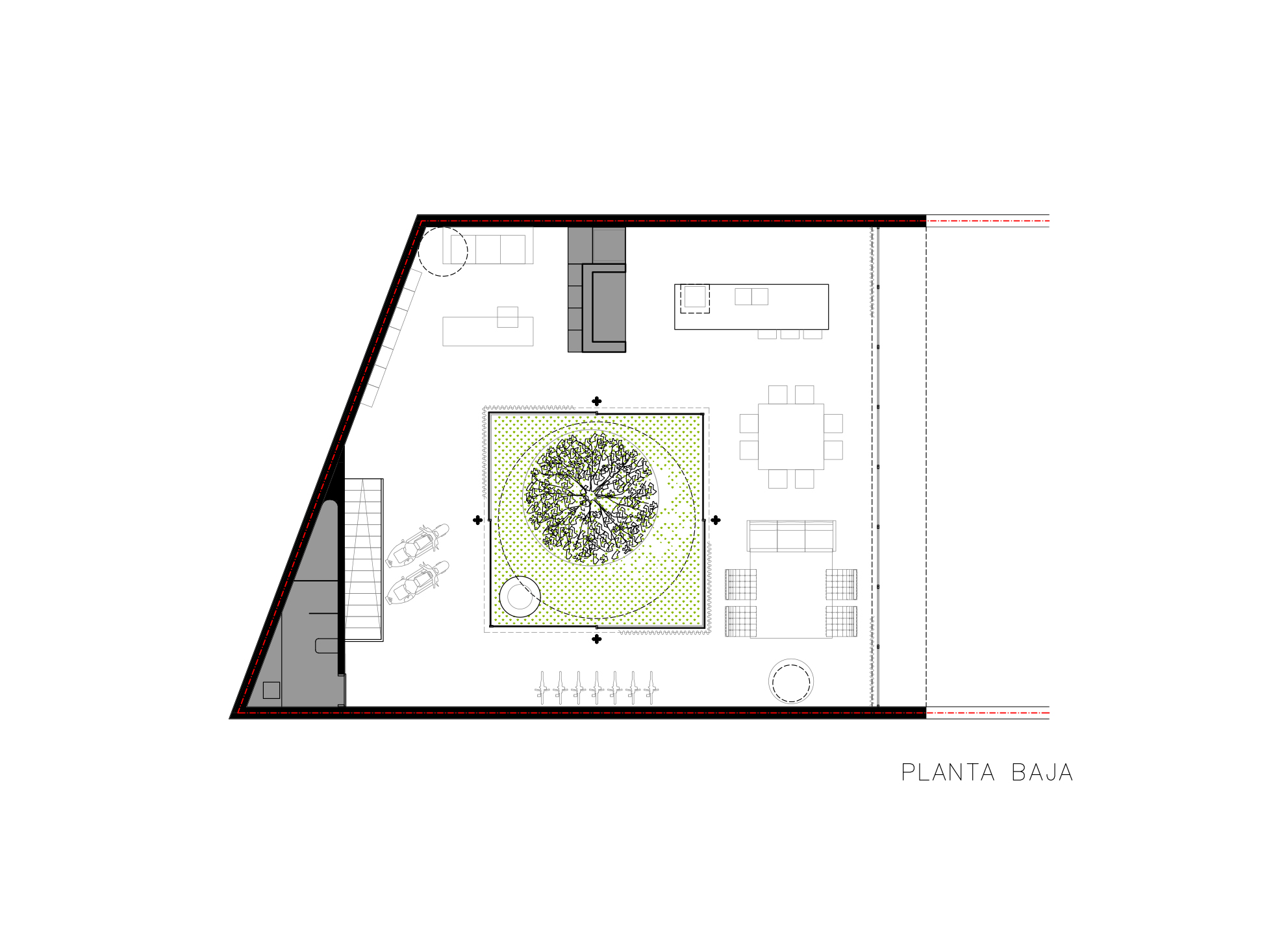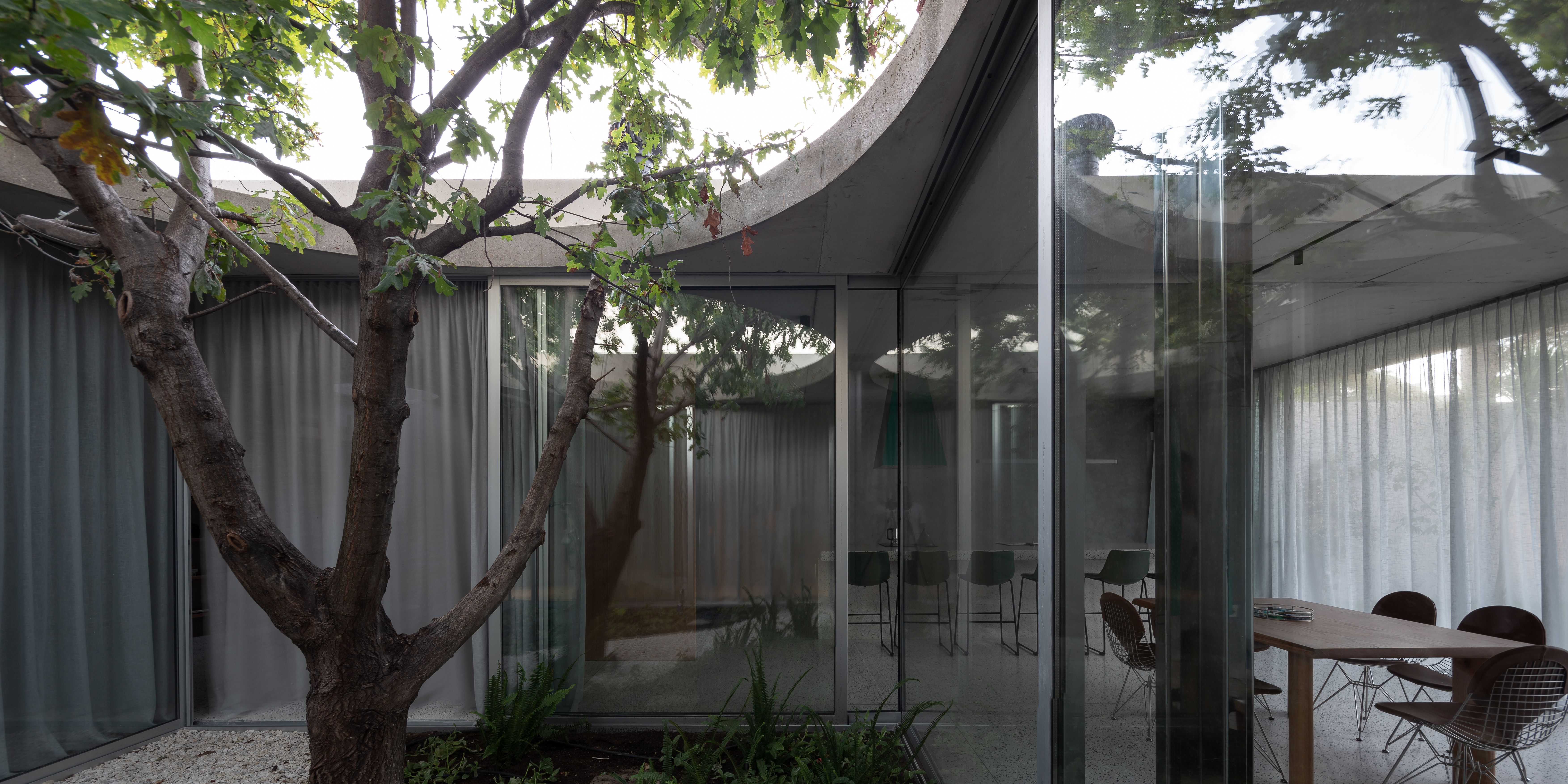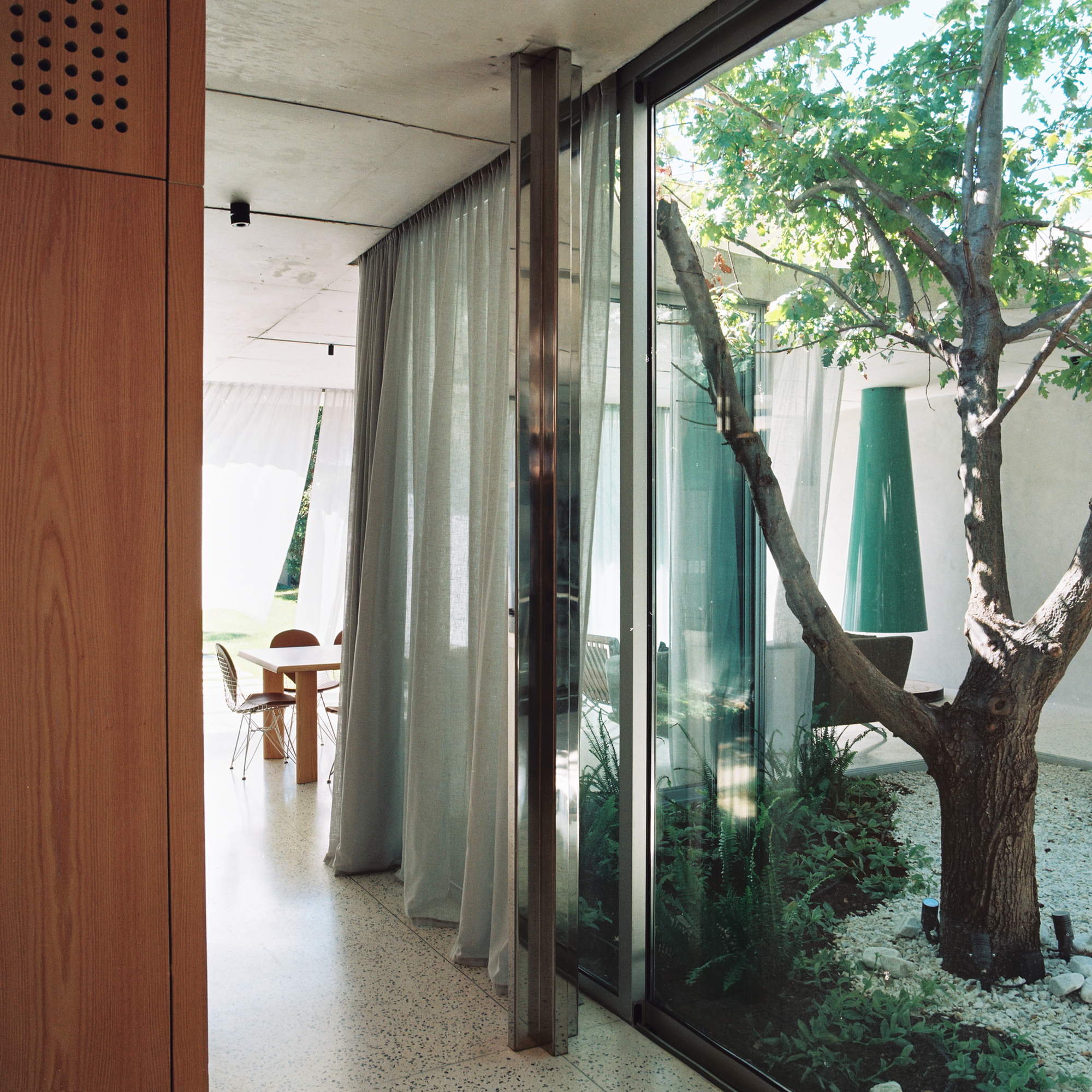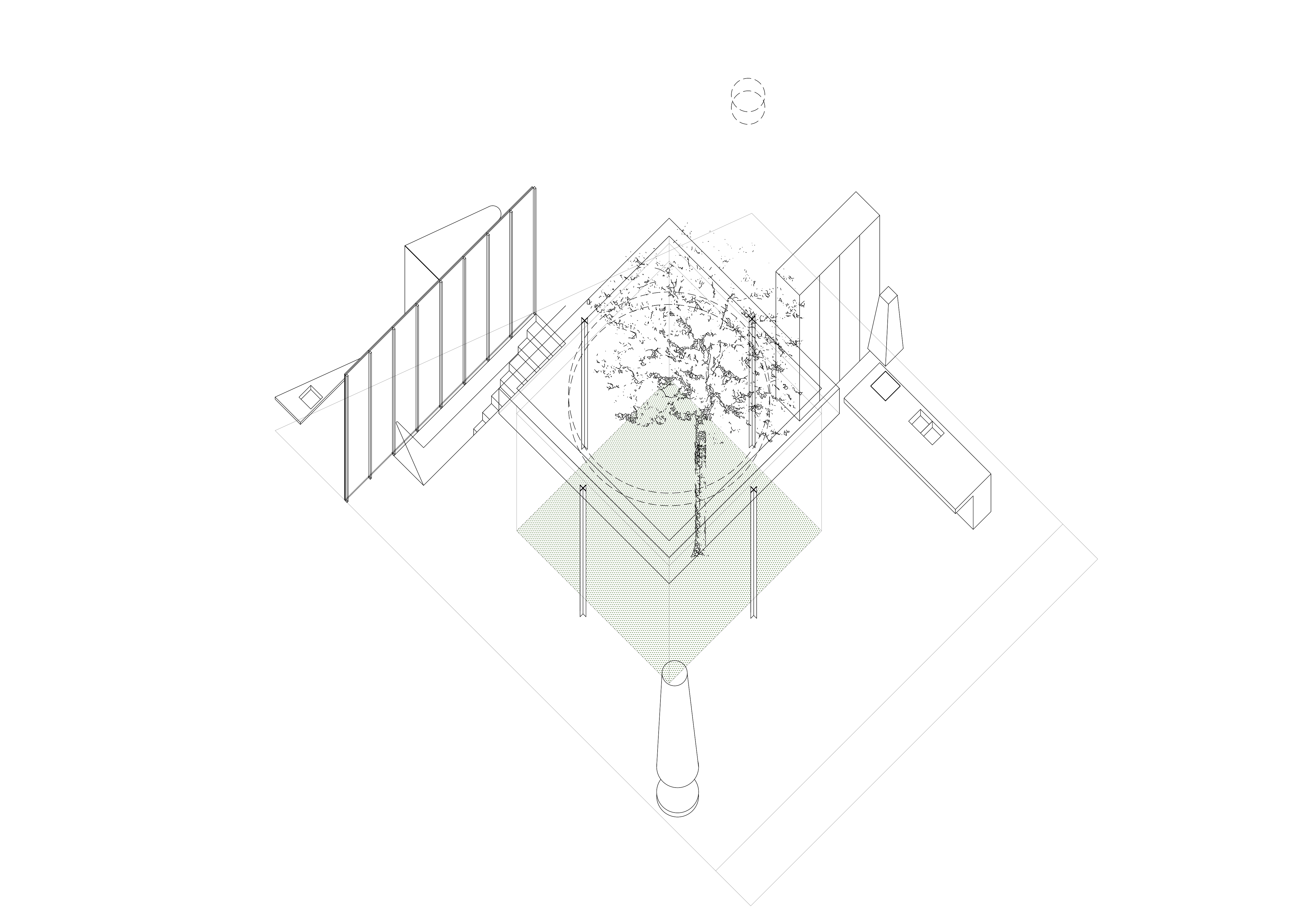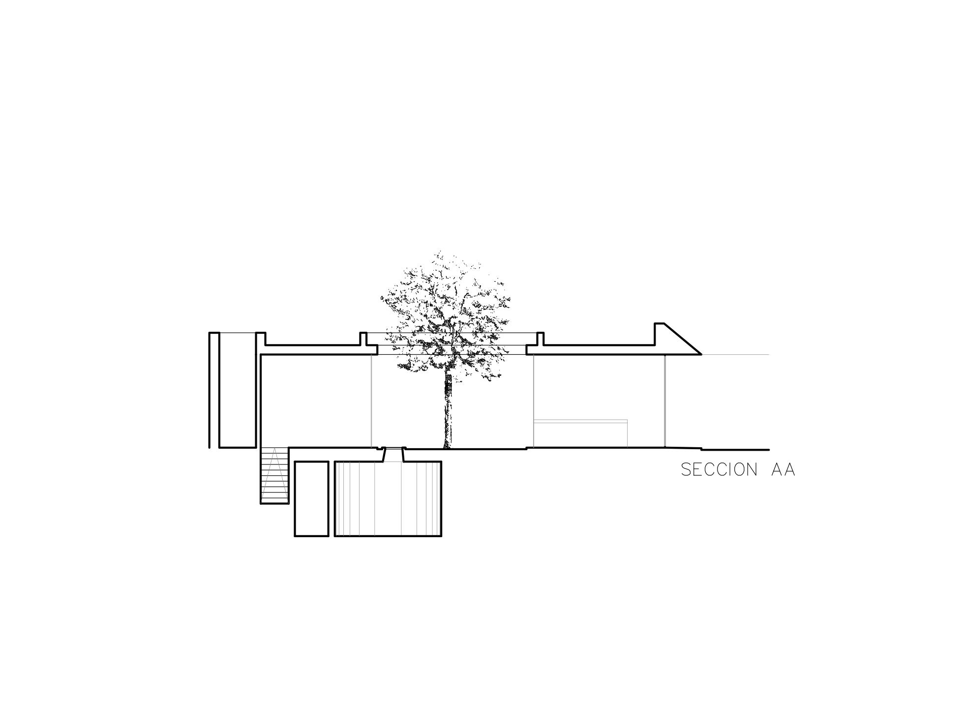 Everything revolves around a square-like patio that engulfs an existing oak tree. The patio serves as the rotatory center in which different elements are laid, drawing the activities and spaces. Inverting the square-circle relation of the Mantegna house, the square shape layout of the patio is framed by the circle opening towards the sky. The square emerges again on the roof defined by the beams that support it. In the middle of each side, square cruciform pillars, the same ones Mies will use in his Barcelona’s Pavilion, direct the loads towards the floor.