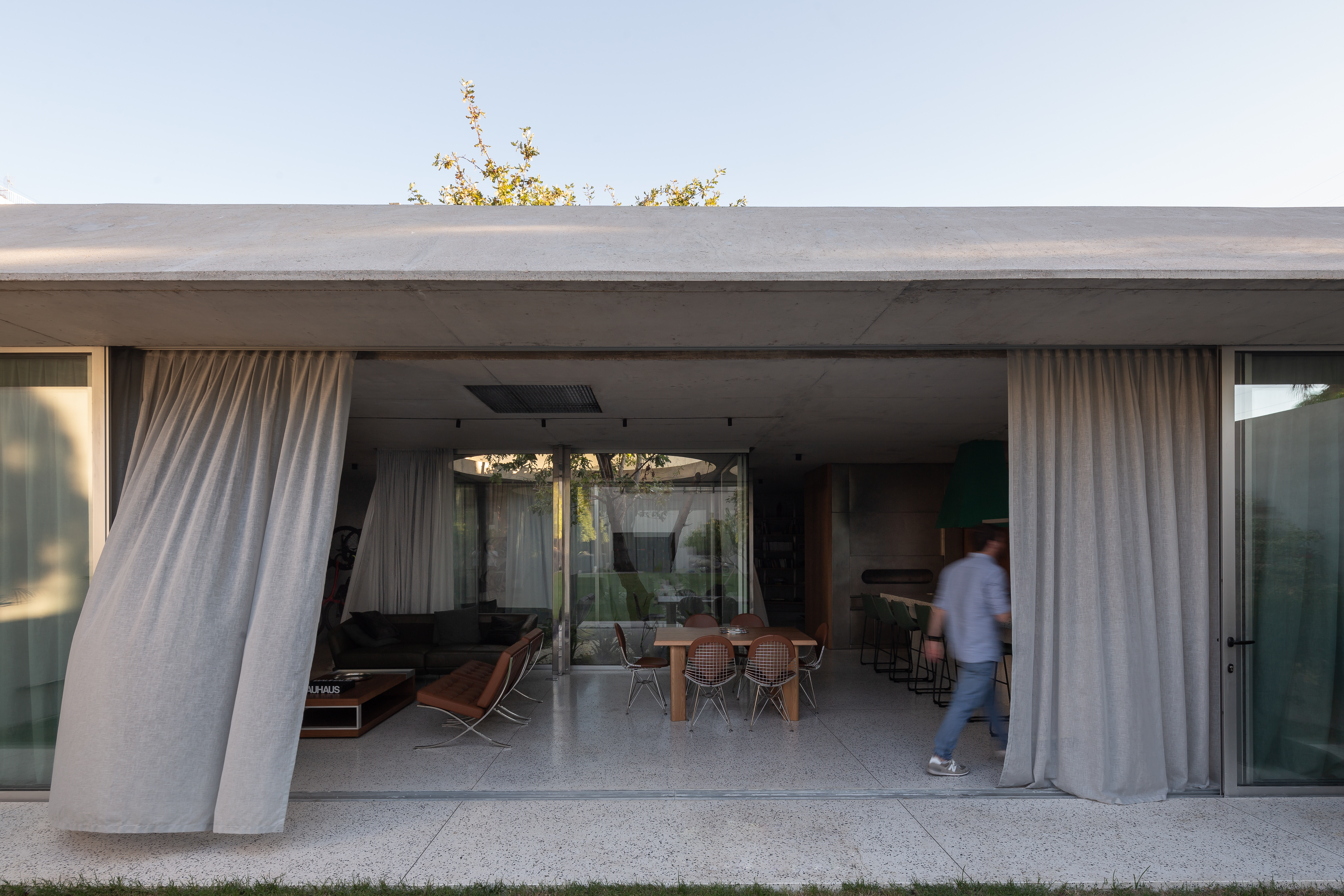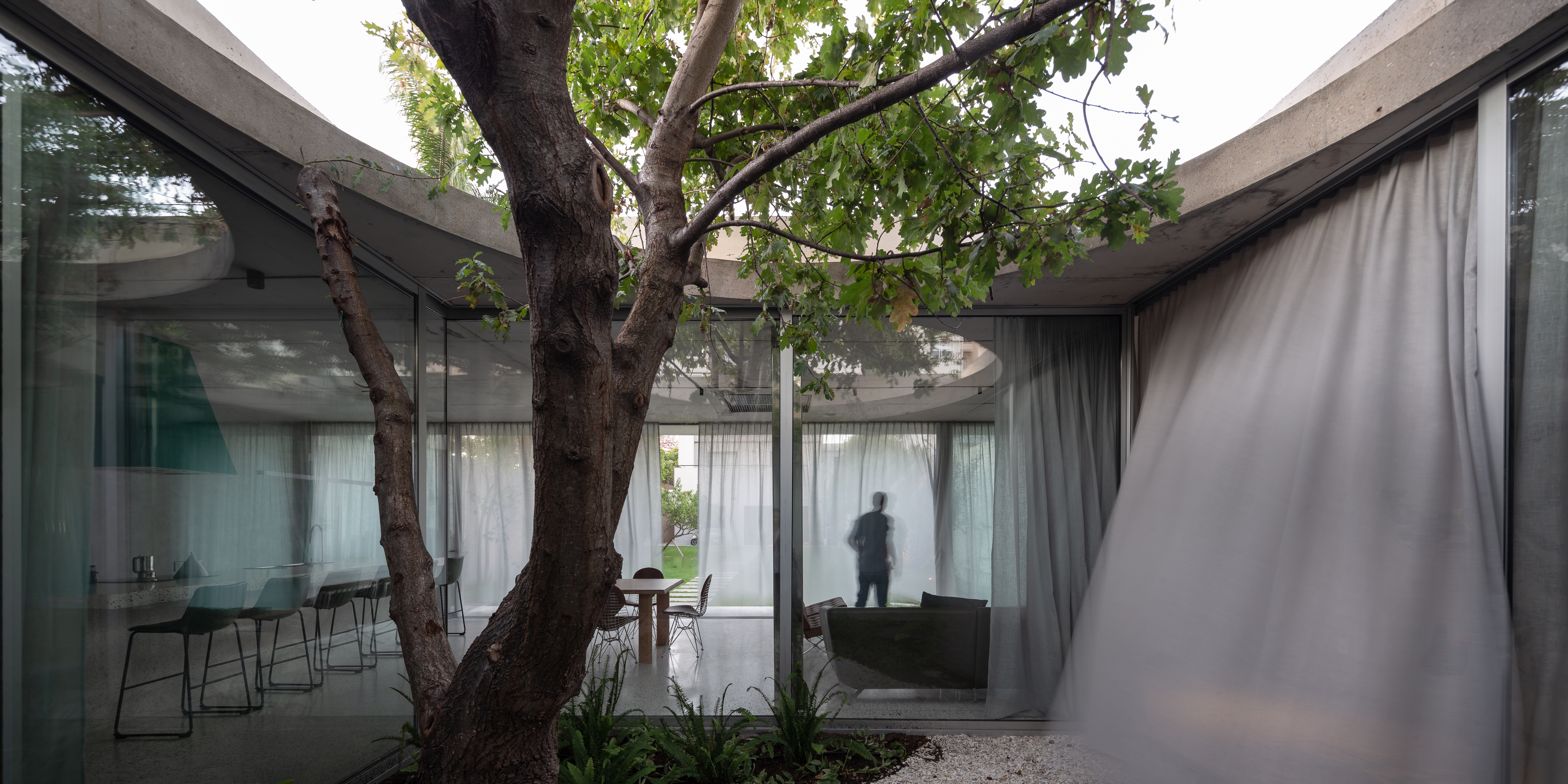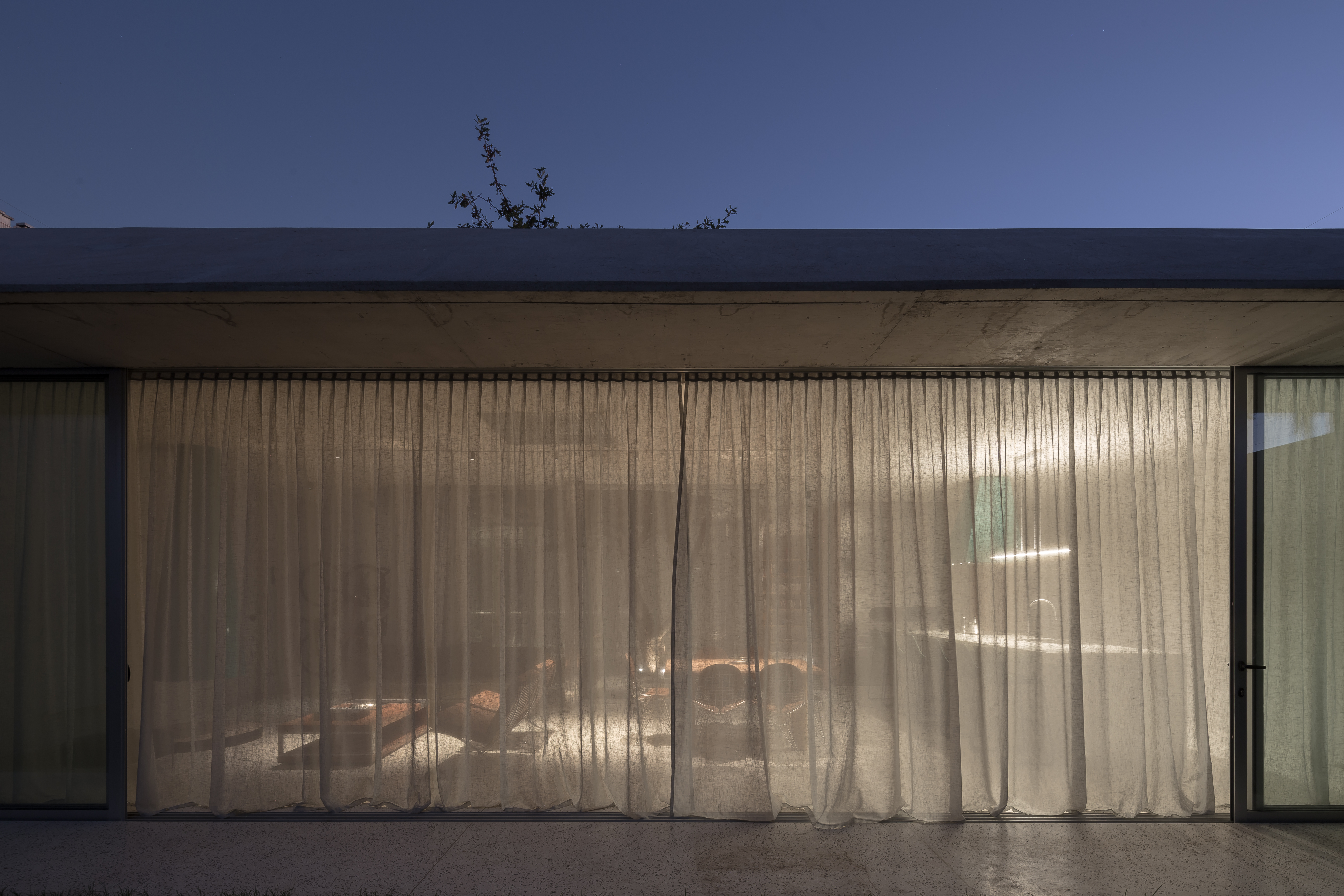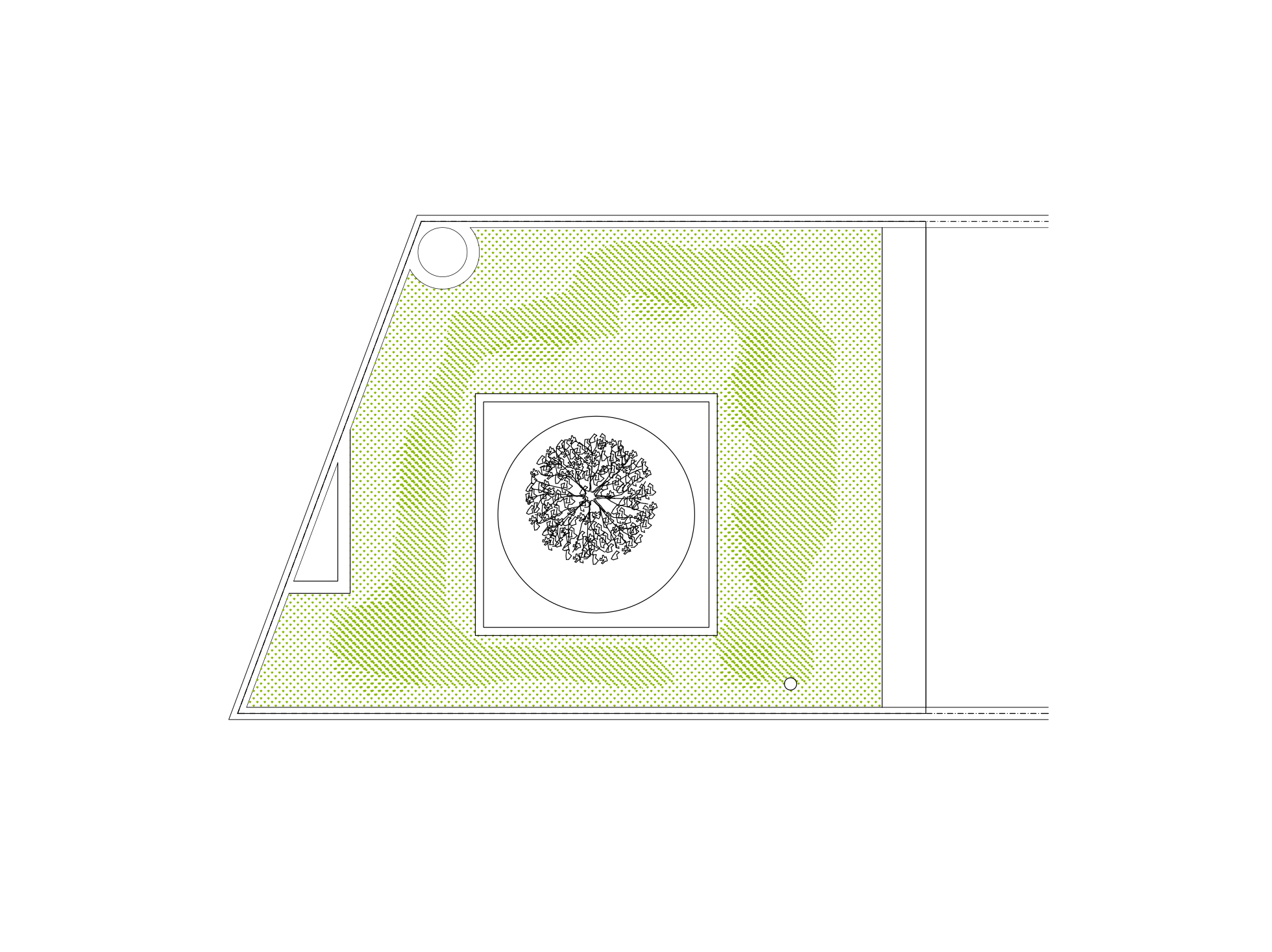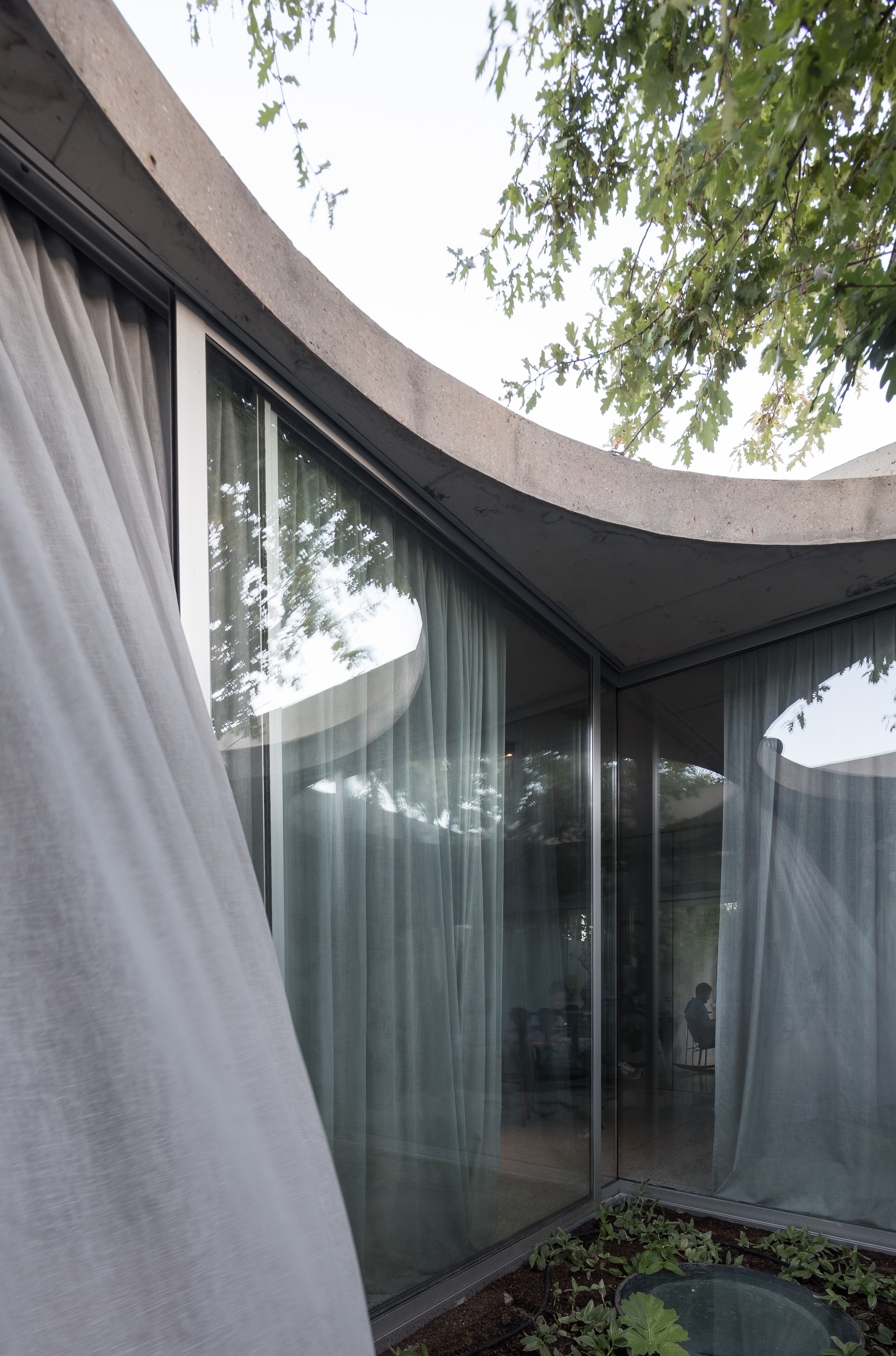Everything revolves around a square-like patio that engulfs an existing oak tree. The patio serves as the rotatory center in which different elements are laid, drawing the activities and spaces. Inverting the square-circle relation of the Mantegna house, the square shape layout of the patio is framed by the circle opening towards the sky. The square emerges again on the roof defined by the beams that support it. In the middle of each side, square cruciform pillars, the same ones Mies will use in his Barcelona’s Pavilion, direct the loads towards the floor.