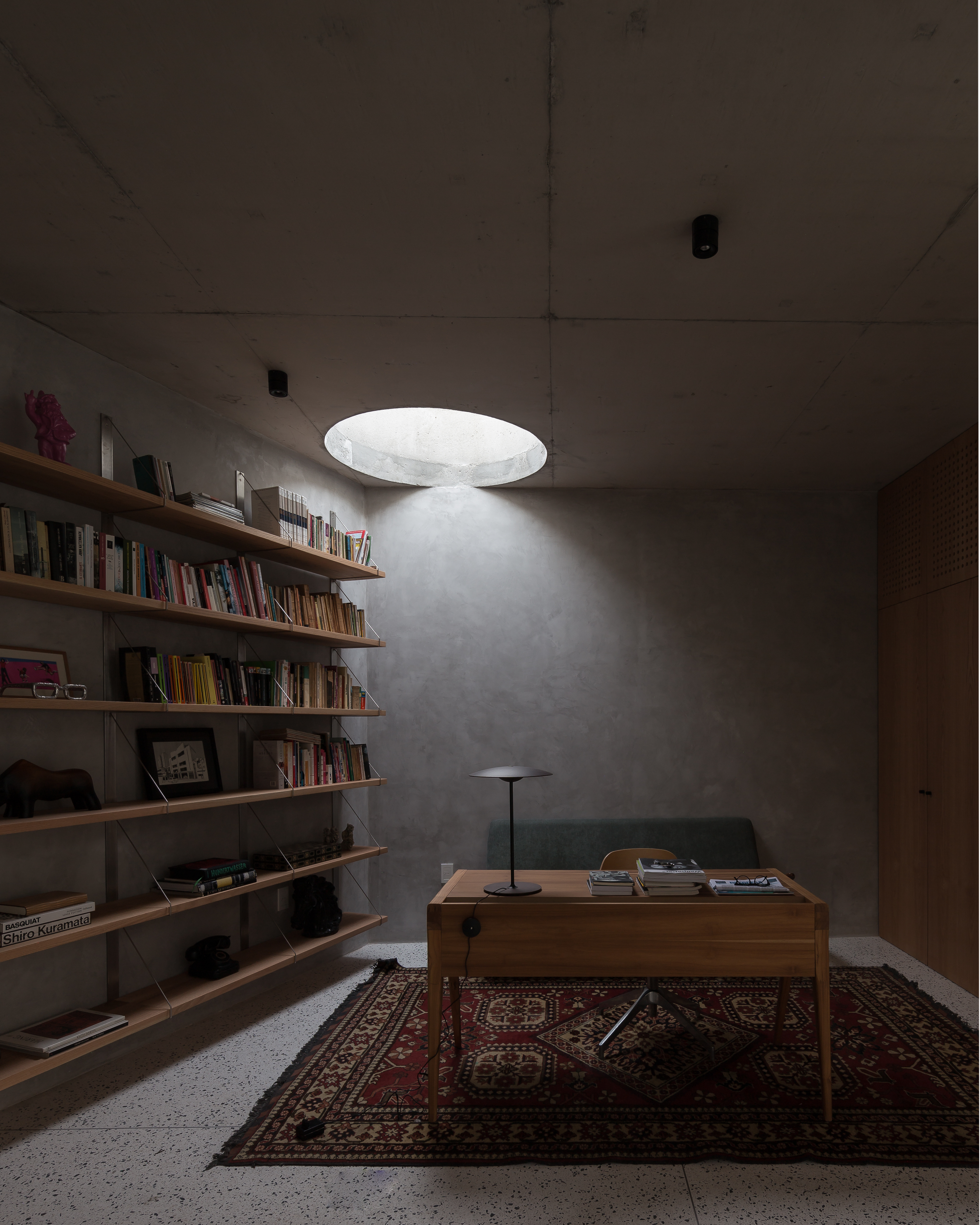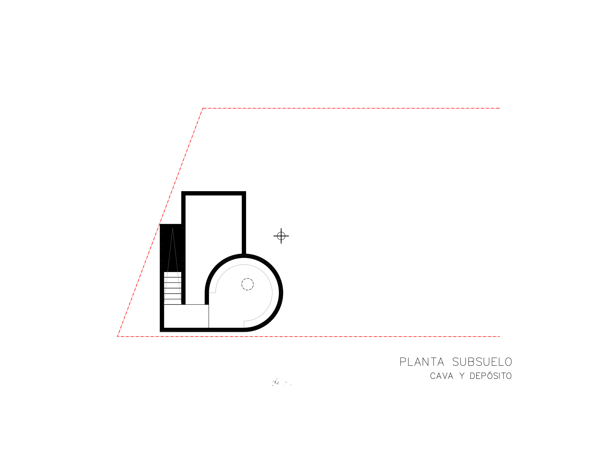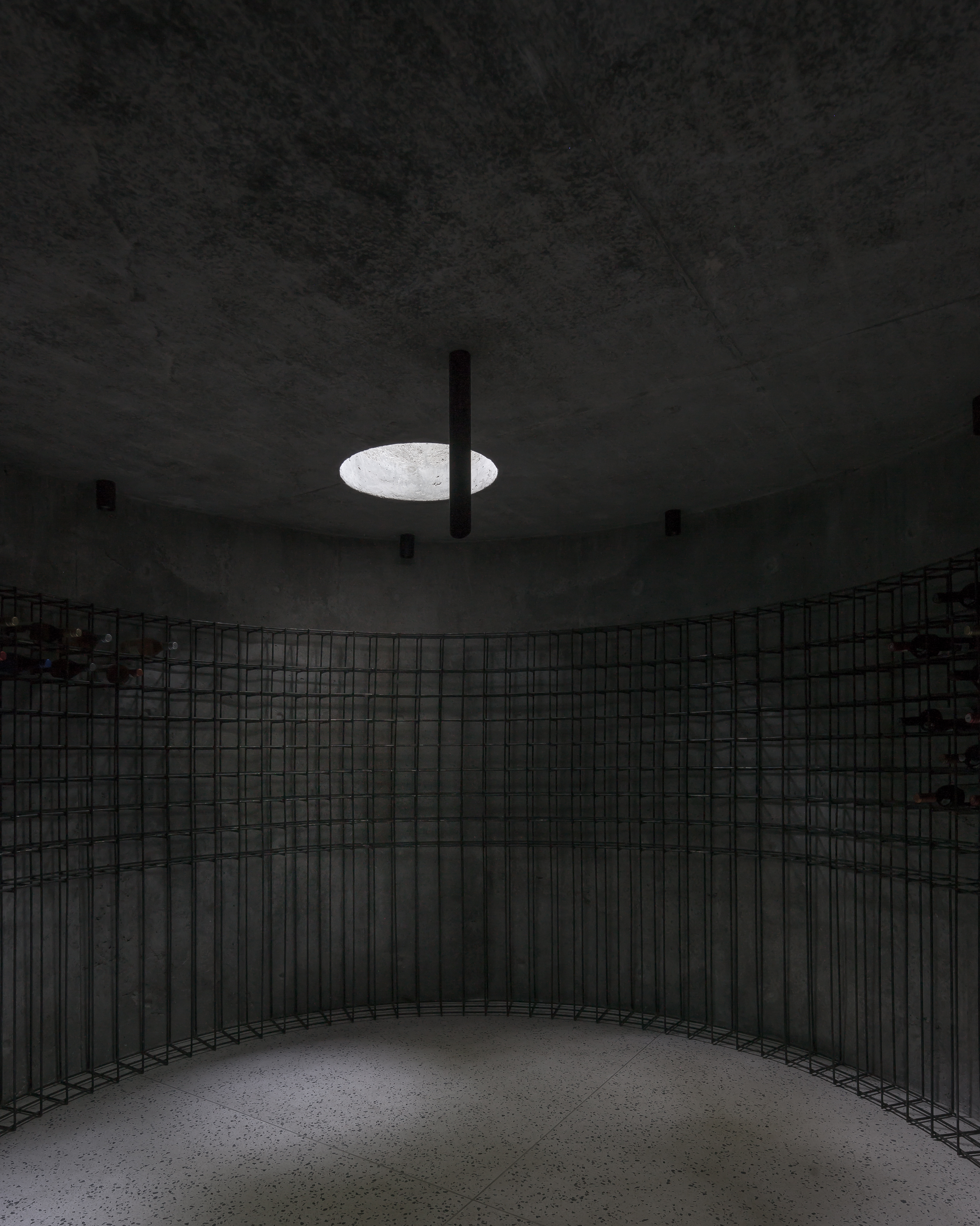 Opposed to the diaphanous noble floor, the basement holds a storeroom and a wine cellar, meant to feel like a dimly lit concrete cave. The wine cellar has a circle shape plan, with an oculus in its ceiling which embeds the space in a zenithal dim light, reminisce on the humility of Dieste’s baptistery that he will project for the “Cristo Obrero” church in Atlantida.