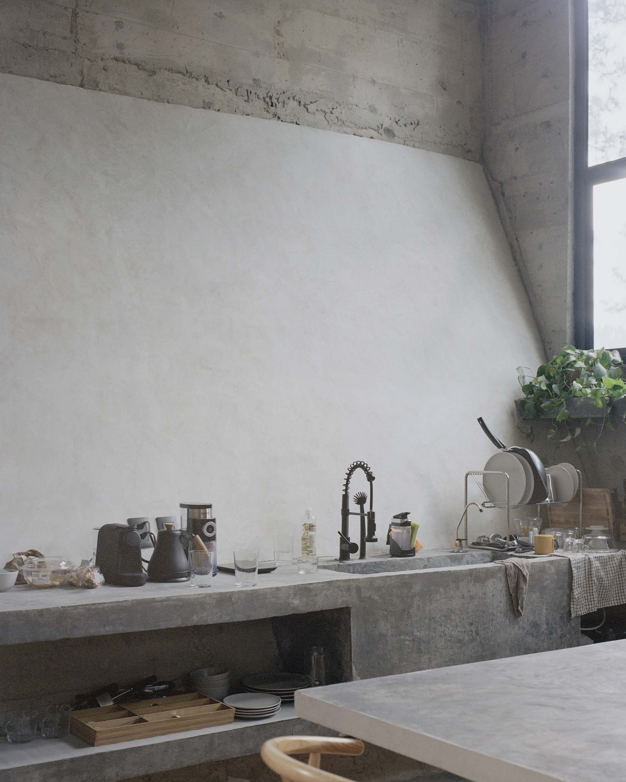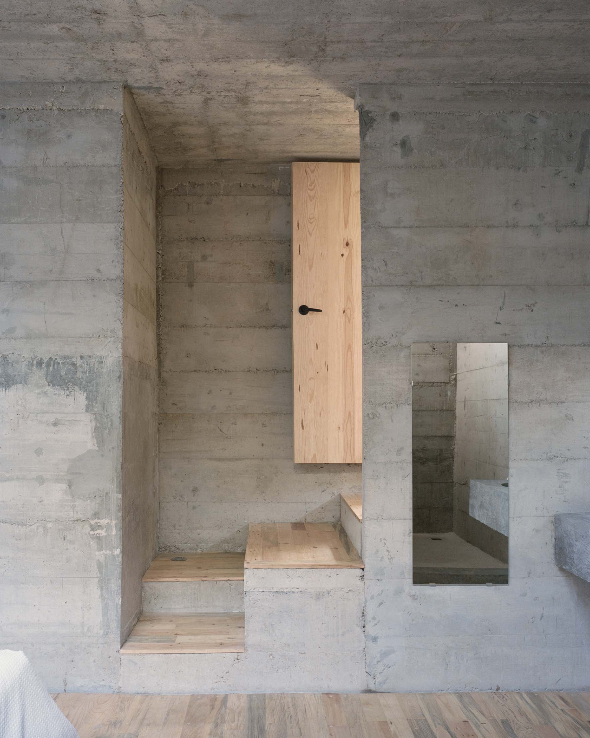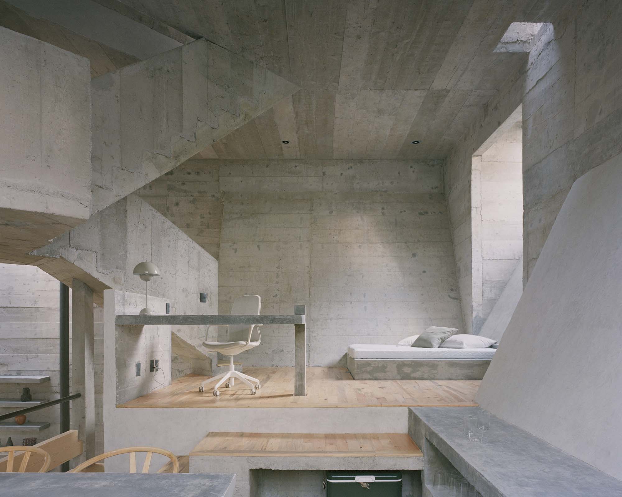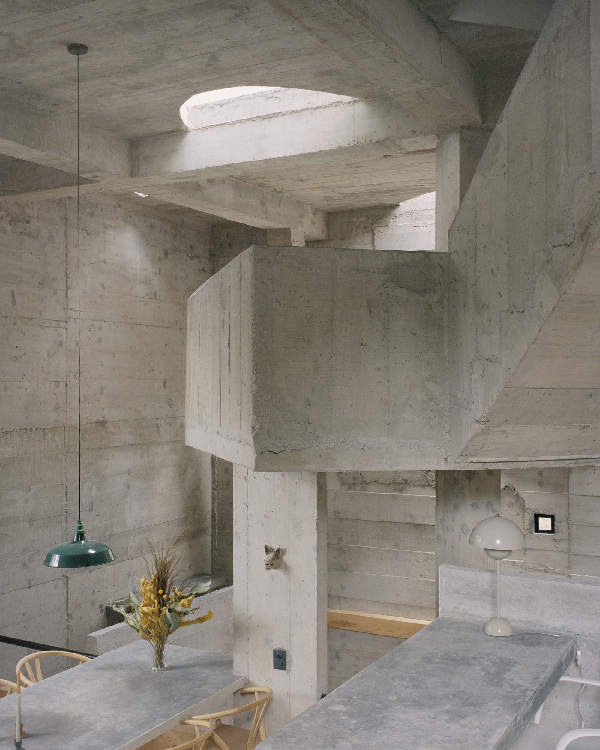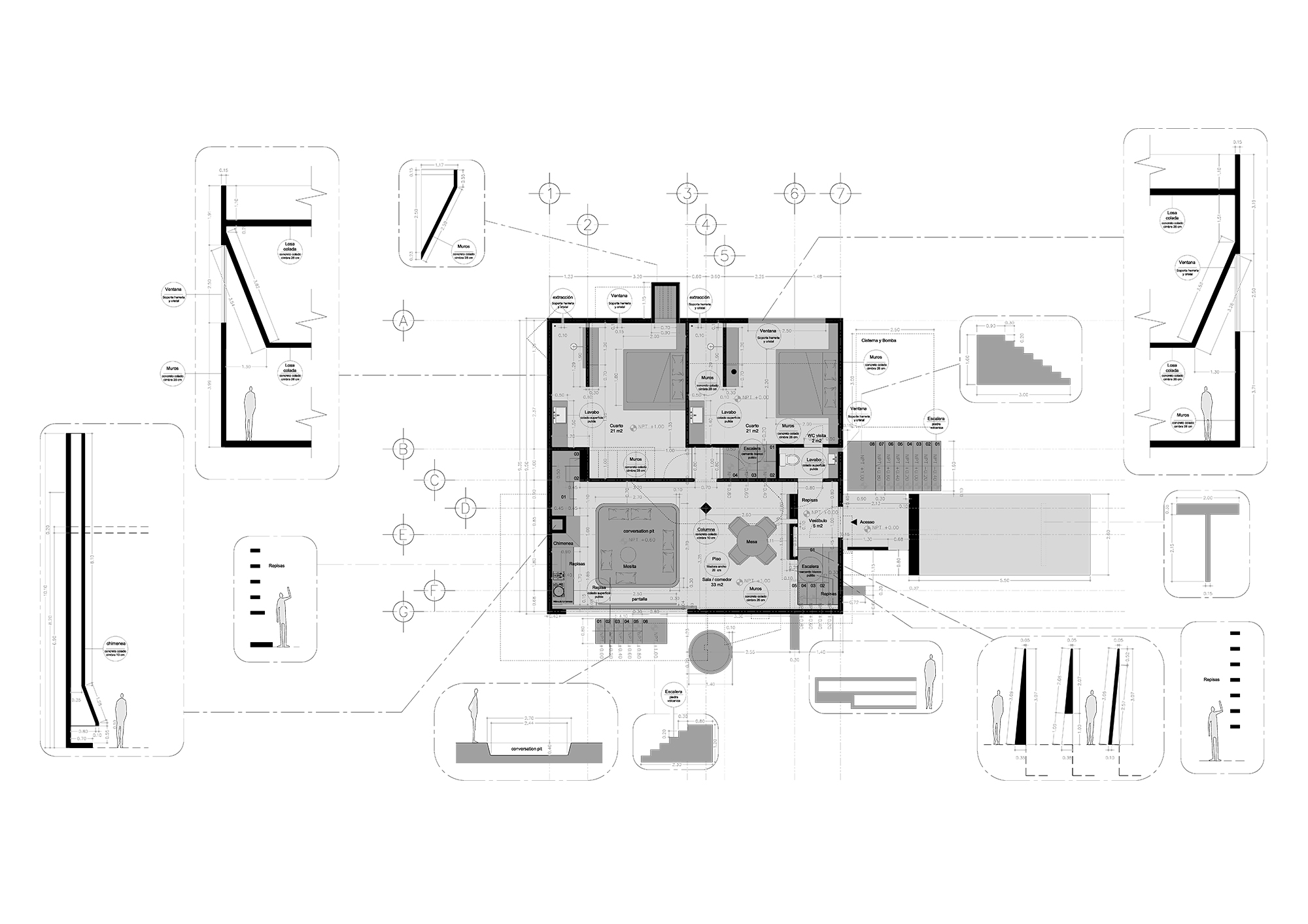 1. El proyecto responde a la idea de una casa aislada en el bosque, sin nunca perder de vista la necesidad de un fuerte sentimiento de seguridad; una casa como caja fuerte, hecha de concreto que defiende y cuida a sus habitantes. El resultado es una casa que se caracteriza por su encuentro de lenguaje entre la idea de la cabaña -elemento romantico-, y la fortaleza -elemento protector-, expresando el brutalismo en su concreto. El concreto viene a cerrar y defender la planta baja, mientras se colocan fuera del alcance las ventanas para impedir una posible intrusión exterior.