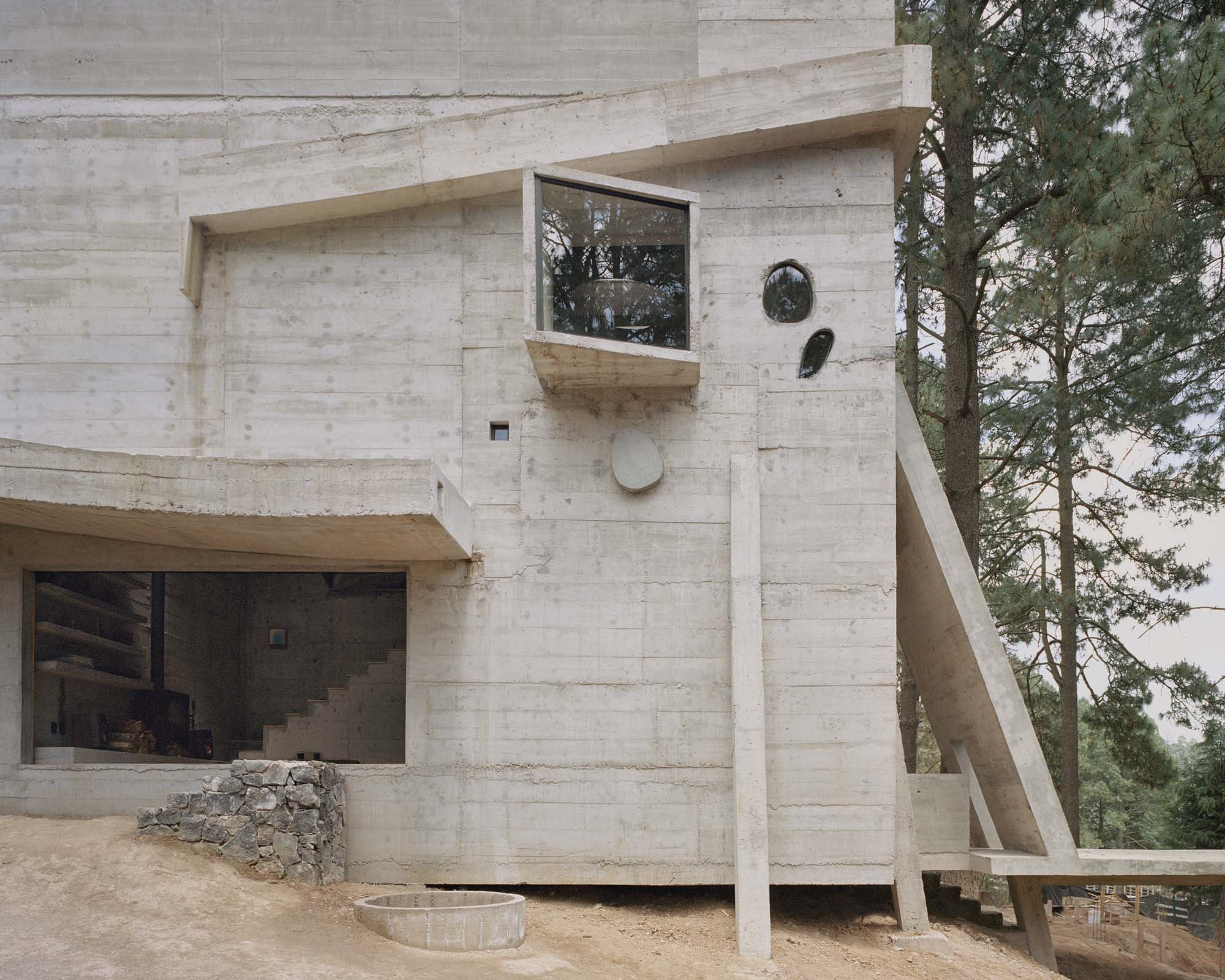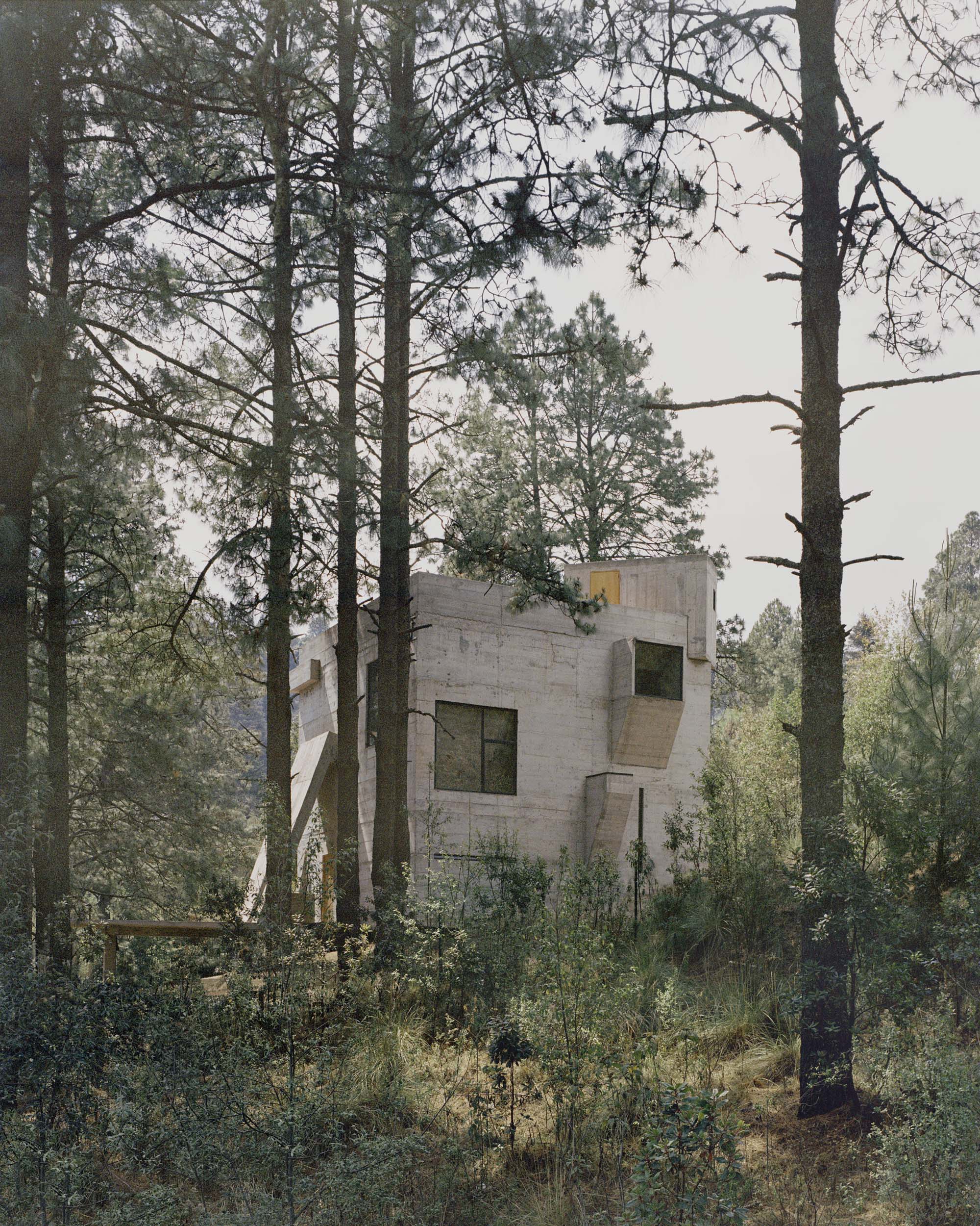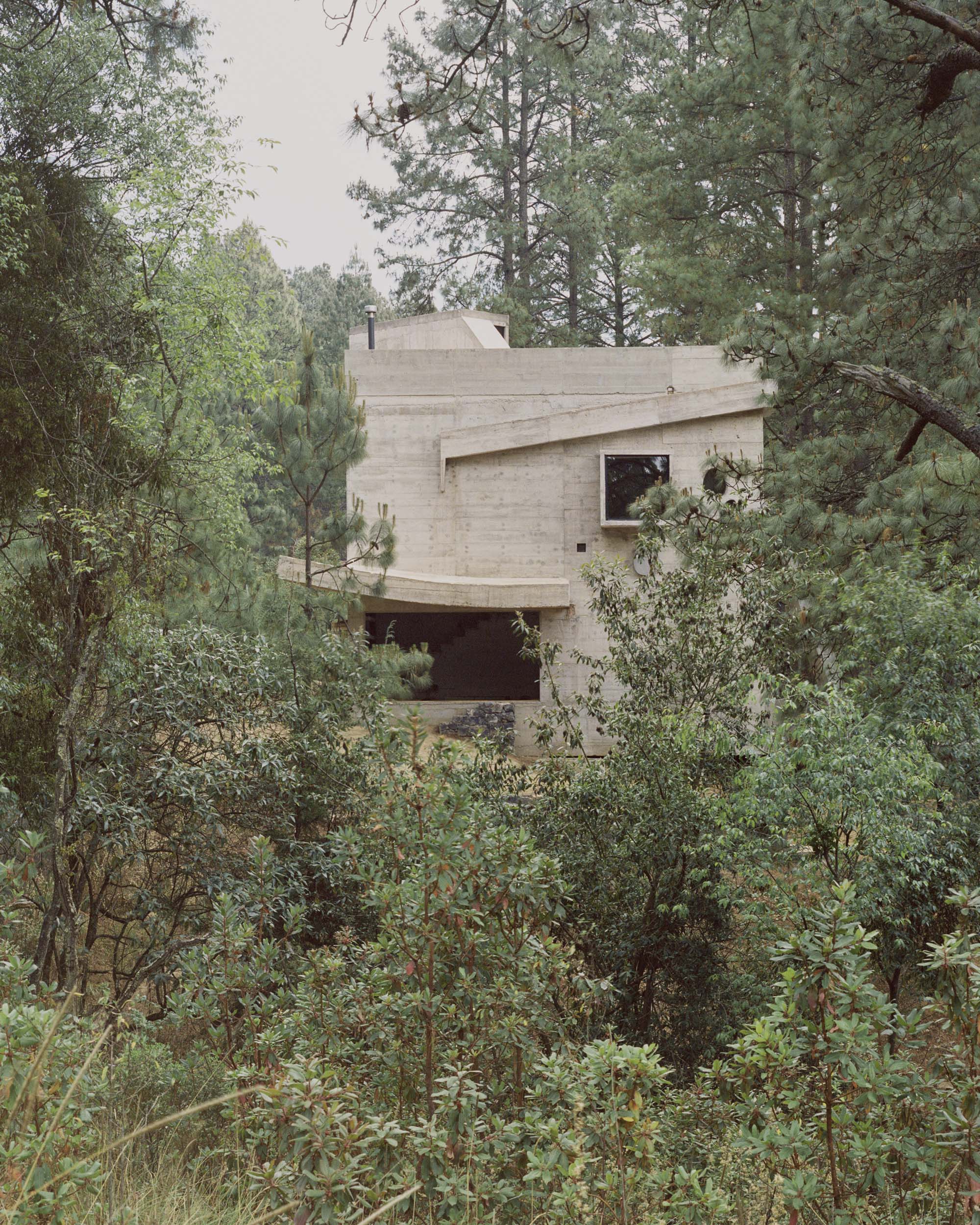 2. El proyecto estructural busca ser lo más compacto posible, con la huella de desplante lo más reducida posible, con el fin de evitar una cimentación compleja y costosa debido al fuerte declive que tiene el terreno. La casa se monta en el pendiente natural, volando entre los pinos sobre su esquina suroeste, y semi enterrada sobre su esquina opuesta noreste. El proyecto busca recrear el sentimiento de una cabaña suspendida en la topografía natural de su terreno. La estructura expresa un perfecto equilibrio de su cimentación, generando un singular contraste entre el sentimiento de ligereza de una cabaña por un lado, balanceado por el peso de una fortaleza de concreto por el otro.