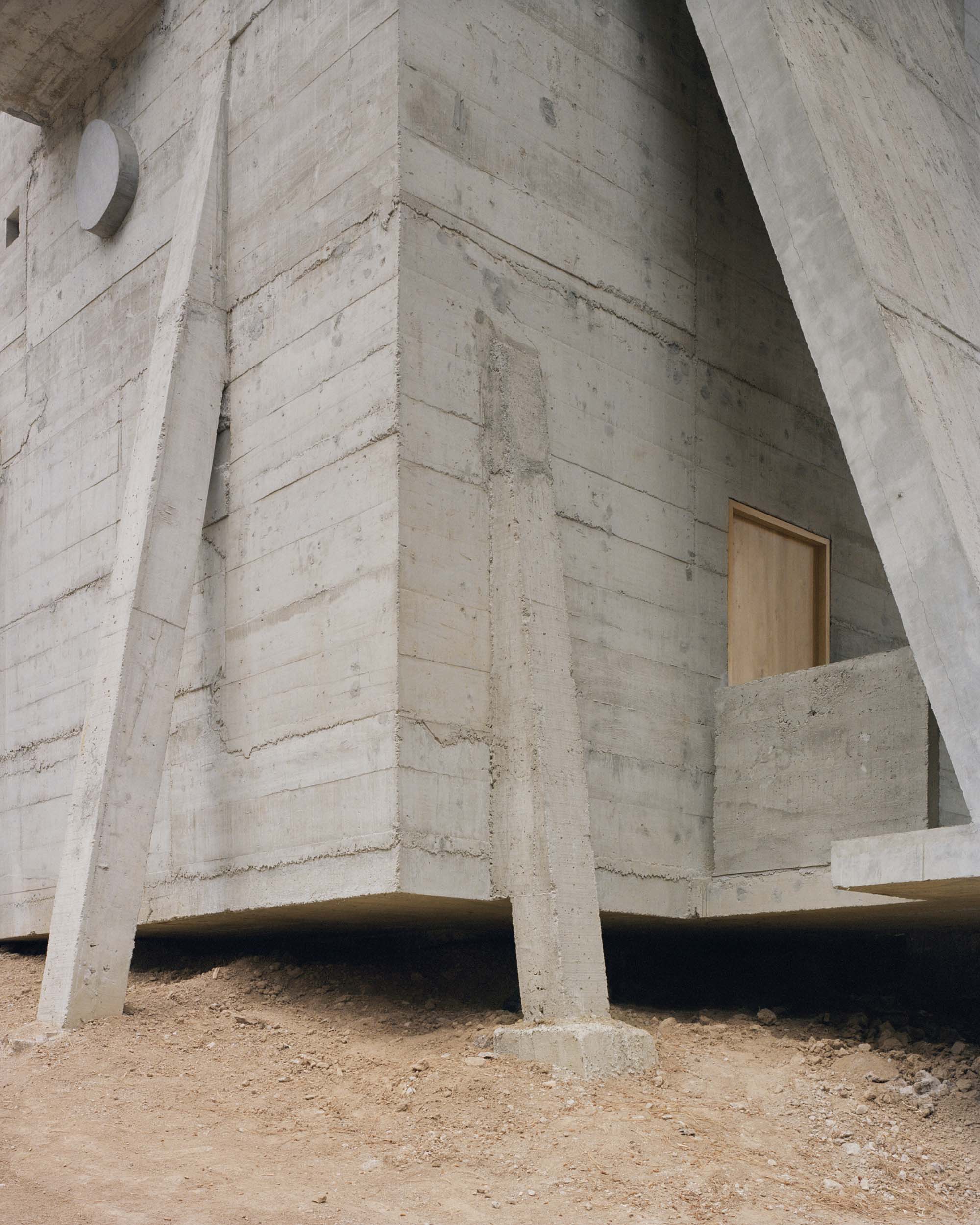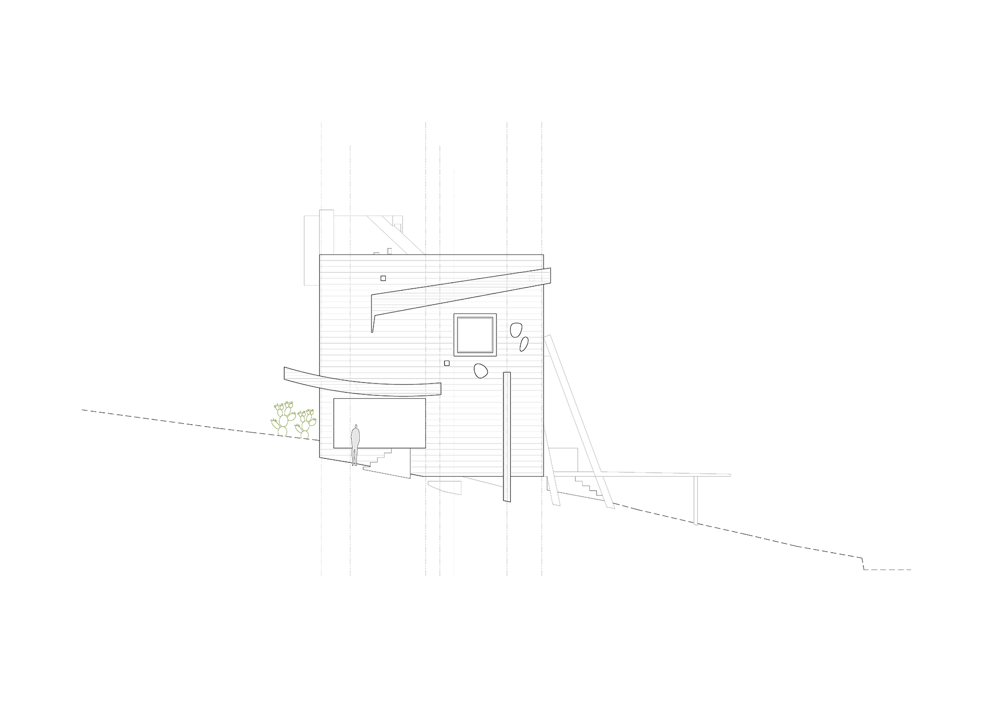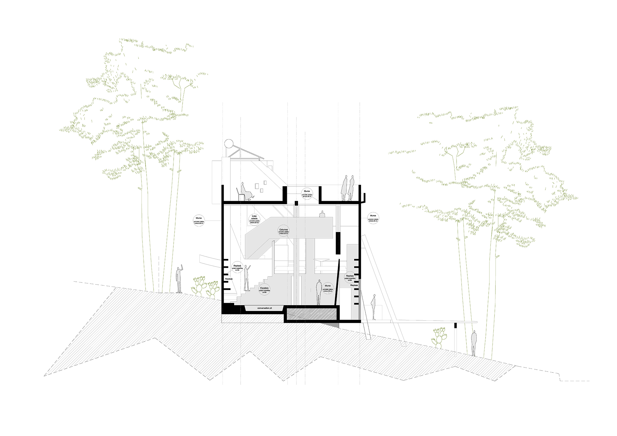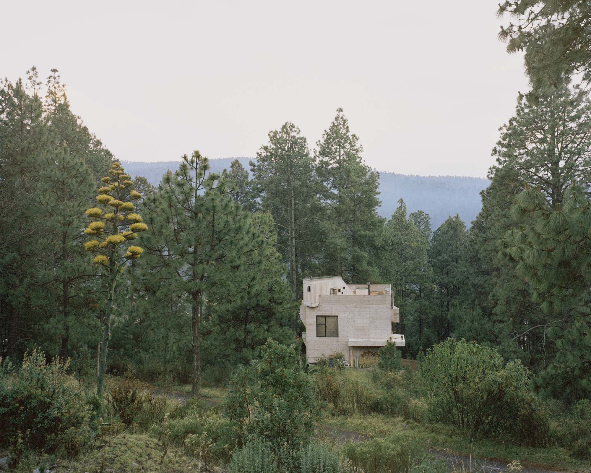 2. El proyecto estructural busca ser lo más compacto posible, con la huella de desplante lo más reducida posible, con el fin de evitar una cimentación compleja y costosa debido al fuerte declive que tiene el terreno. La casa se monta en el pendiente natural, volando entre los pinos sobre su esquina suroeste, y semi enterrada sobre su esquina opuesta noreste. El proyecto busca recrear el sentimiento de una cabaña suspendida en la topografía natural de su terreno. La estructura expresa un perfecto equilibrio de su cimentación, generando un singular contraste entre el sentimiento de ligereza de una cabaña por un lado, balanceado por el peso de una fortaleza de concreto por el otro.