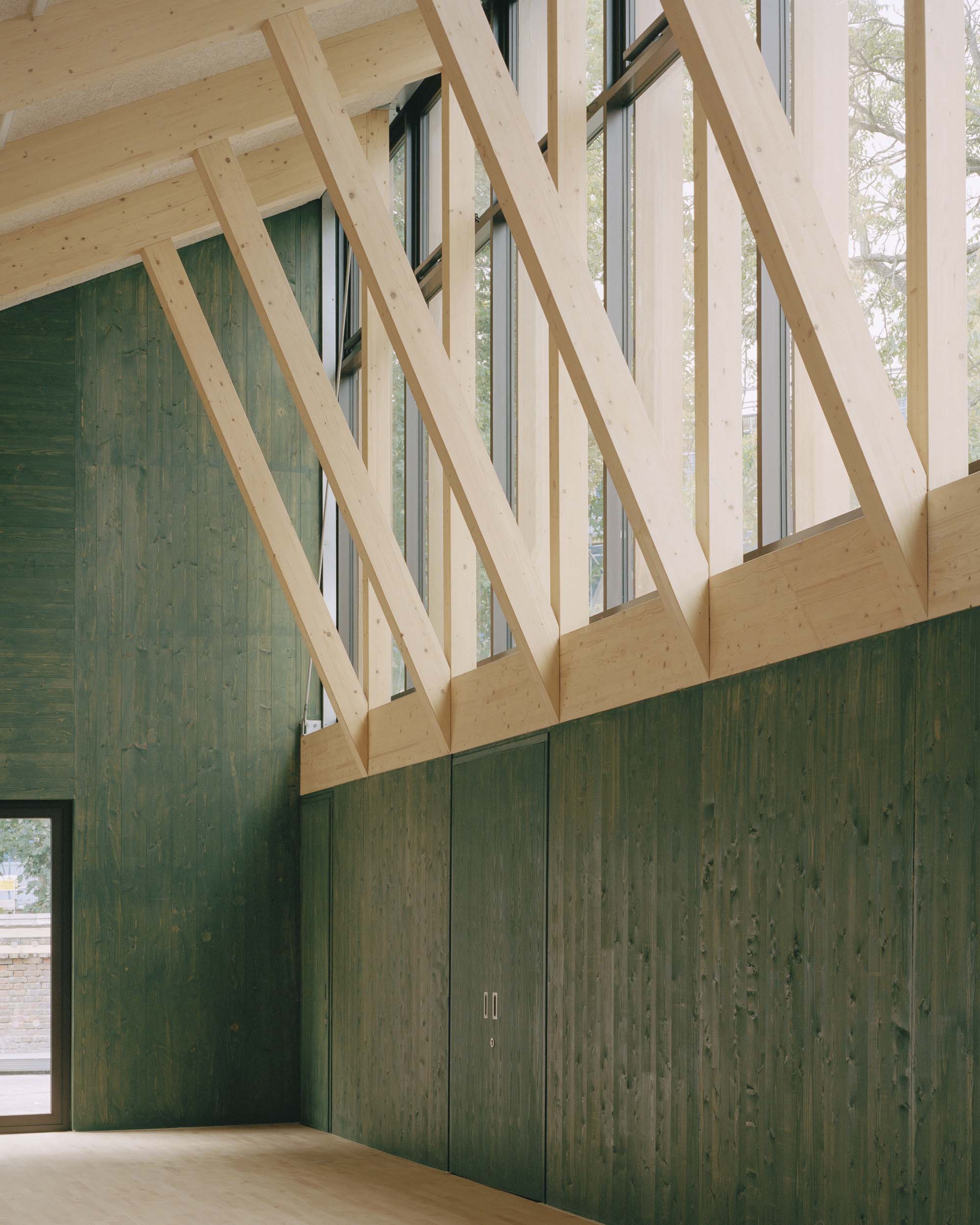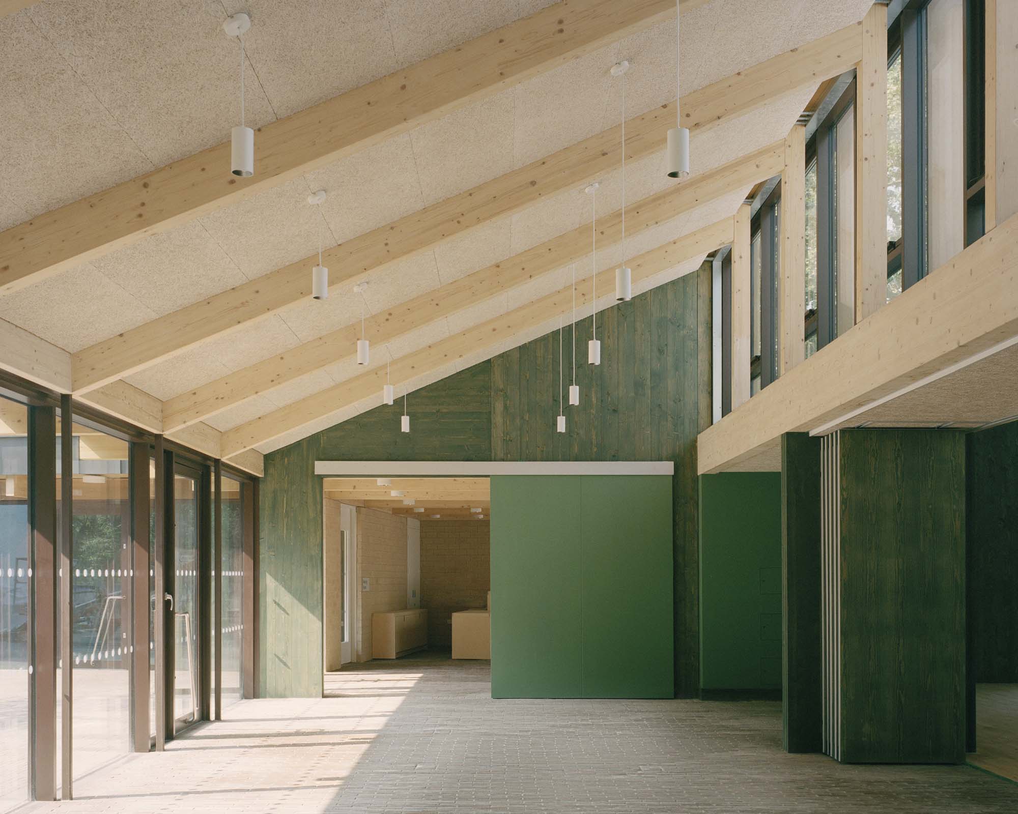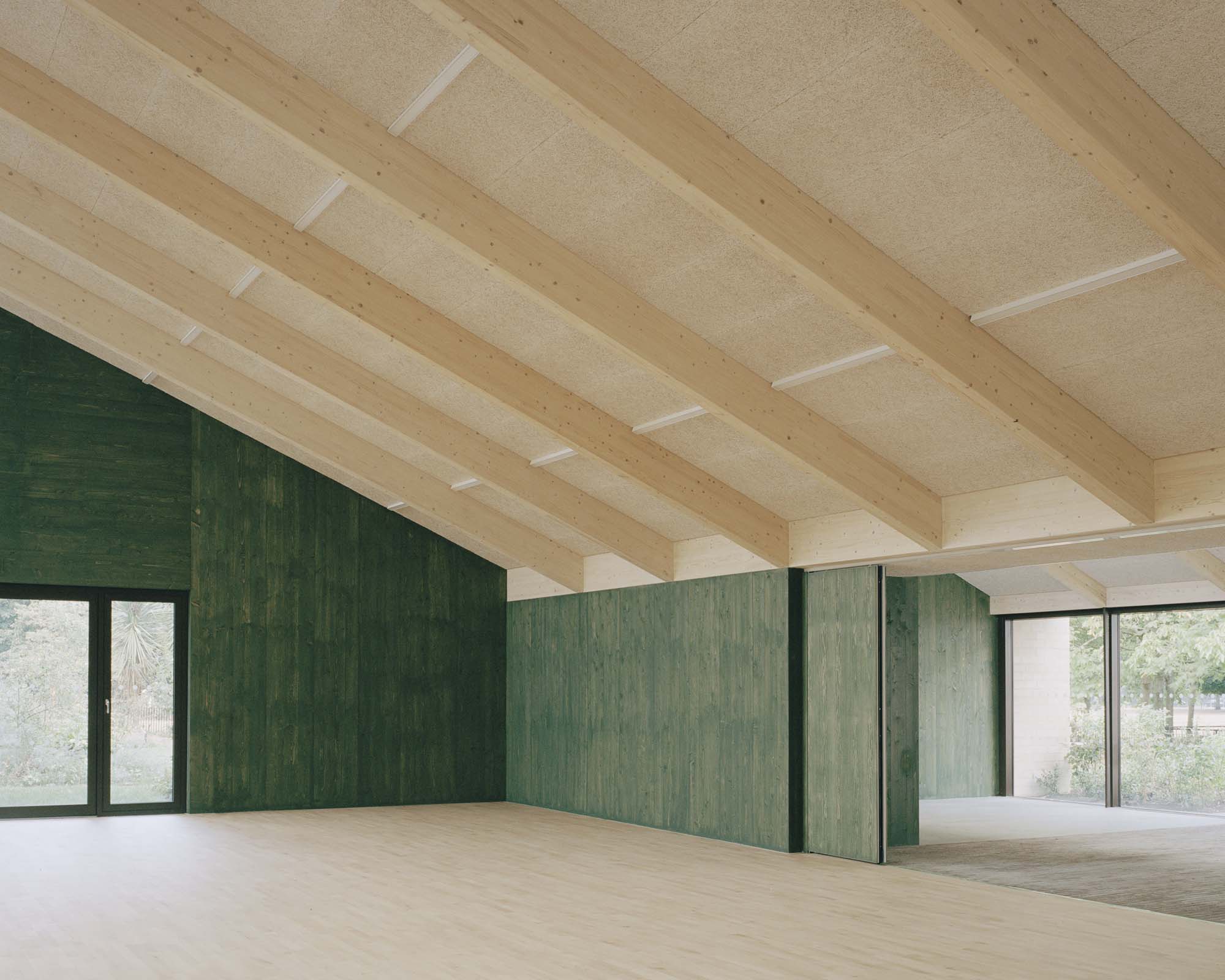 The project is highly innovative in both its programmatic and material response, reconsidering the typology of community centre and anticipating the needs of future generations. In its spatial disposition, rooms are arranged to overlap in plan. Sliding partitions offer the users a multitude of different ways to inhabit the space for assemblies, events, community workshops, and celebrations, whilst also opening up connections to the external courtyard and park. The building’s completion coincided with the Covid-19 pandemic, when this inherent flexibility enabled the Centre to be put to use as a temporary testing centre to serve the local community.