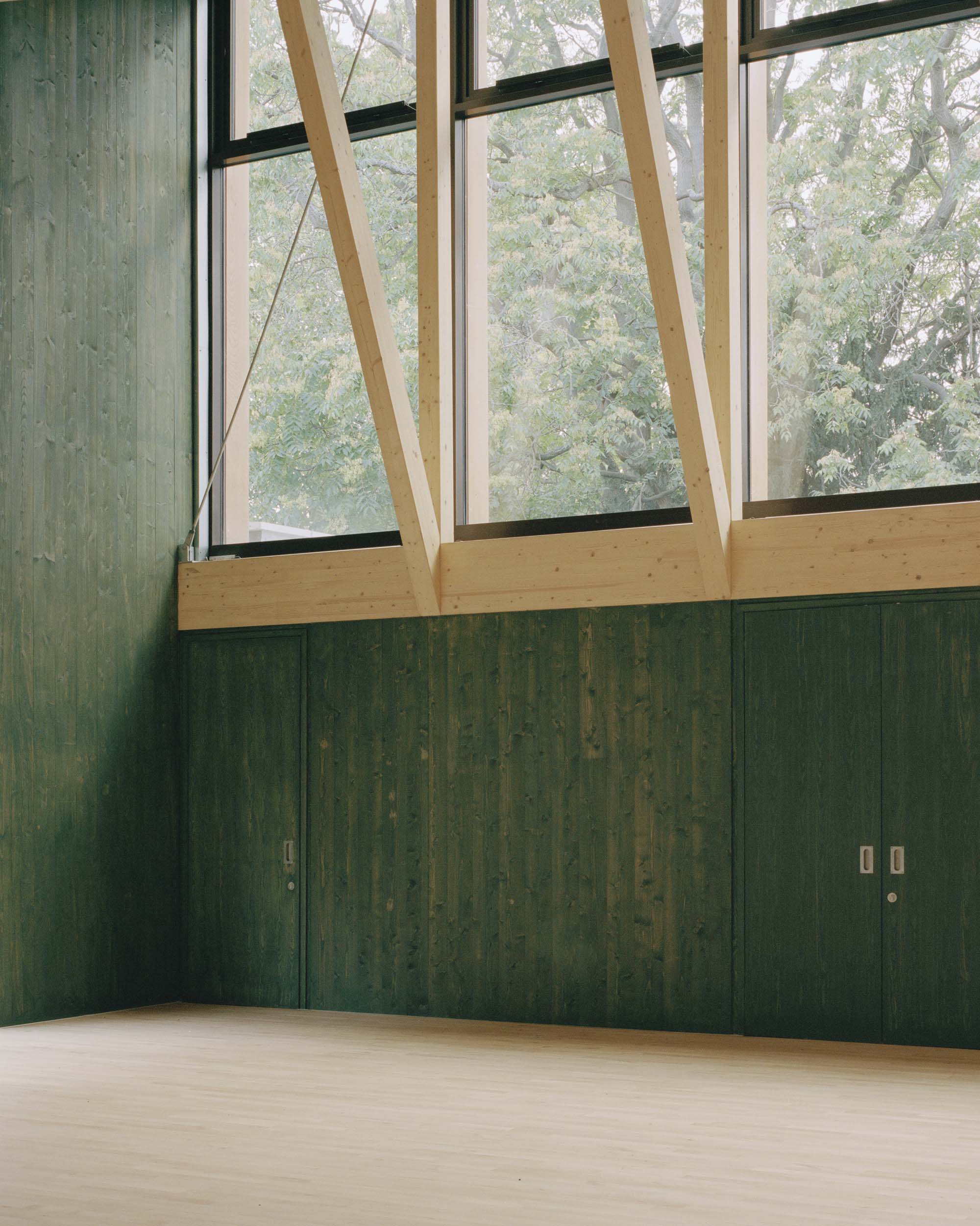 The interior materiality is again reminiscent of glasshouse structures, and reinforce the idea that the additions are designed to be secondary to the lodge. The use of an expressed timber roof construction gives a natural lightness to the space: these interior spaces are lit by large north facing clerestory glazing to give a consistent light environment for internal activities. Internally, the use of an exposed timber structure and envelope reinforces the sustainable agenda behind the project while giving a highly tactile quality to the space.