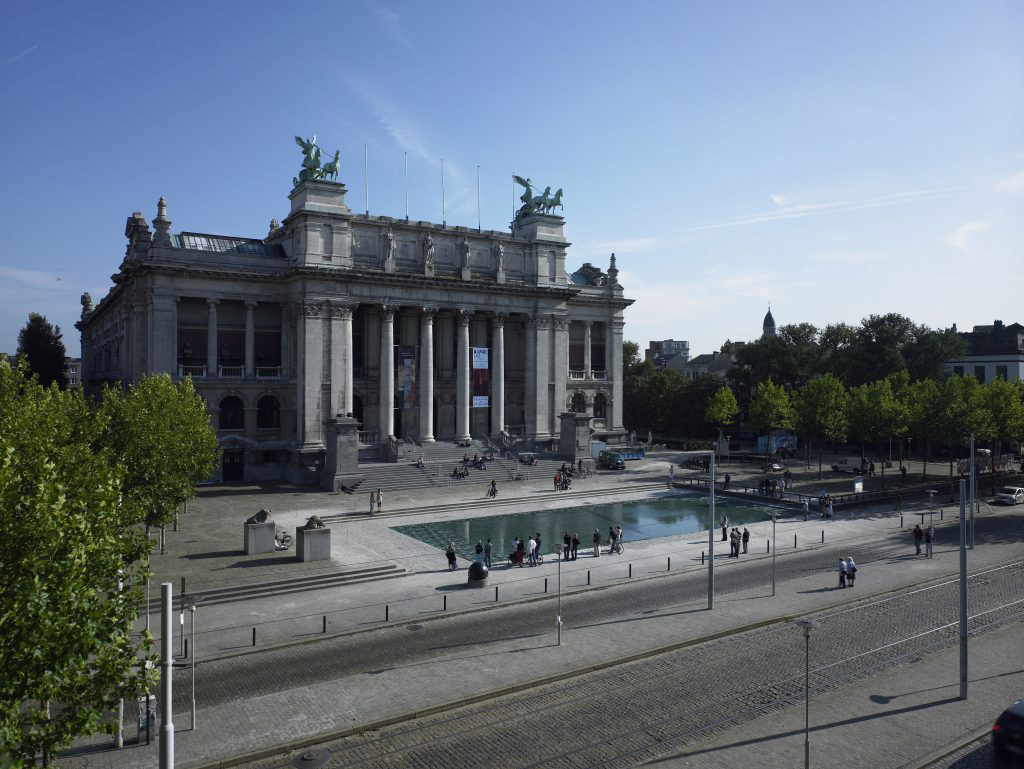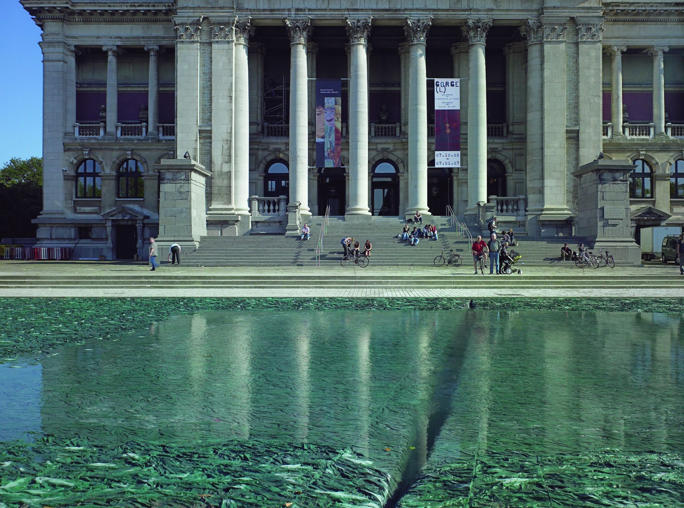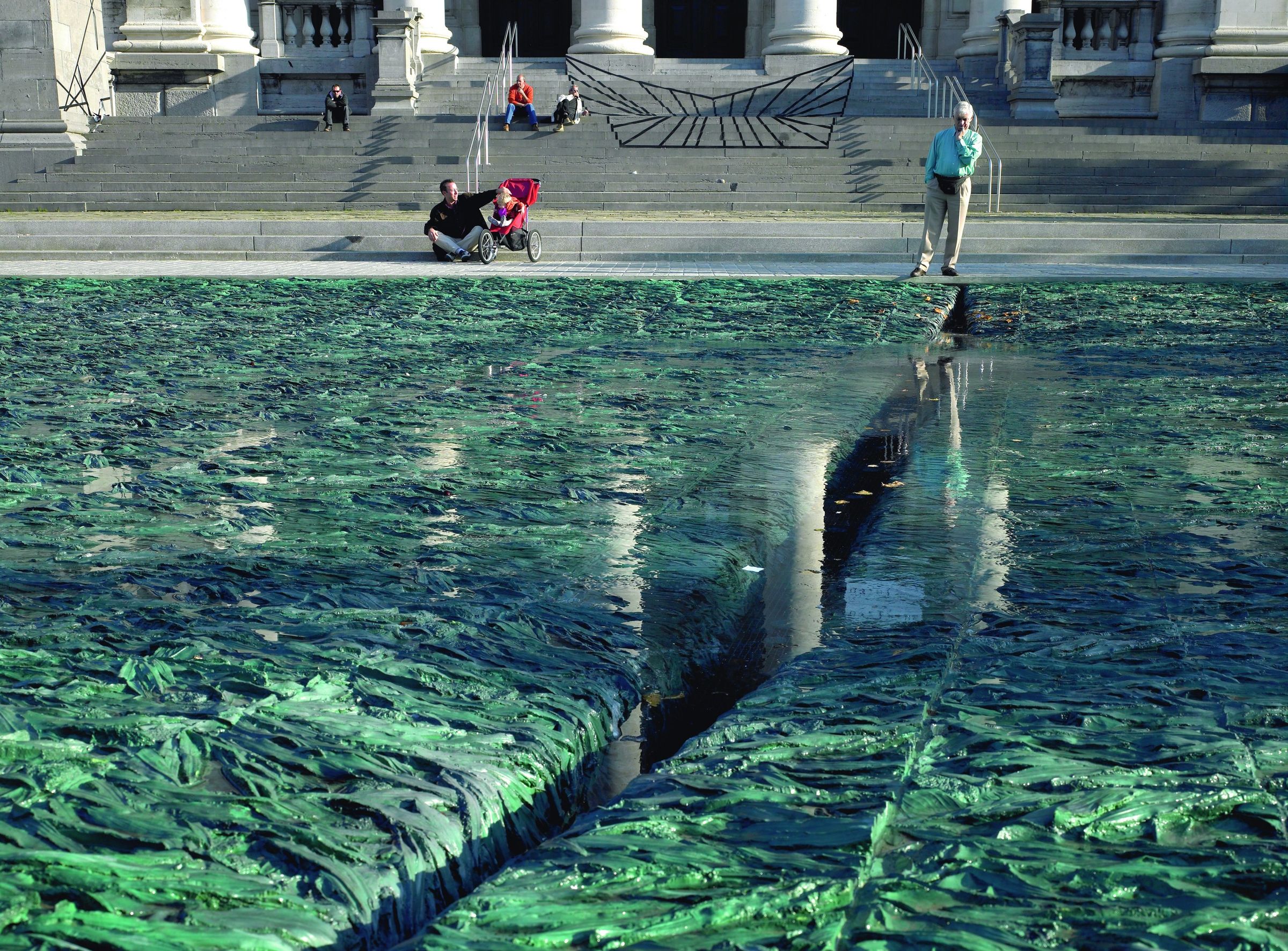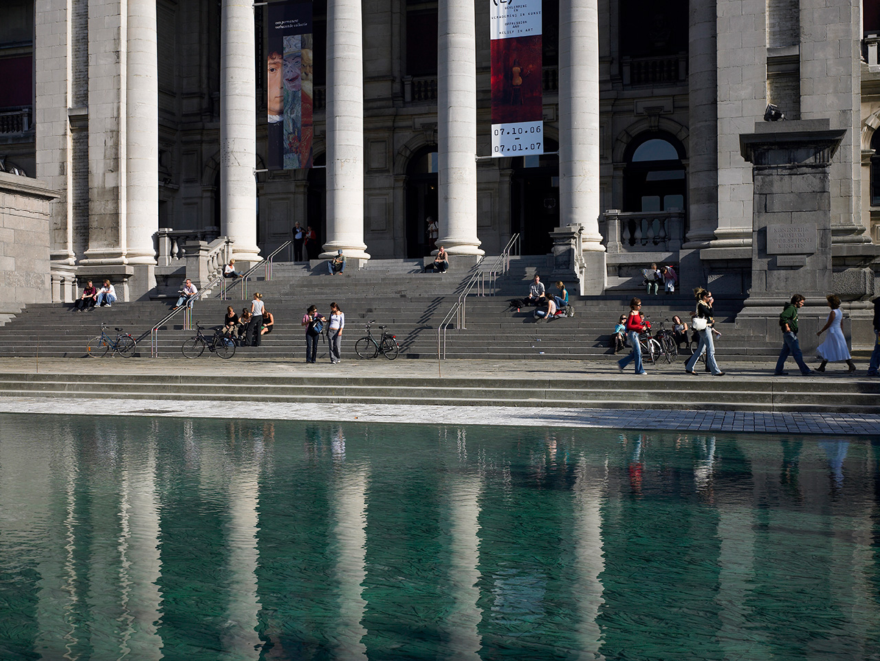 The dark color of the cement base allows the portico of the museum to be reflected in the water. The slit at the bottom causes the water to disappear and reappear. The water reflects everything taking place around it, the streets that cross the square, the tram, the passers-by who pause to wait for the moment when the water disappears and the bottom is revealed with all its shimmering puddles. Then they notice that the leaves seem to move, and other less obvious things, and they wait for the same thing to happen again,for the water to rise up like an overflowing, from the inside out.