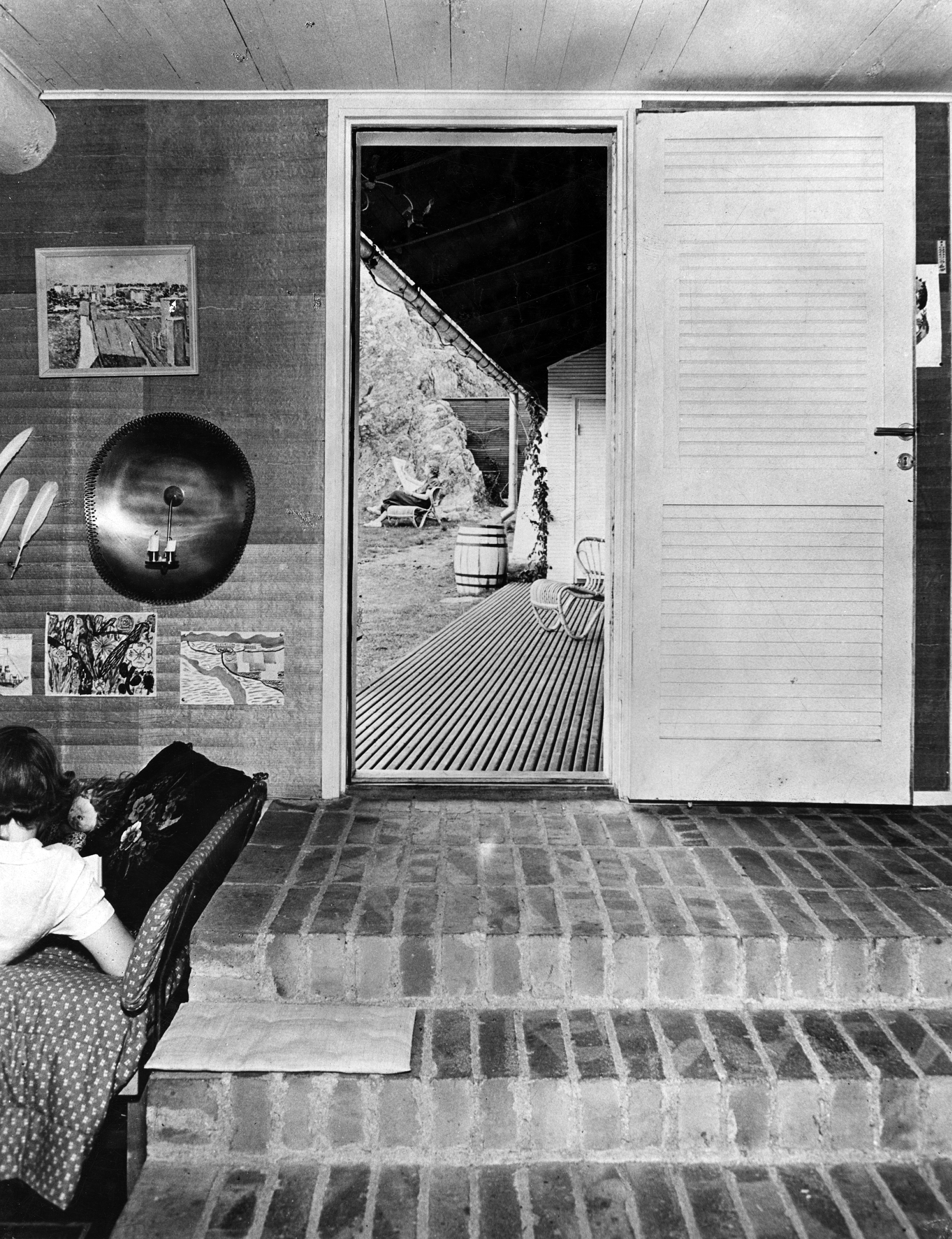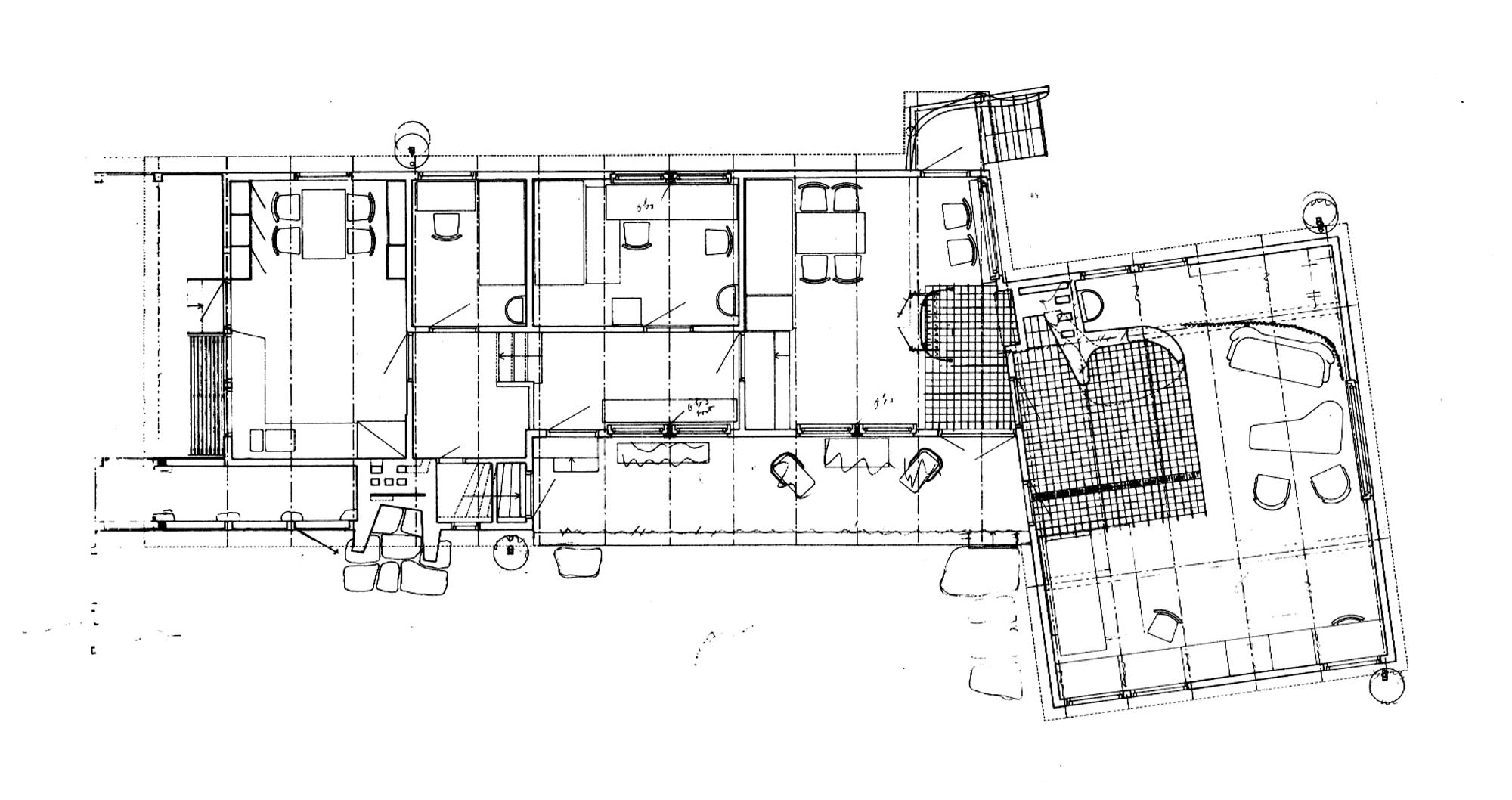 Frente a la orilla del mar, sobre la cota más baja de un terreno en pendiente protegido del norte por grandes peñascos de unos siete metros de altura, se localizó el lugar perfecto para el emplazamiento. La casa se levantaba a un metro escaso de distancia de la formación granítica, disponía de una única planta y se adaptaba a la topografía organizándose en cuatro niveles. La pared de roca delimitaba un espacio abrigado frente a la fachada oeste sobre la que se abría un amplio porche. Este se concibió como una extensión del espacio interior —para disfrutar de las noches de verano— a la vez que actuaba como pórtico de entrada, ya que la puerta principal se situaba en este frente.