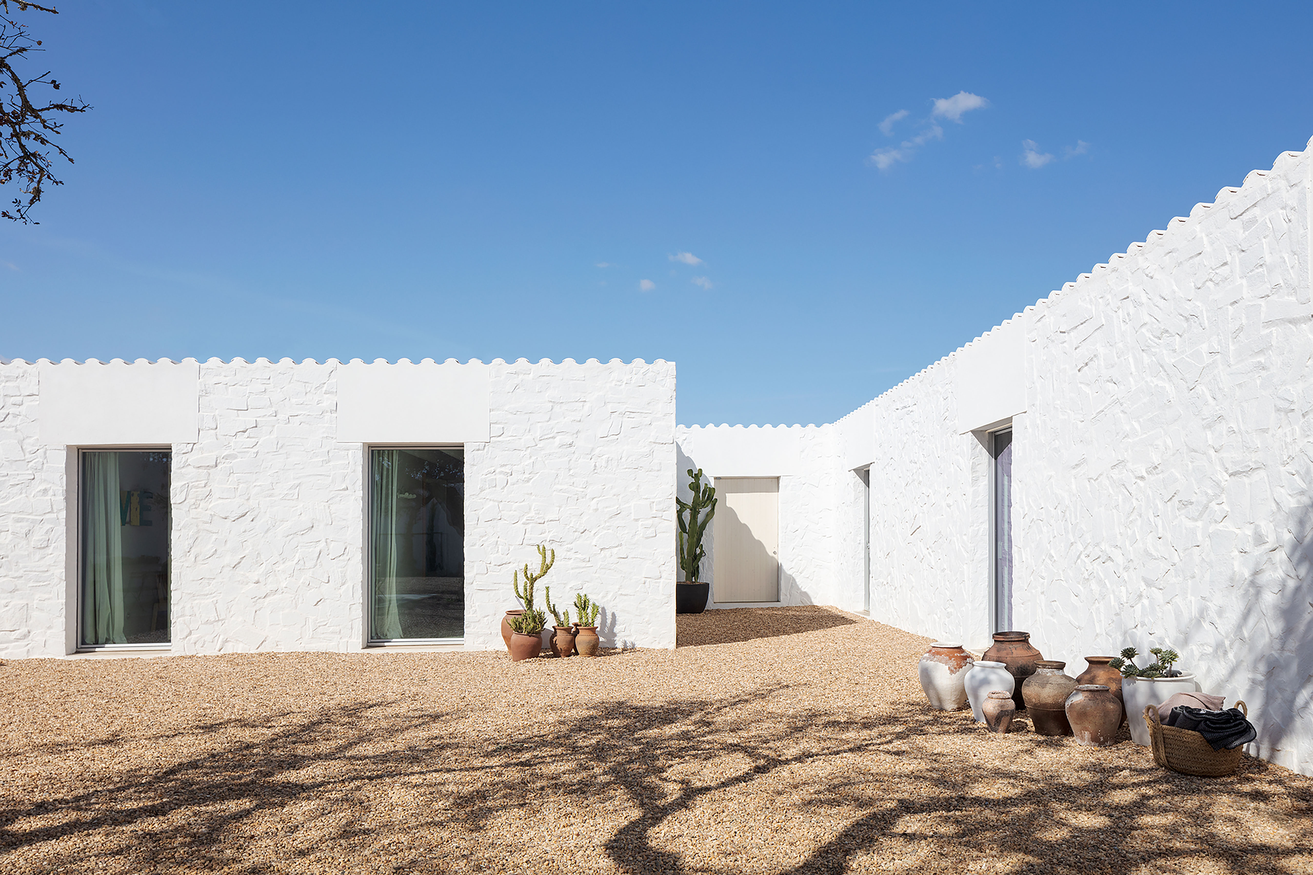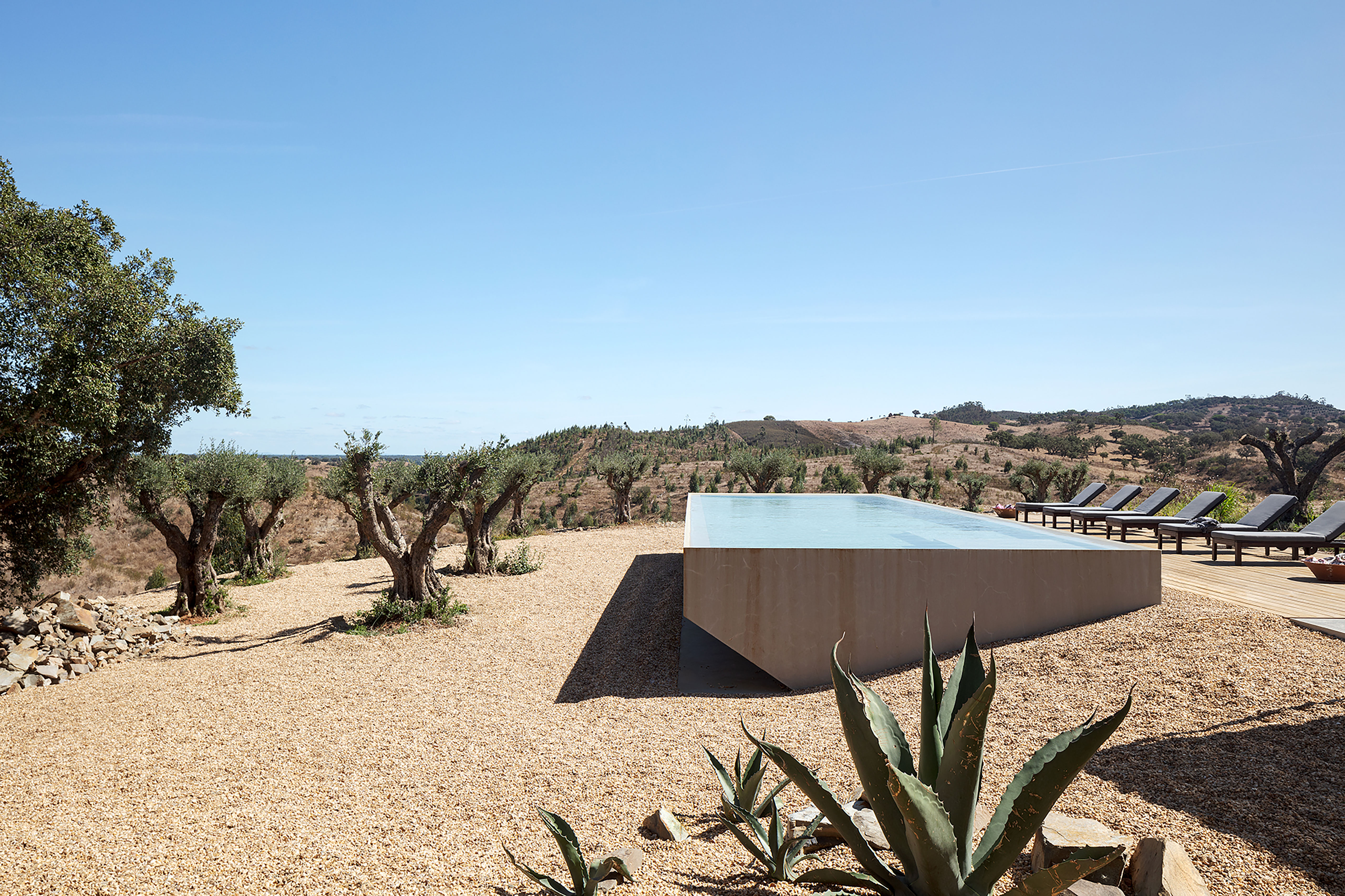 The house is located in the Southwest of Alentejo, deep in the Grandola hills. The gently undulating topography contrasts with the harsh dryness of the landscape and its bare vegetation of cork and holm oaks with sparse bushes creeping from the calcareous soil.