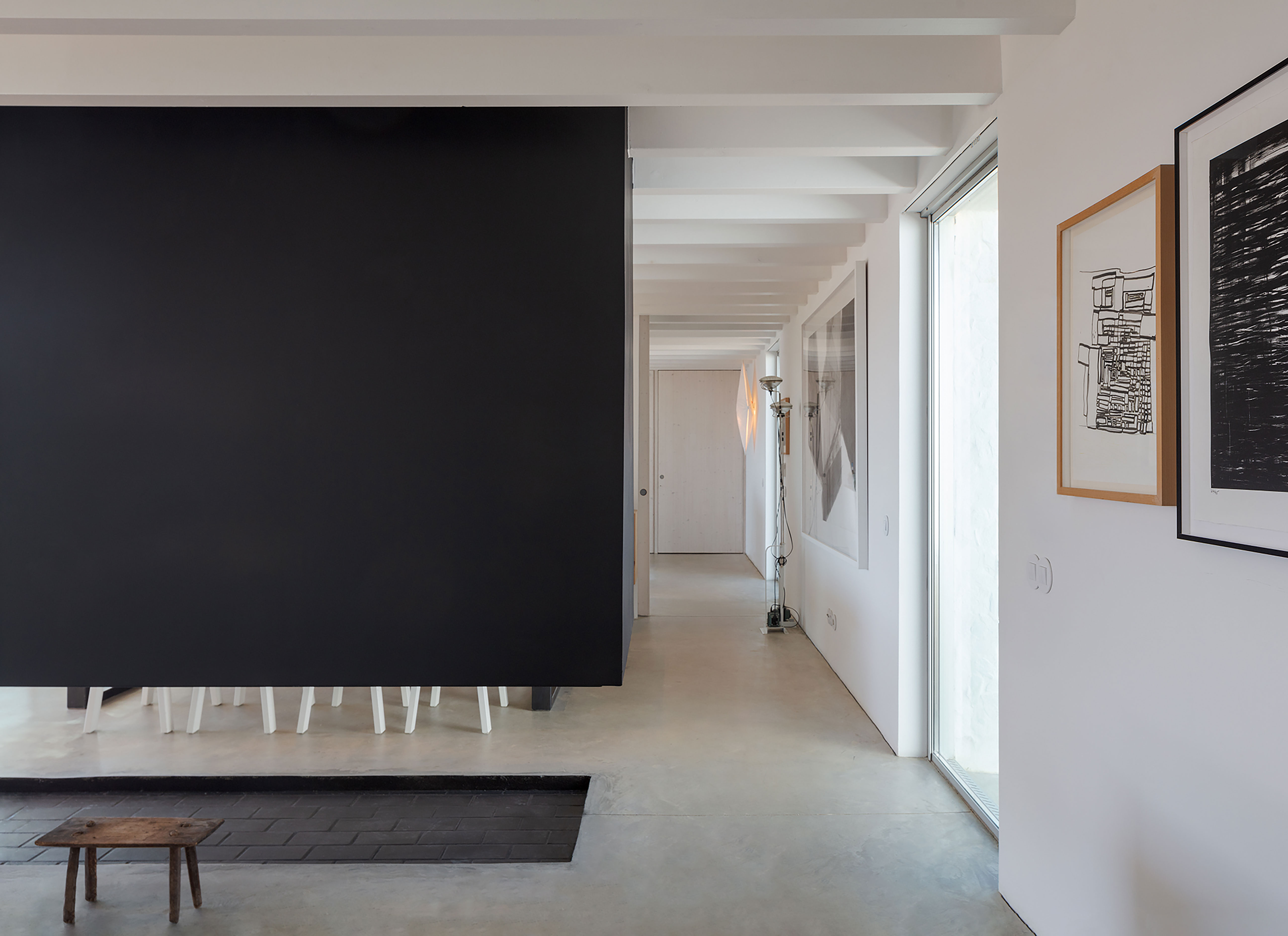Inside the courtyard, three rectangular volumes occupy the North, the East and the West elevations, comprising respectively the bedroom suites, the living room and kitchen and the garage-cum-staff bedroom, while the void southwards is formally occupied by an orchard. The common areas function in a classical sequence of unfolding rooms, from the kitchen to the living room and to the library, all of which are separated by symmetrical pocket doors. The dining area is divided from the living room by a large fireplace with a hanging metal chimney. The ceiling is made of structural whitewashed wood beams and boarding with white stuccoed walls and cement floors.