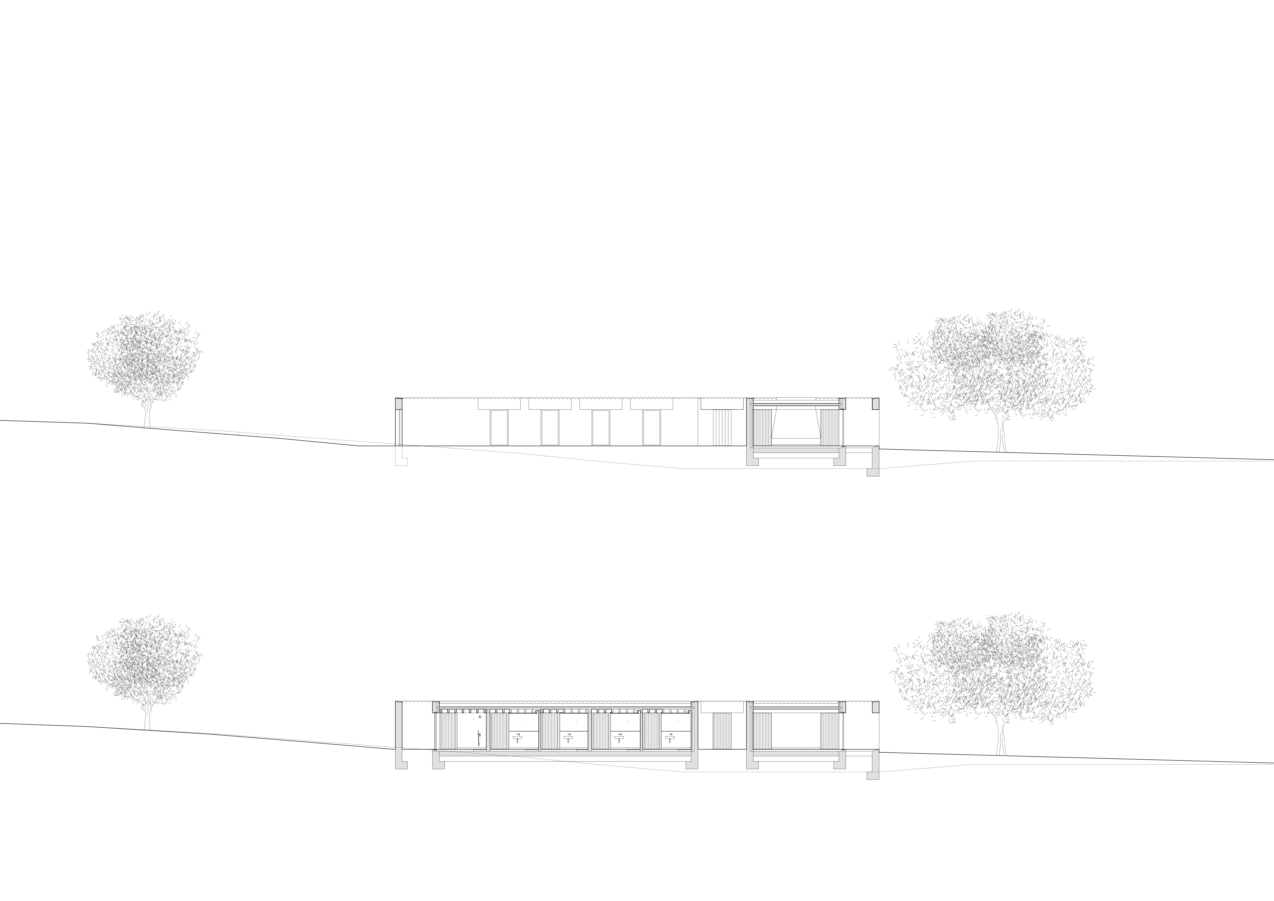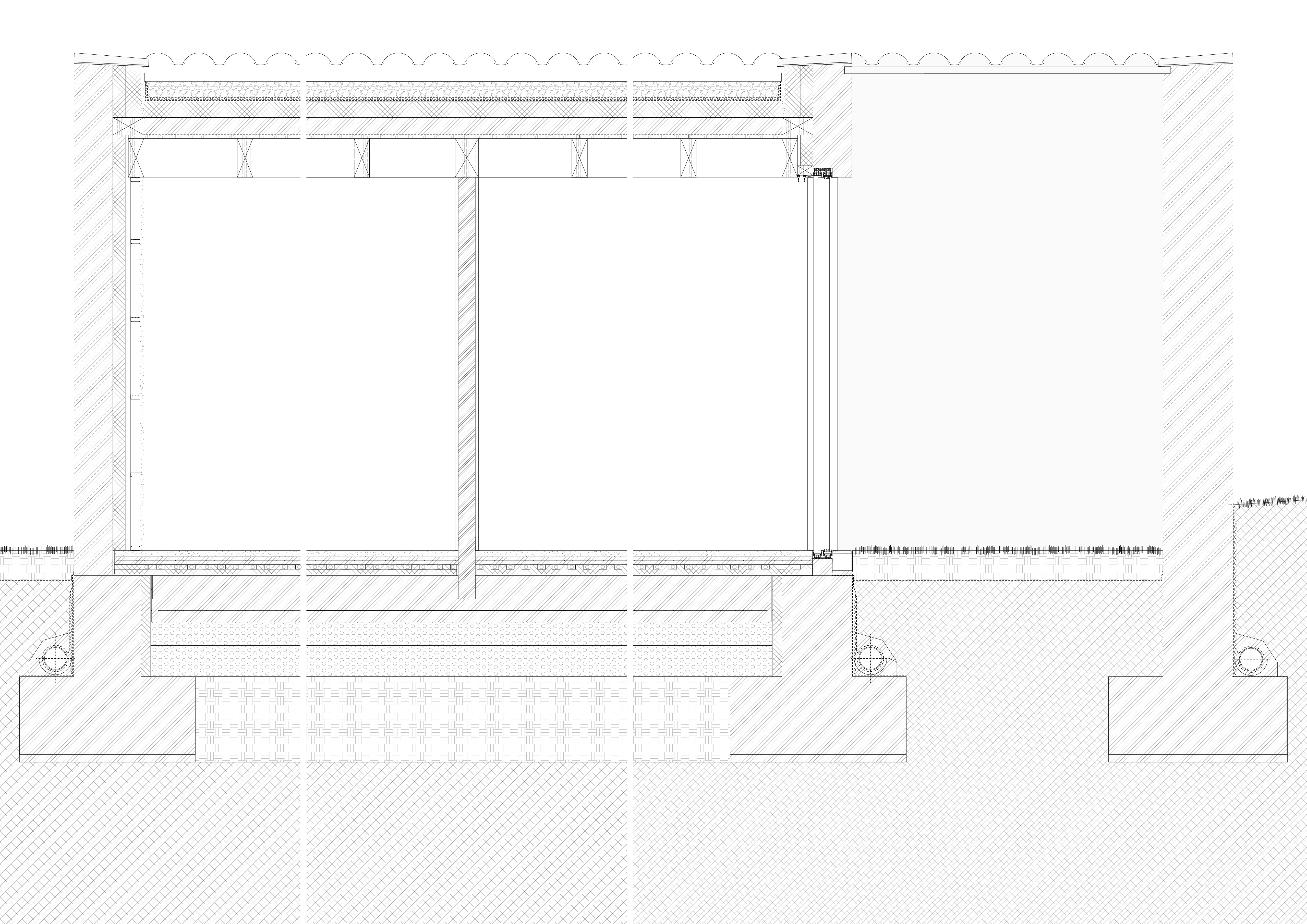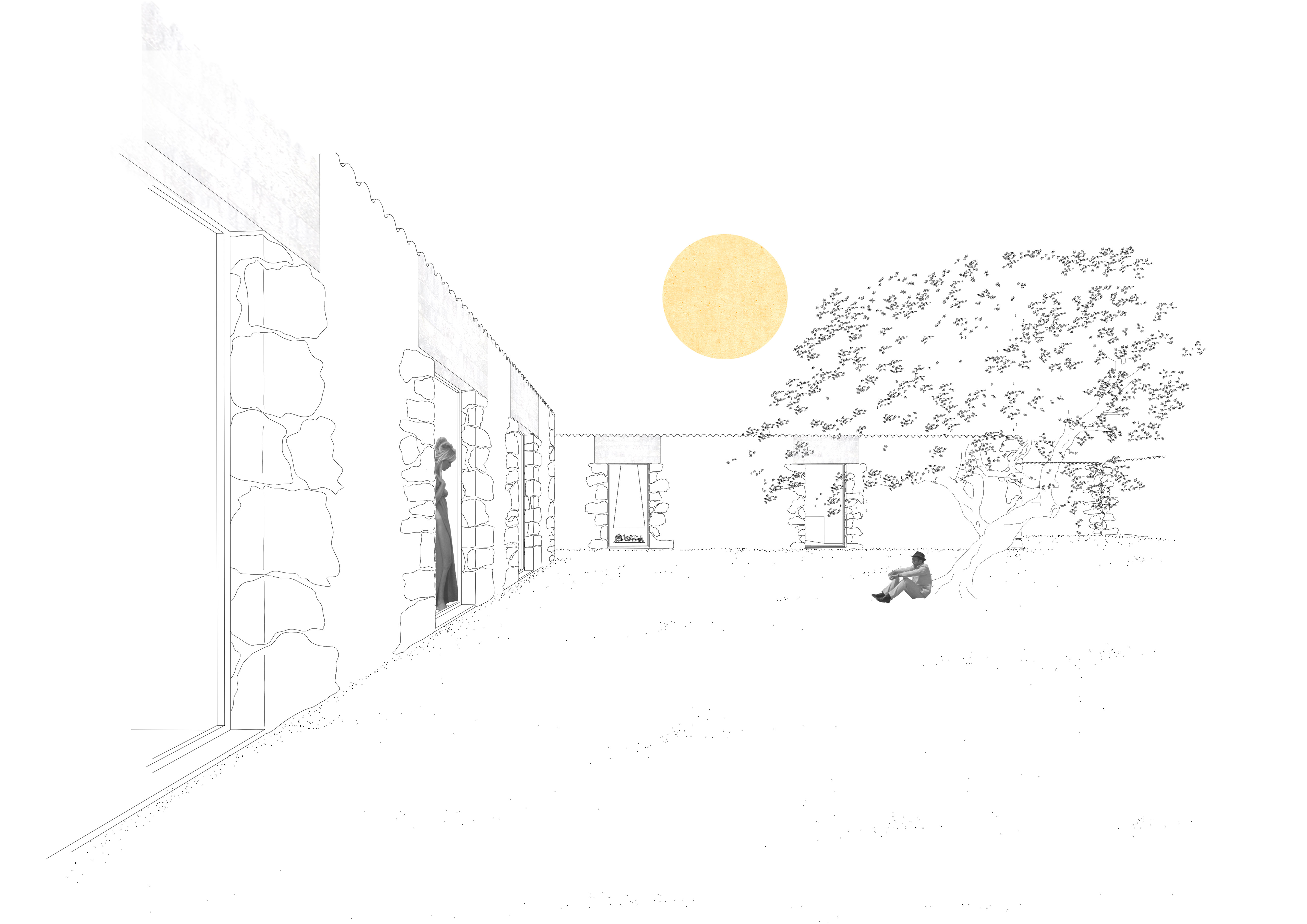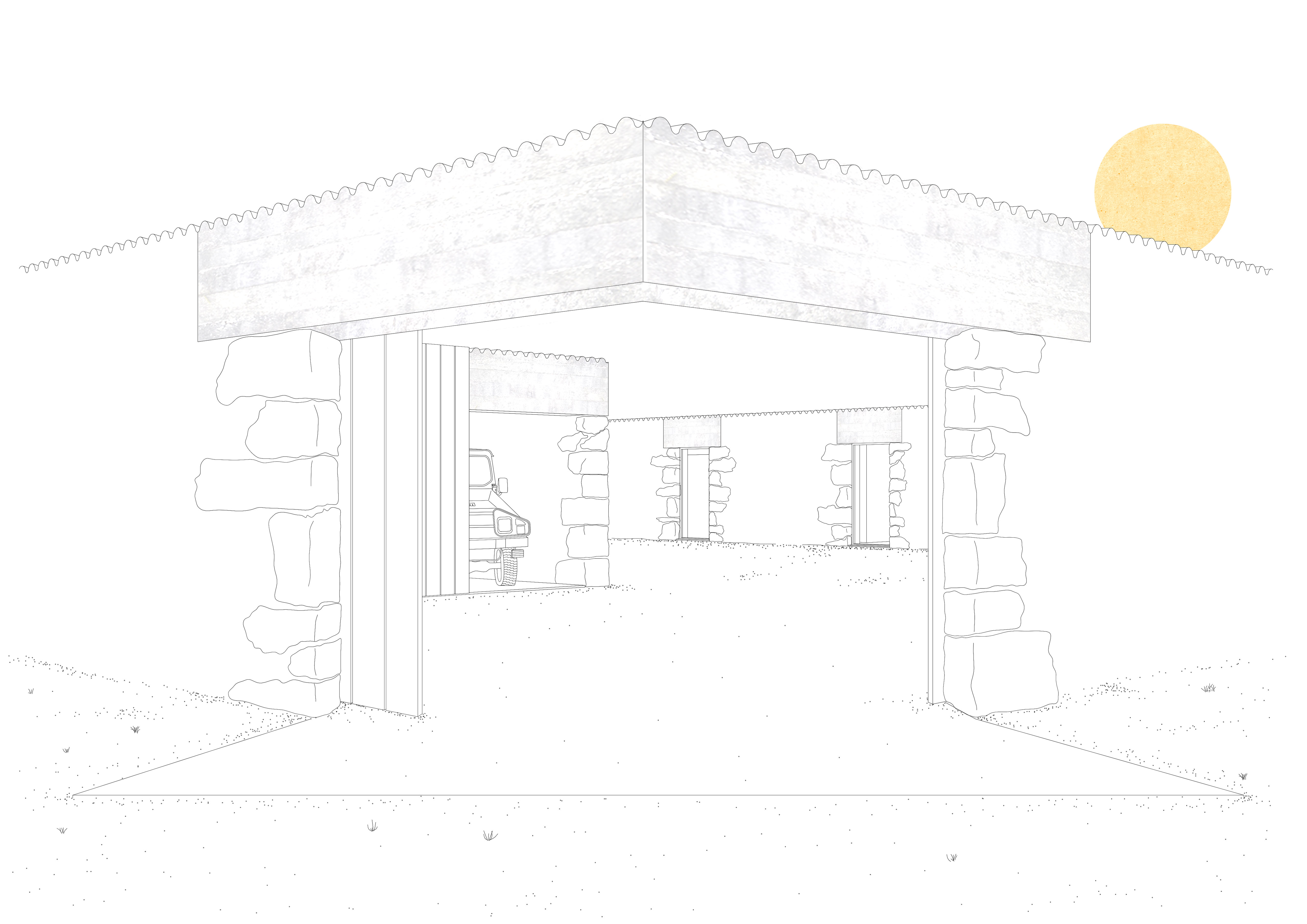 Clad from the outside in a whitewashed stone masonry, the thick walls are capped by an elusive pan tile, suggestive of a pitched roof that in fact does not exist, and an equally calk painted concrete lintel. The roughness of these burnt lime surfaces summons a vernacular and quasi-archaic condition which is nonetheless dismissed by its sheer scale and abstraction.