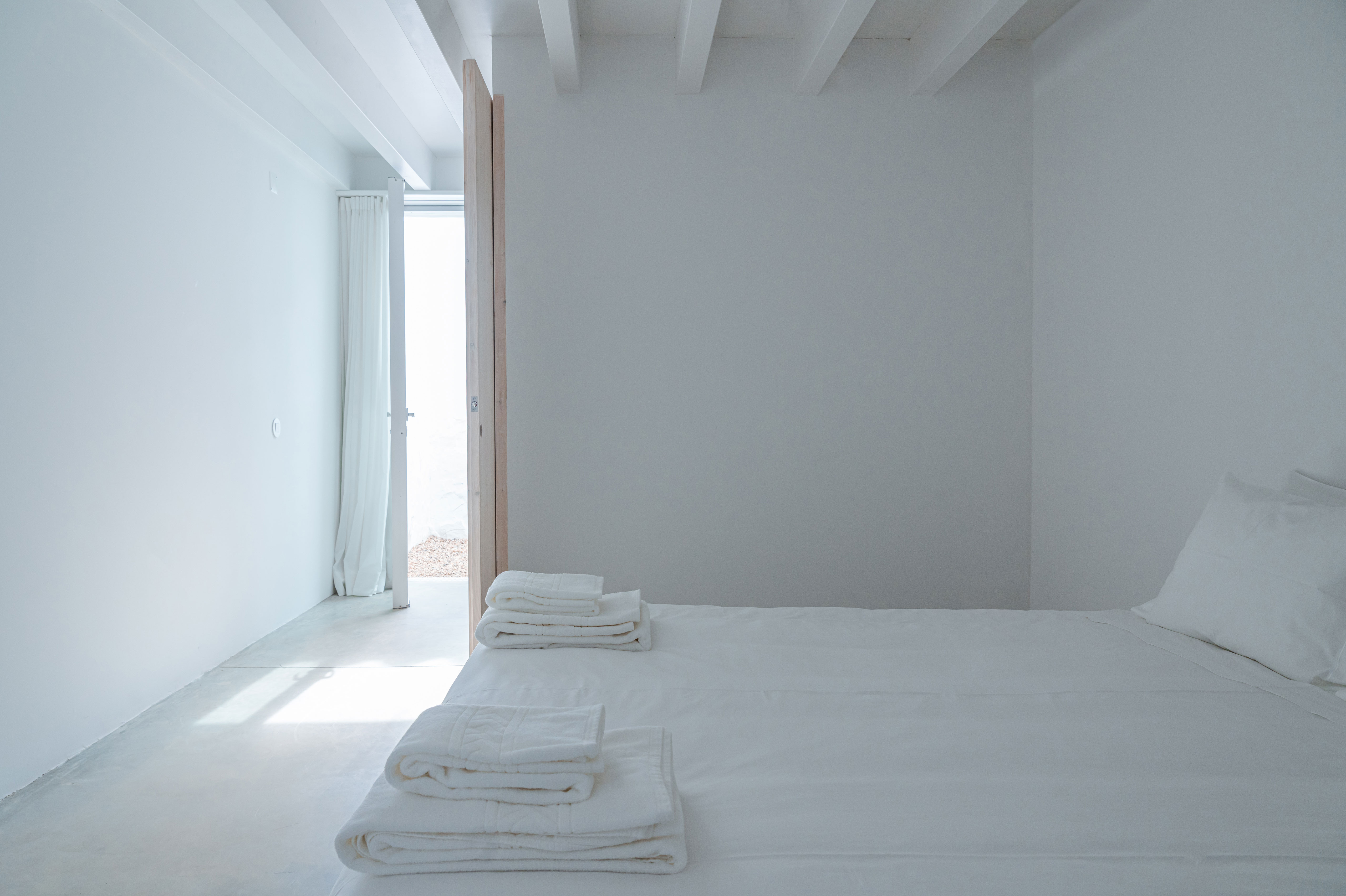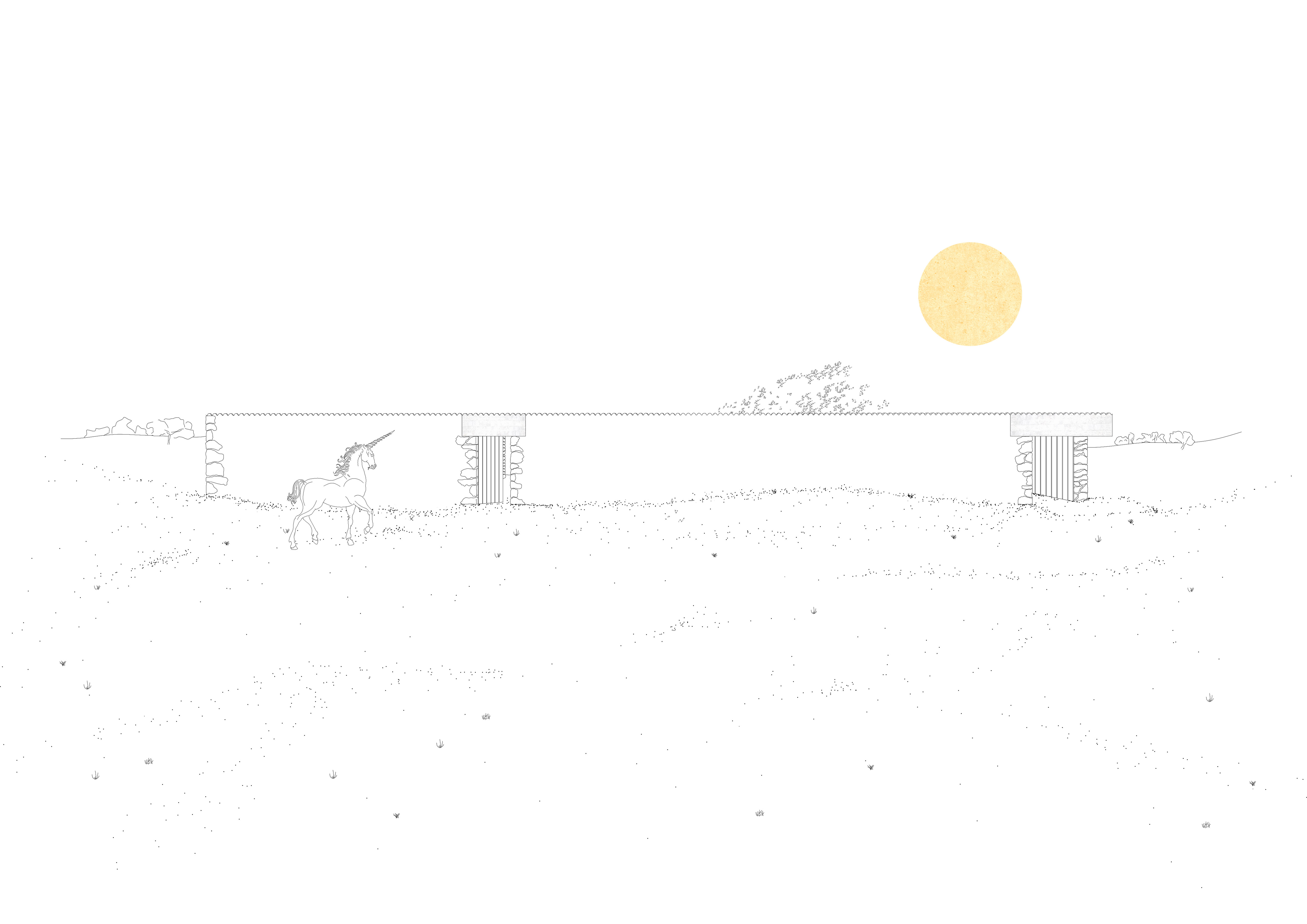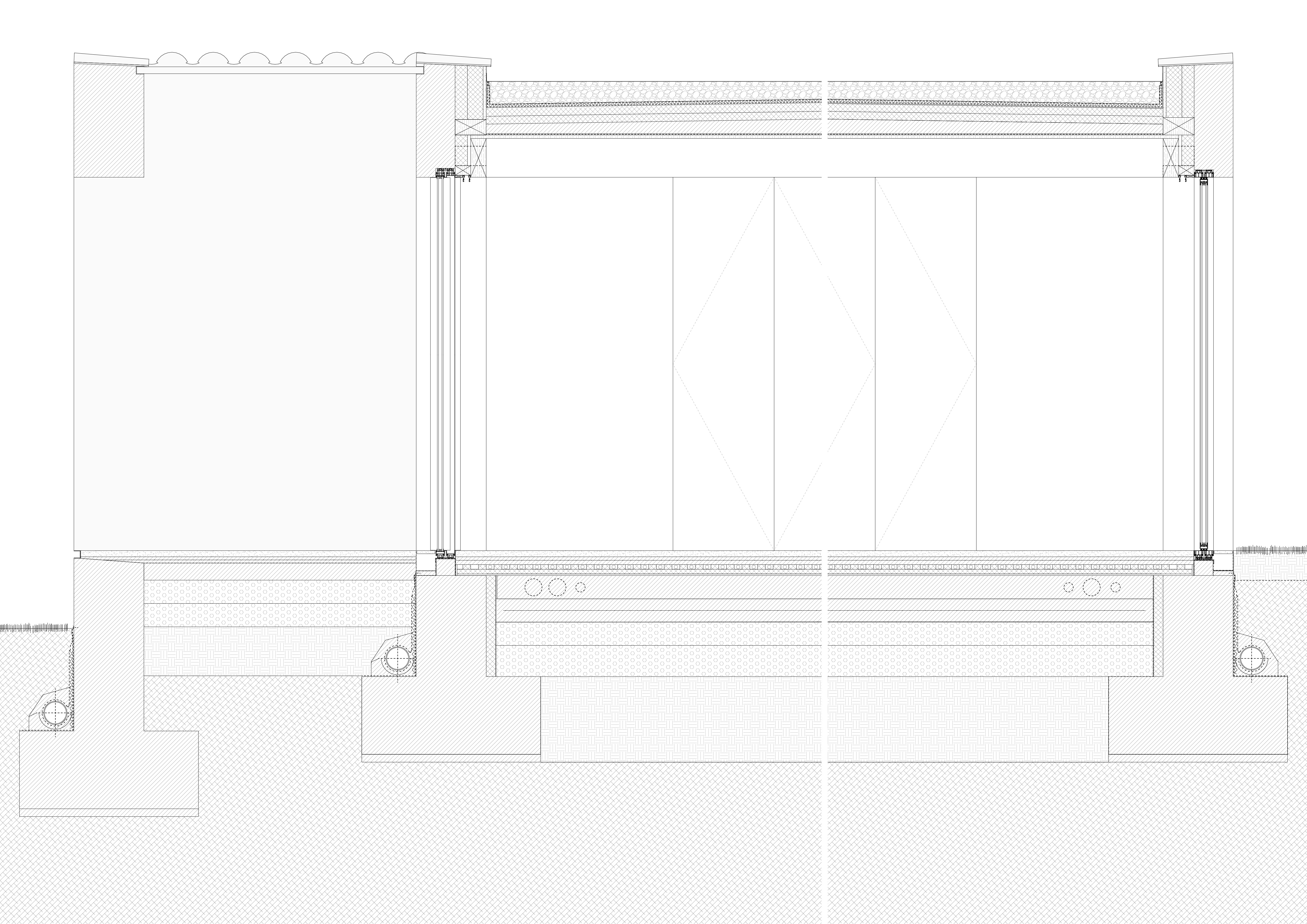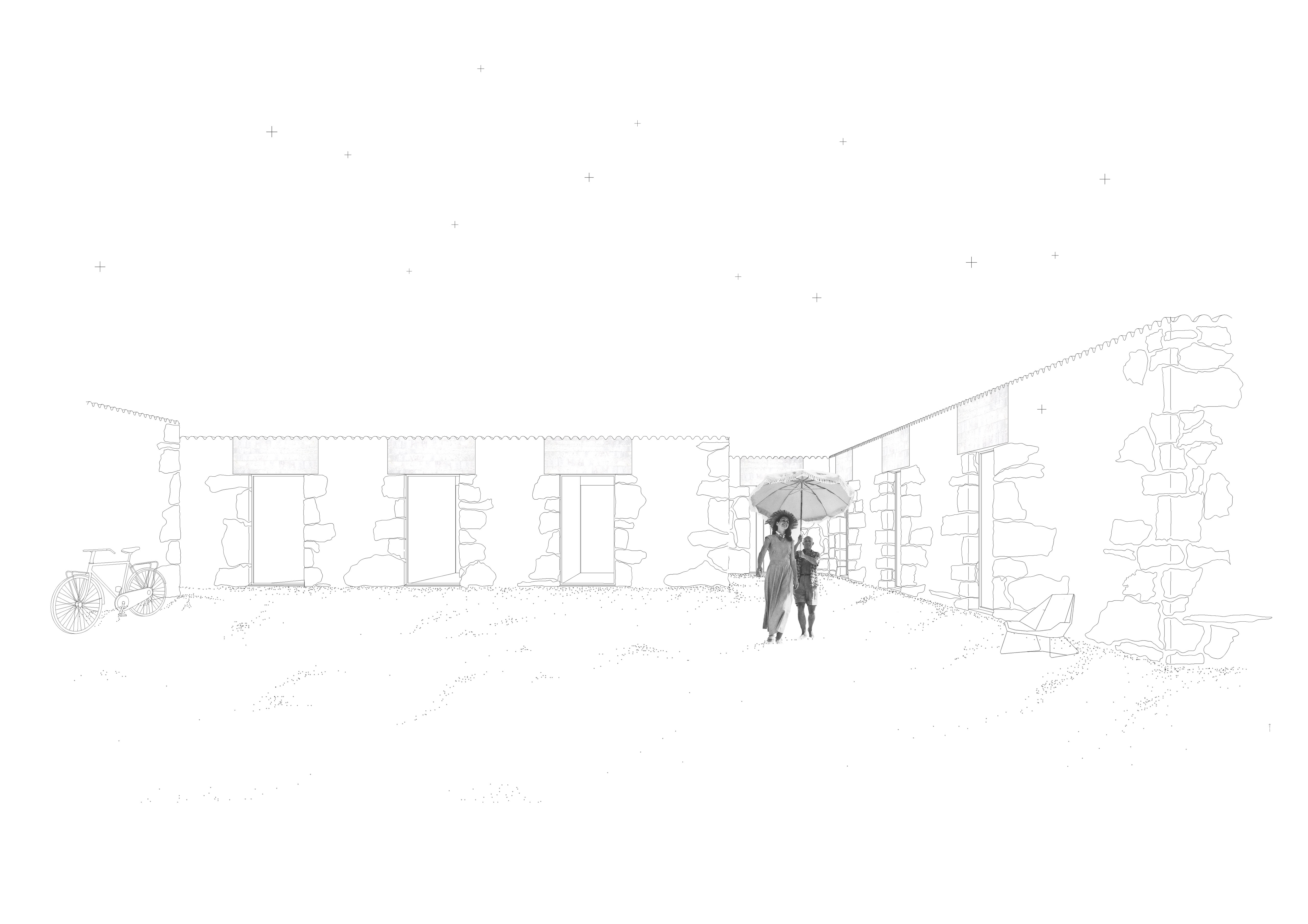 Clad from the outside in a whitewashed stone masonry, the thick walls are capped by an elusive pan tile, suggestive of a pitched roof that in fact does not exist, and an equally calk painted concrete lintel. The roughness of these burnt lime surfaces summons a vernacular and quasi-archaic condition which is nonetheless dismissed by its sheer scale and abstraction.