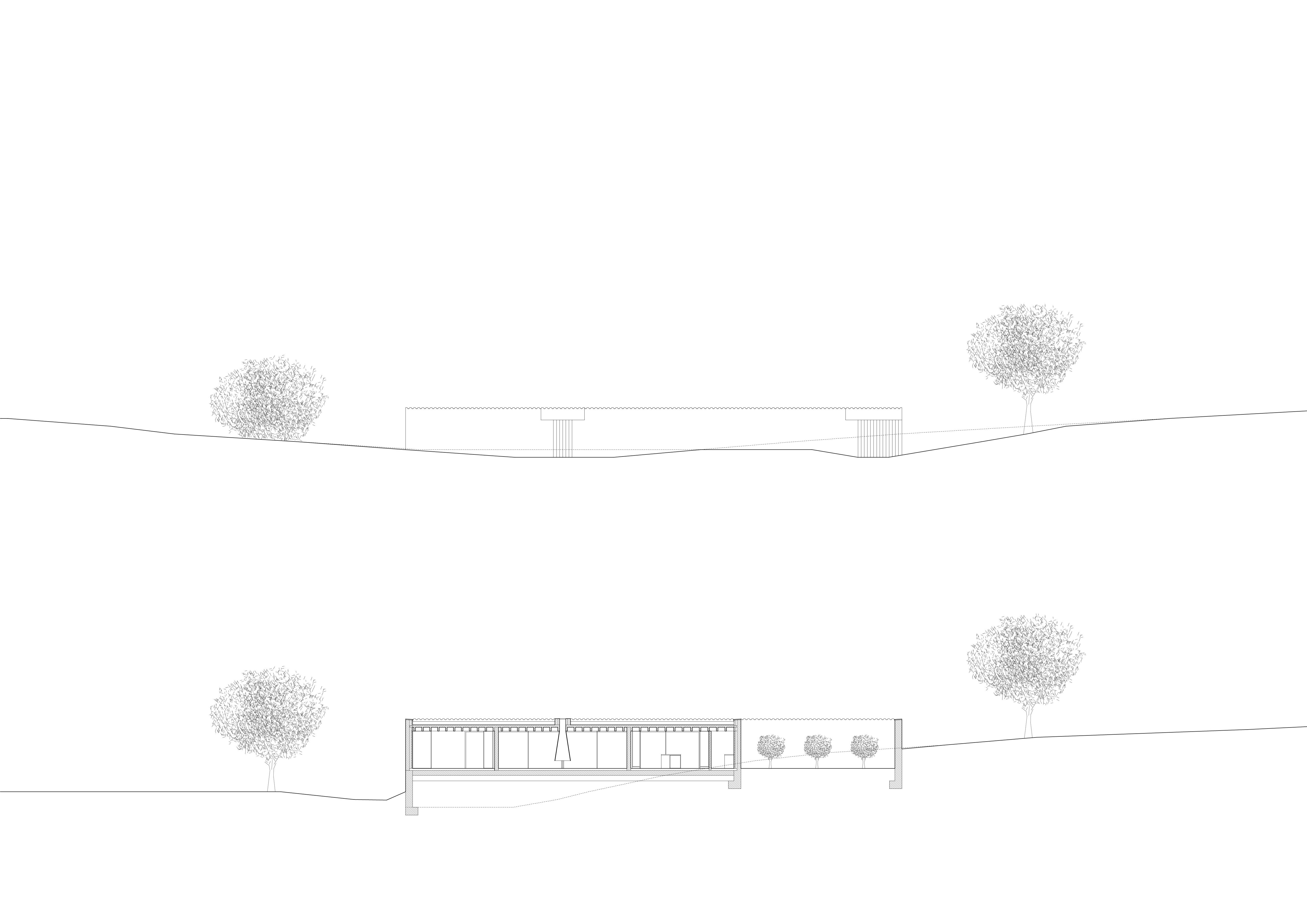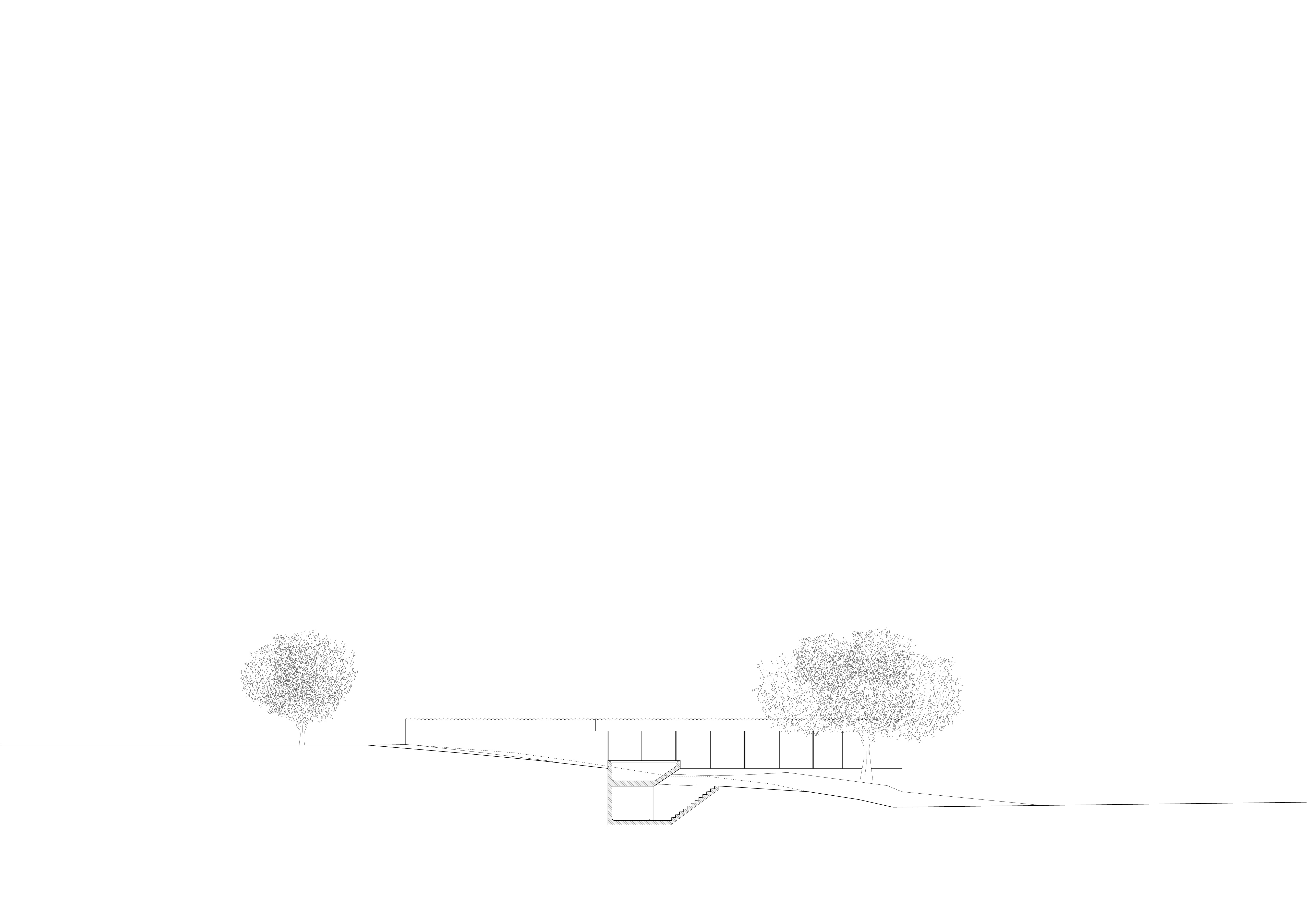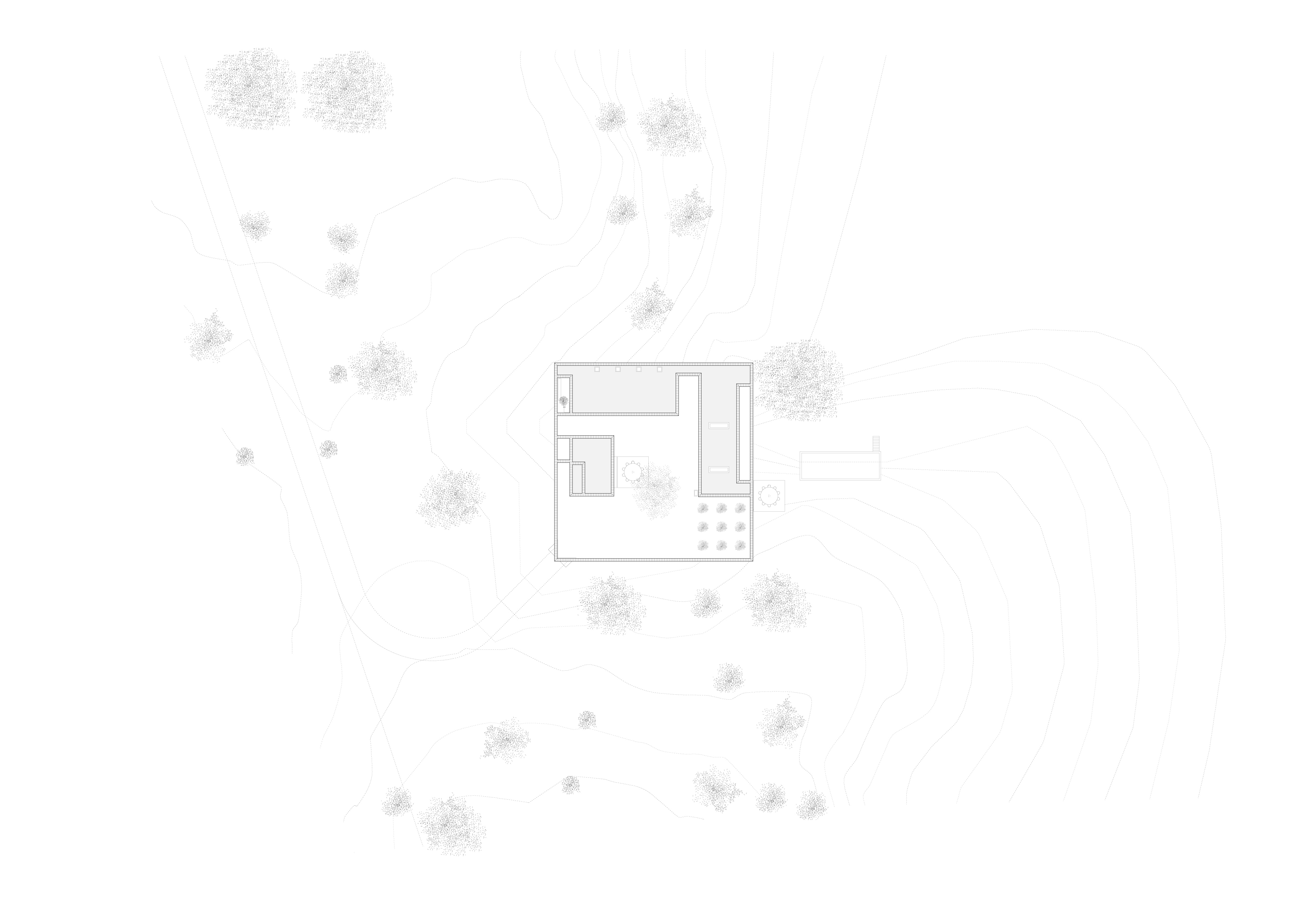 The house is devised as a walled court, onto which a series of inner volumes are set against. The positioning of this court in the landscape was actually constrained by a regulatory distancing from the property limits. Sited on a valley line, it appears half sunk from the Southeast corner, progressively revealing itself towards Northeast. Other than a corner gateway and the small entrance door, the exterior walls barely have openings. An exception is made to the West elevation, as it opens up to a large terrace overlooking the vastness of the landscape and a small creek below.