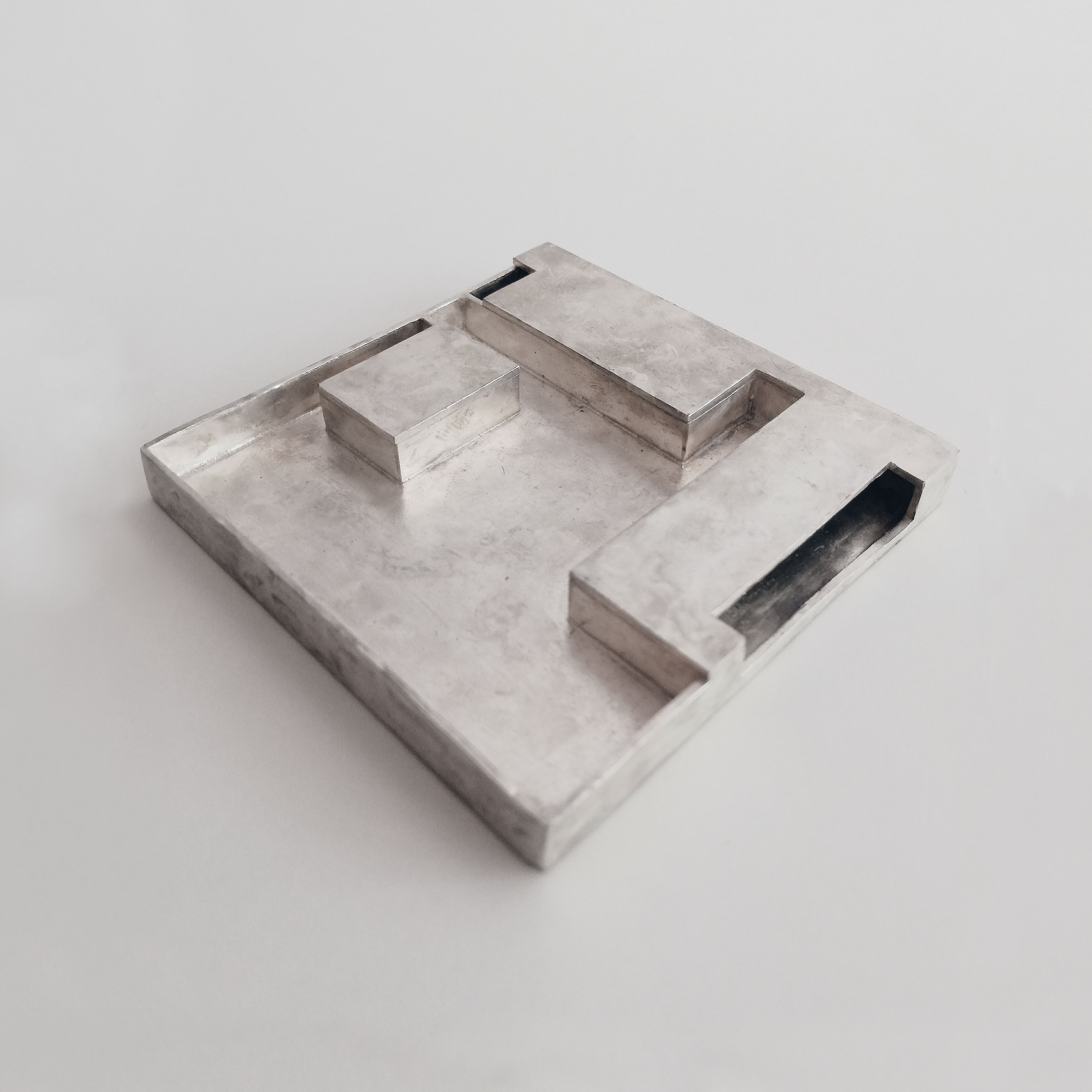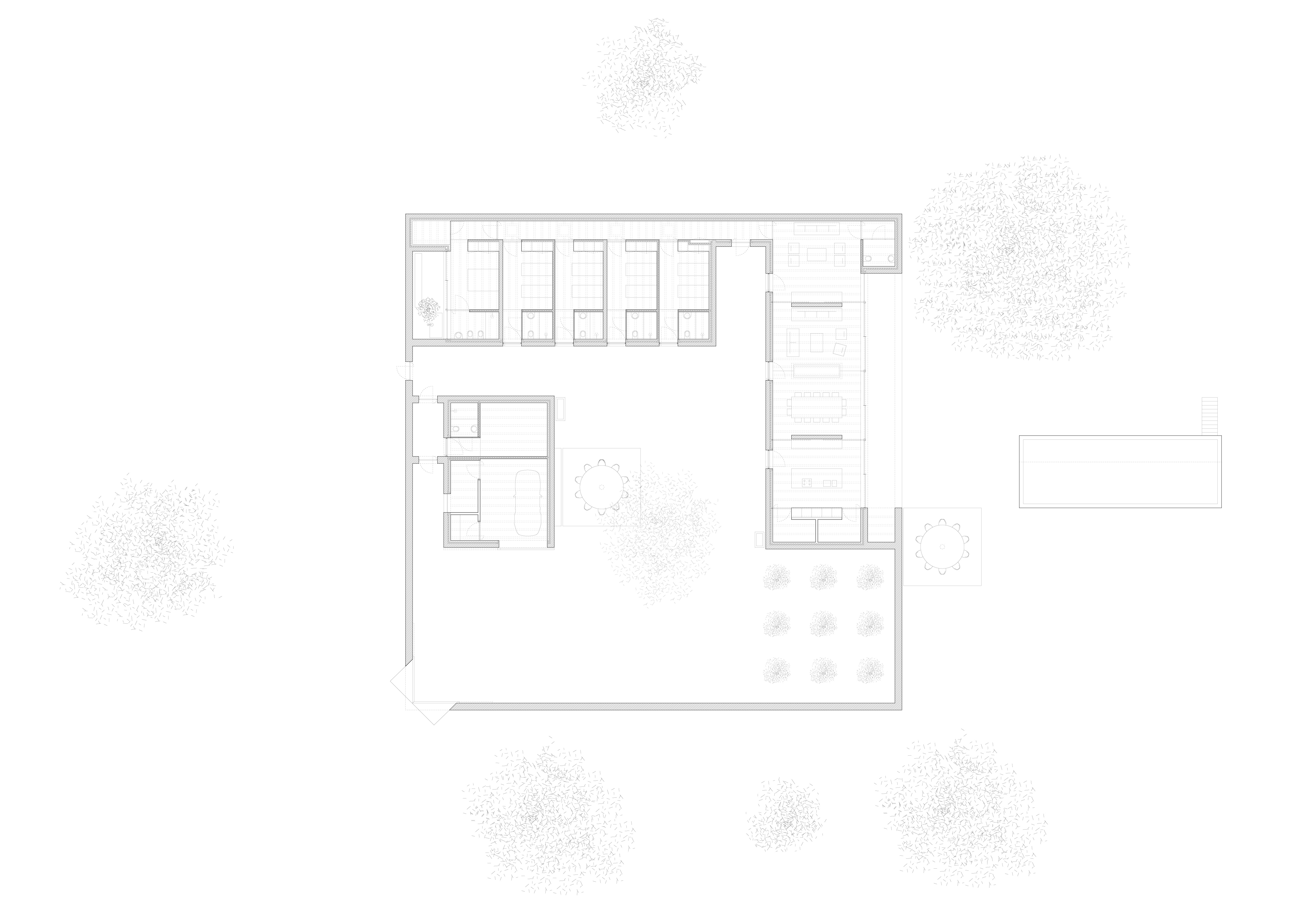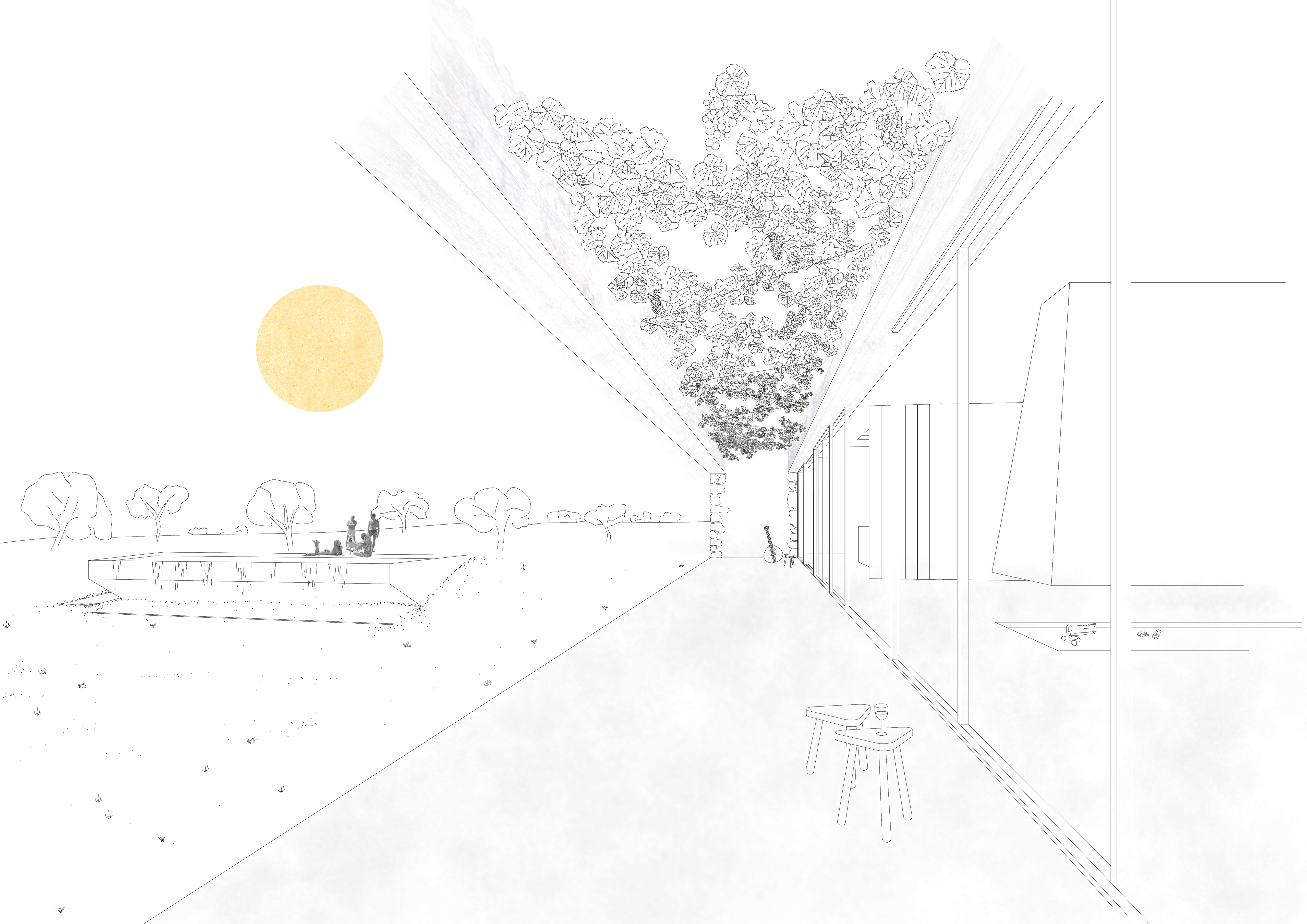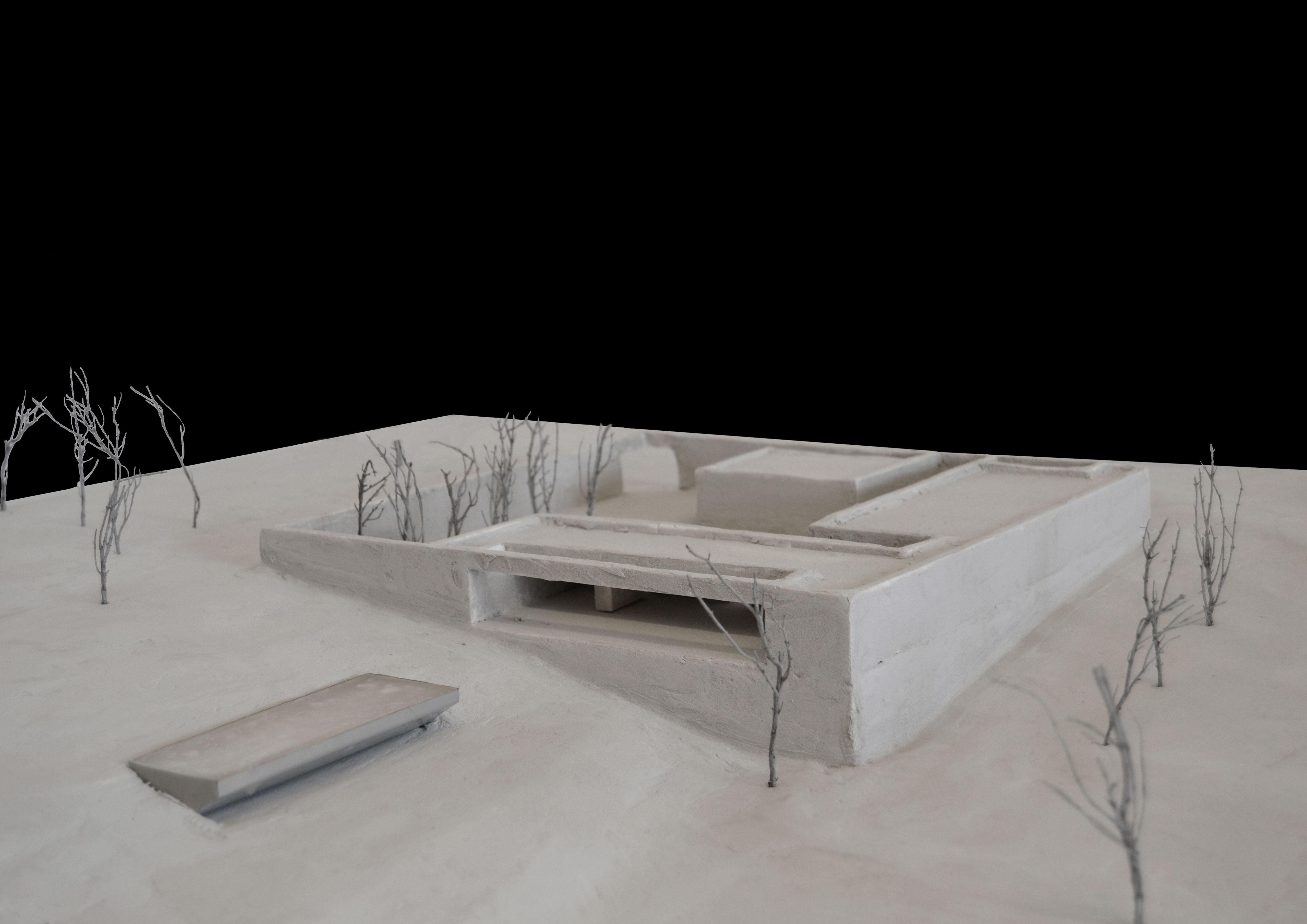 The house is devised as a walled court, onto which a series of inner volumes are set against. The positioning of this court in the landscape was actually constrained by a regulatory distancing from the property limits. Sited on a valley line, it appears half sunk from the Southeast corner, progressively revealing itself towards Northeast. Other than a corner gateway and the small entrance door, the exterior walls barely have openings. An exception is made to the West elevation, as it opens up to a large terrace overlooking the vastness of the landscape and a small creek below.
