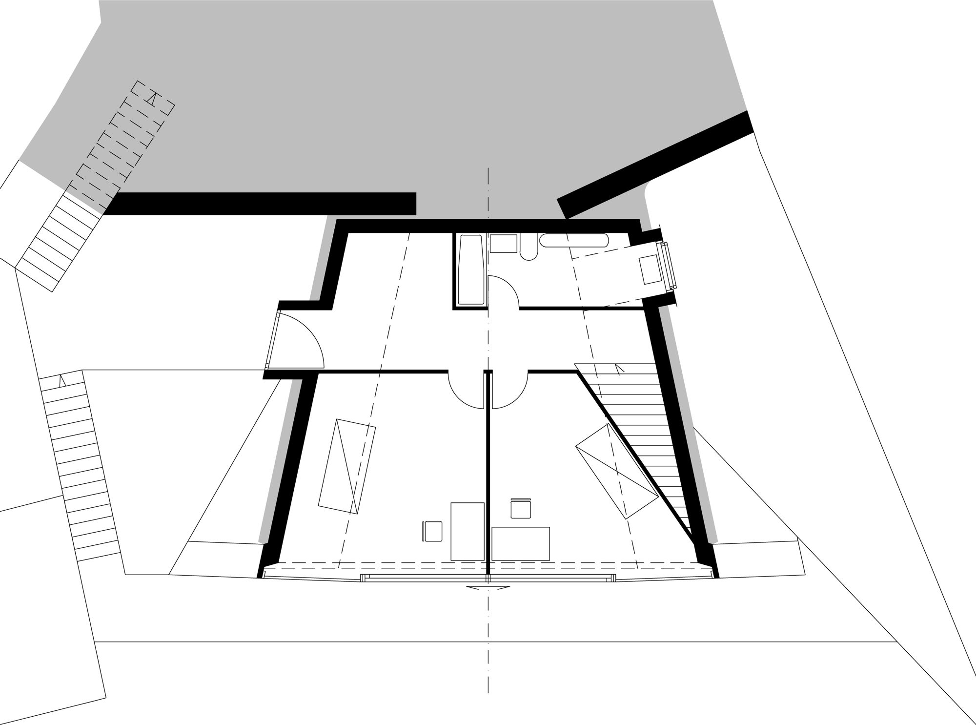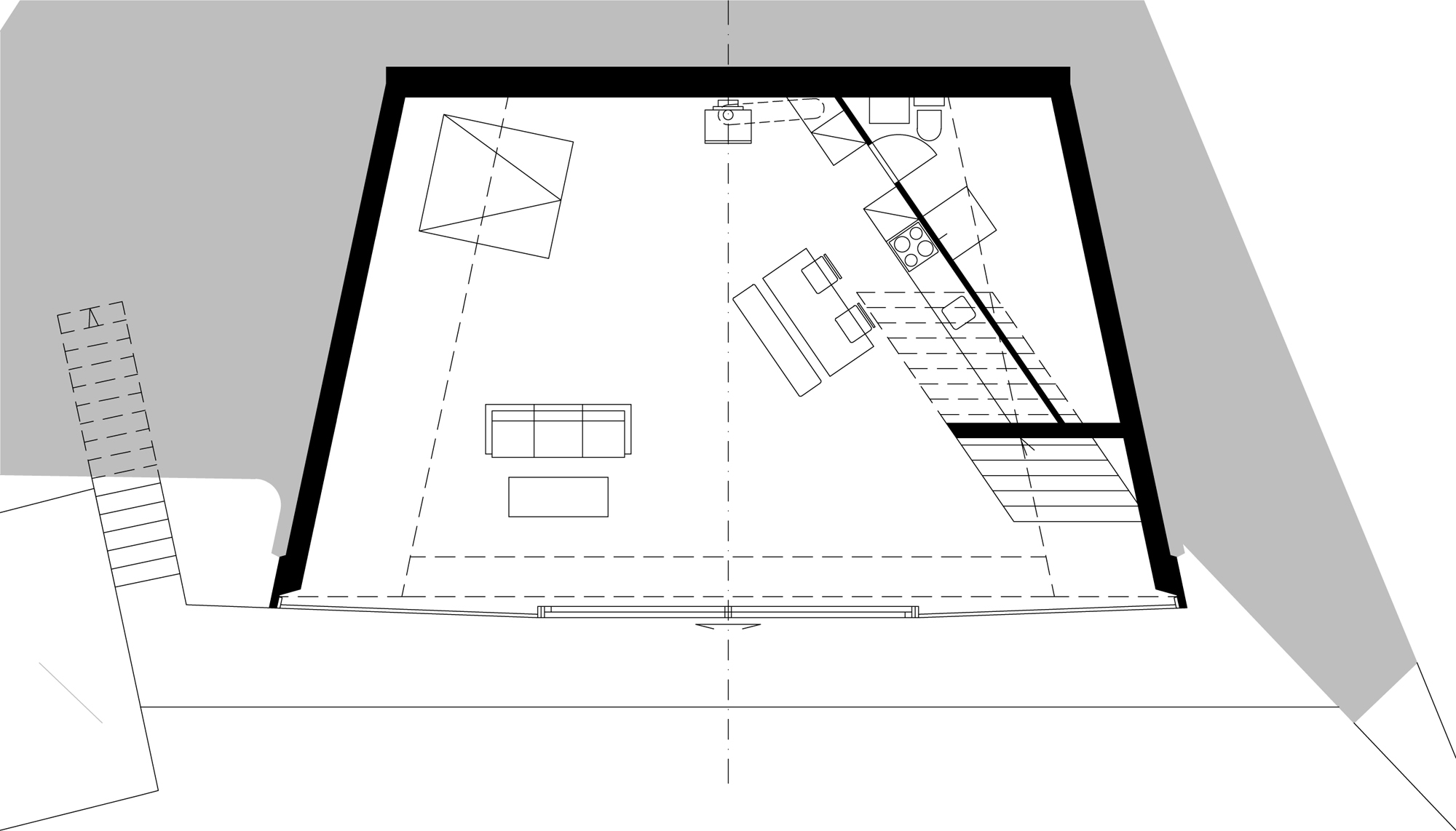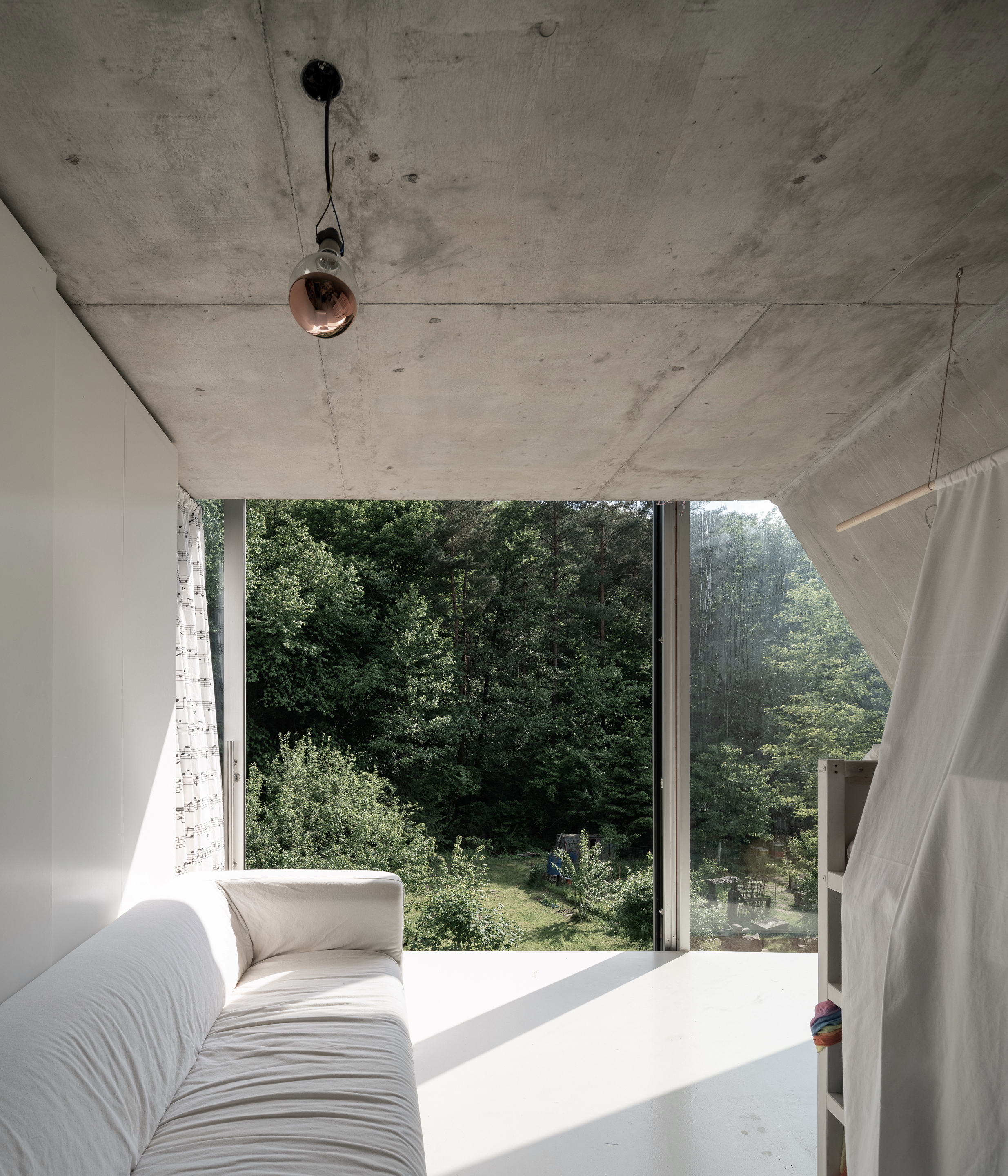 We designed the floor plan of the house in the shape of an isosceles trapezoid, mirroring its longitudinal profile. The interior space is free, divided into two floors connected by a staircase. Downstairs, in contact with the garden, is a multifunctional space in which there is a living room with a work corner and the parents’ bedroom, a kitchen with a dining room and the technical background of the house. On the upper floor there are two children’s bedrooms, a bathroom and an entrance area. All living rooms are oriented through large windows in the southern direction towards the garden and the forest.