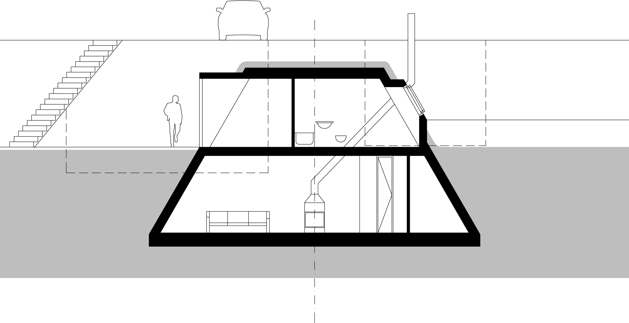 The construction of the house is a concrete shell (without internal supports), made of monolithic concrete, which is admitted in the interior. The only facade of the house is a glass wall in the south direction, through which it communicates with its surroundings. The other areas of the house are grassed and blend in with the terrain.