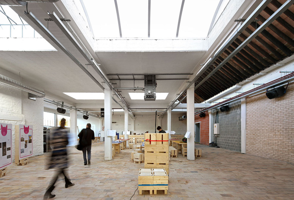 The first hollows out a large void in the centre of the building, bringing daylight deep into the vast floor plan. This pentagonal void houses a public staircase that gives access to a diverse range of spaces on four levels: a laboratory for manufacturing, multifunctional spaces of varying sizes and lighting conditions, music venues and a roof terrace. The biggest part of the structure is reused. Besides saving resources, the reuse allows for a large cultural building within a limited budget.