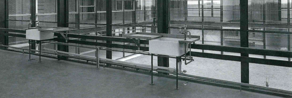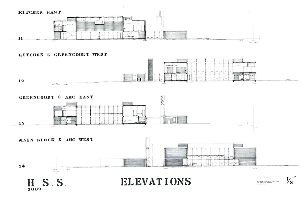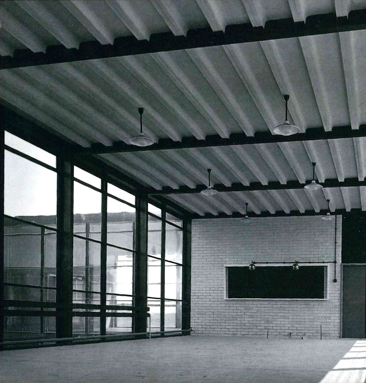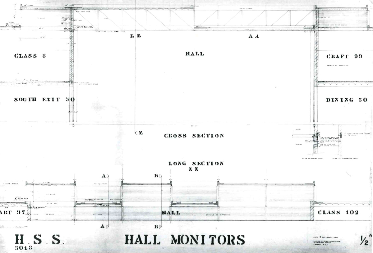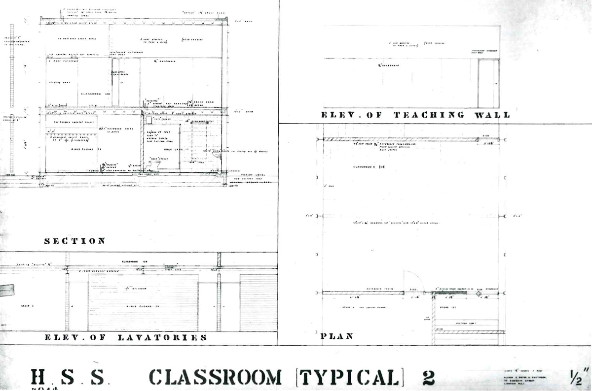 This grouping allows the circulations of the hall, the dining areas, and the school generally to be superimposed, resulting in a compact and economical plan: on the first floor it is impossible to be more than twenty-five feet from a stair escape. No doors open onto the greencourts, only hopper windows for ventilation, as no children’s movement is to be there; the green courts are light areas, quite free from noise.”