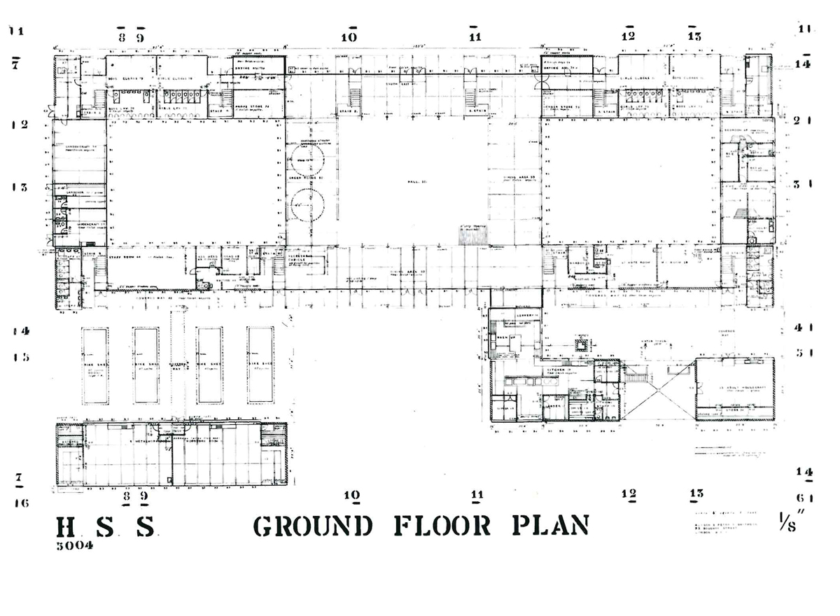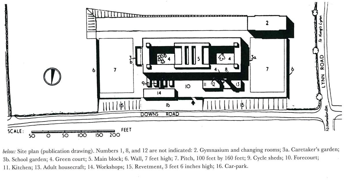 In the report submitted with the competition we wrote: “This school is an attempt to carry beyond the diagrammatic stage into a work of architecture, and its form is dictated by a close study of educational needs and purely formal requirements rather than by precedent. The core of school is the assembly hall, which flows freely into the dining areas and entrance areas, carrying into the school the planes of the forecourt, the green courts, and the playing fields.