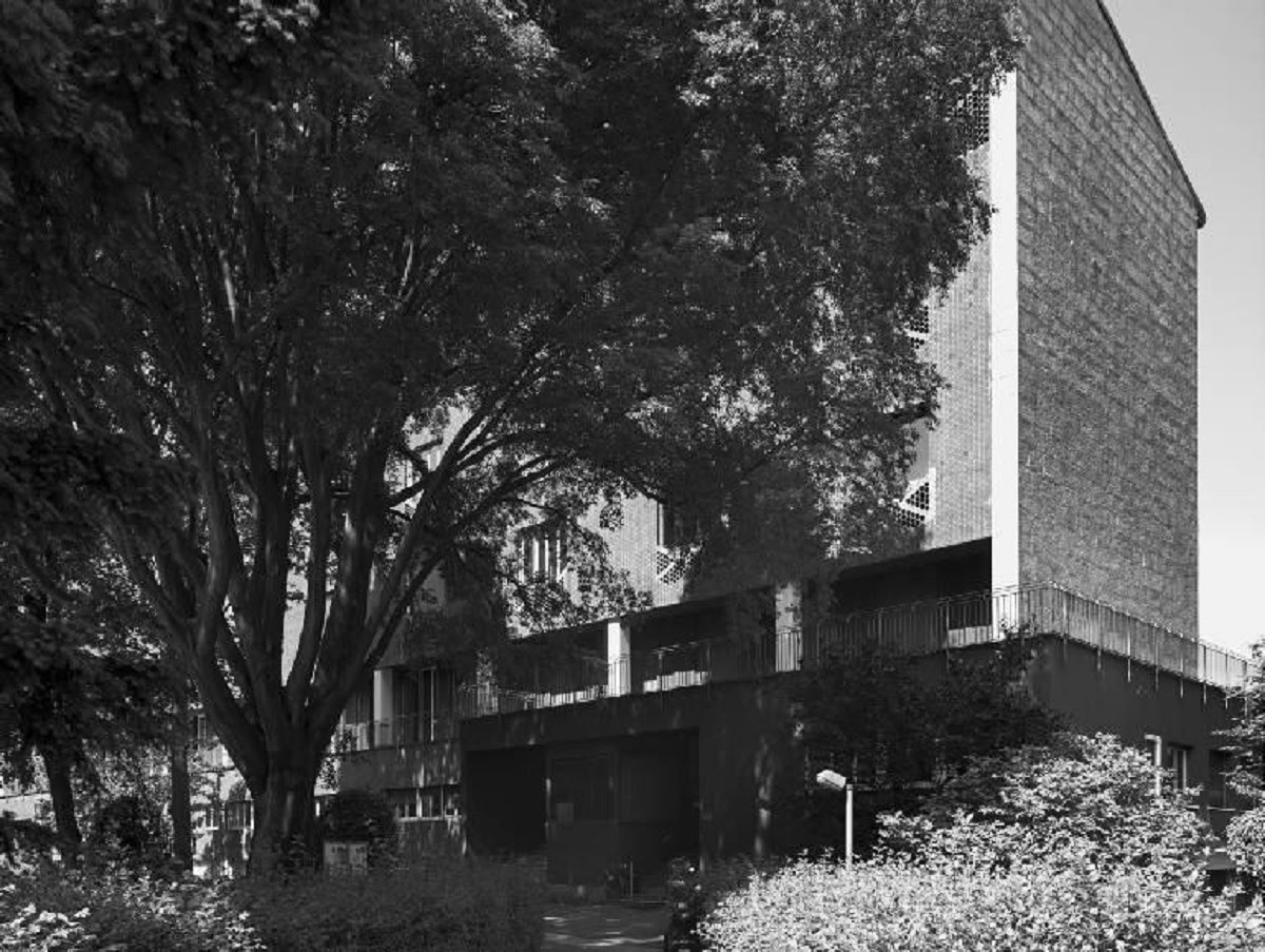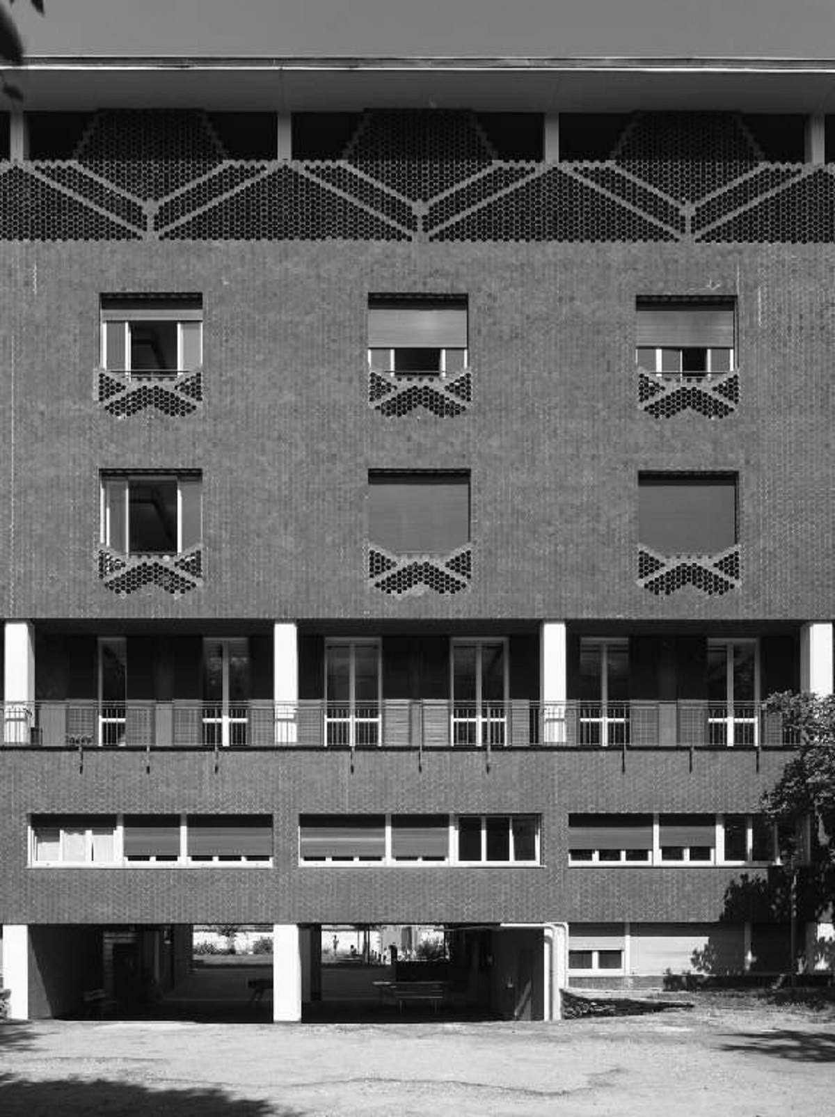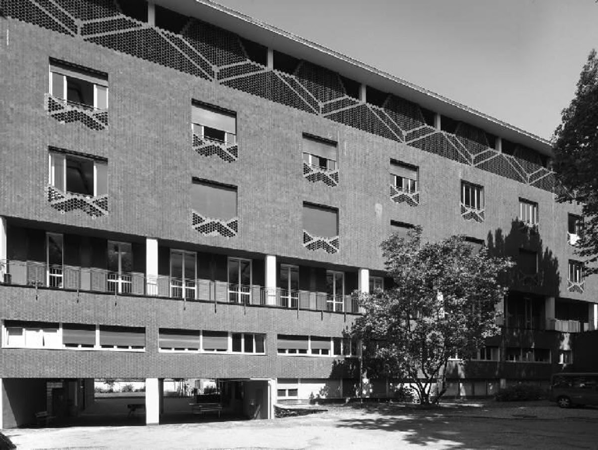 Completado en 1955 y ejecutado por fases, el proyecto se compone de un volumen en barra de cinco plantas con tres apéndices traseros de escaleras y servicios.