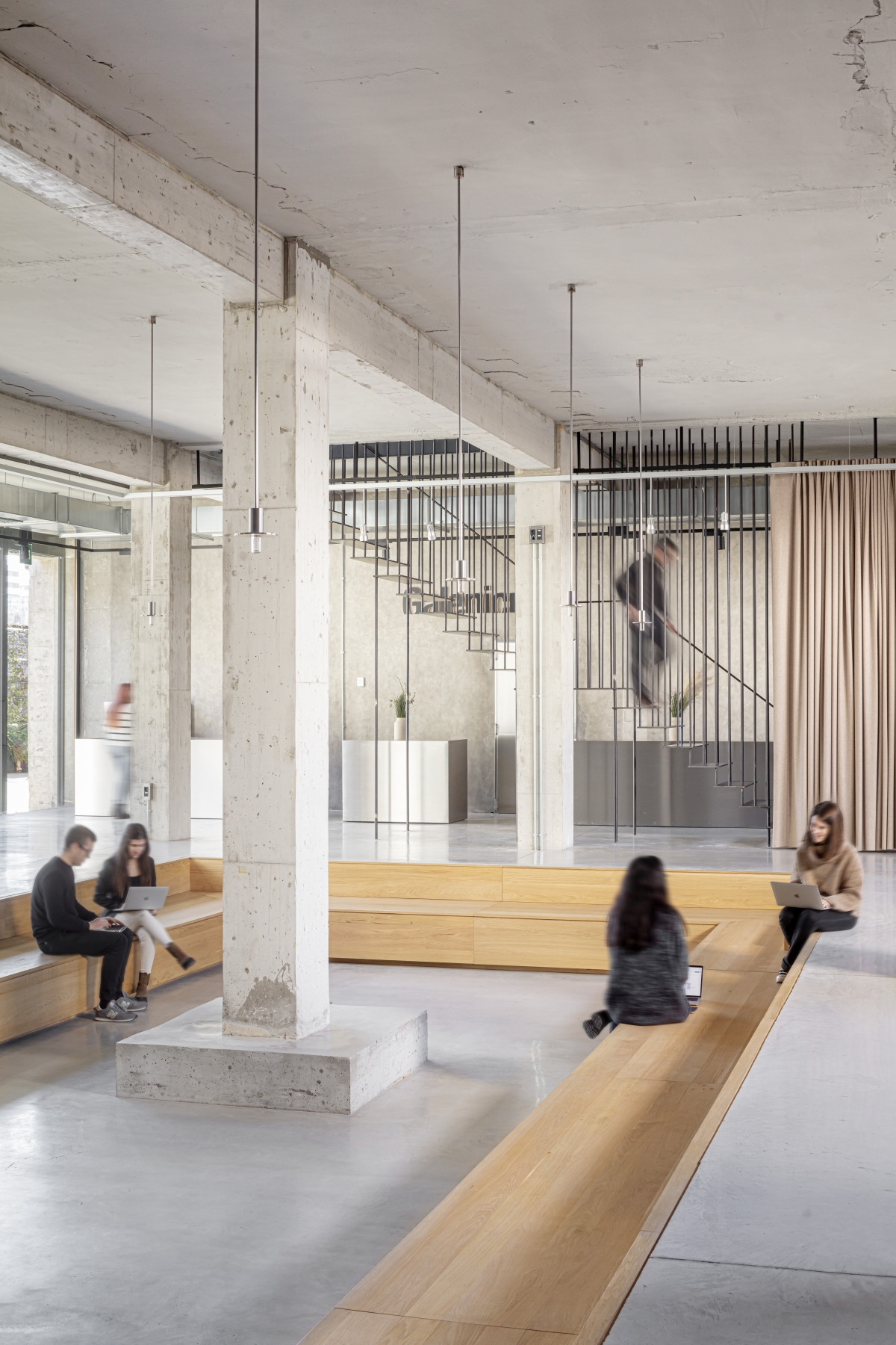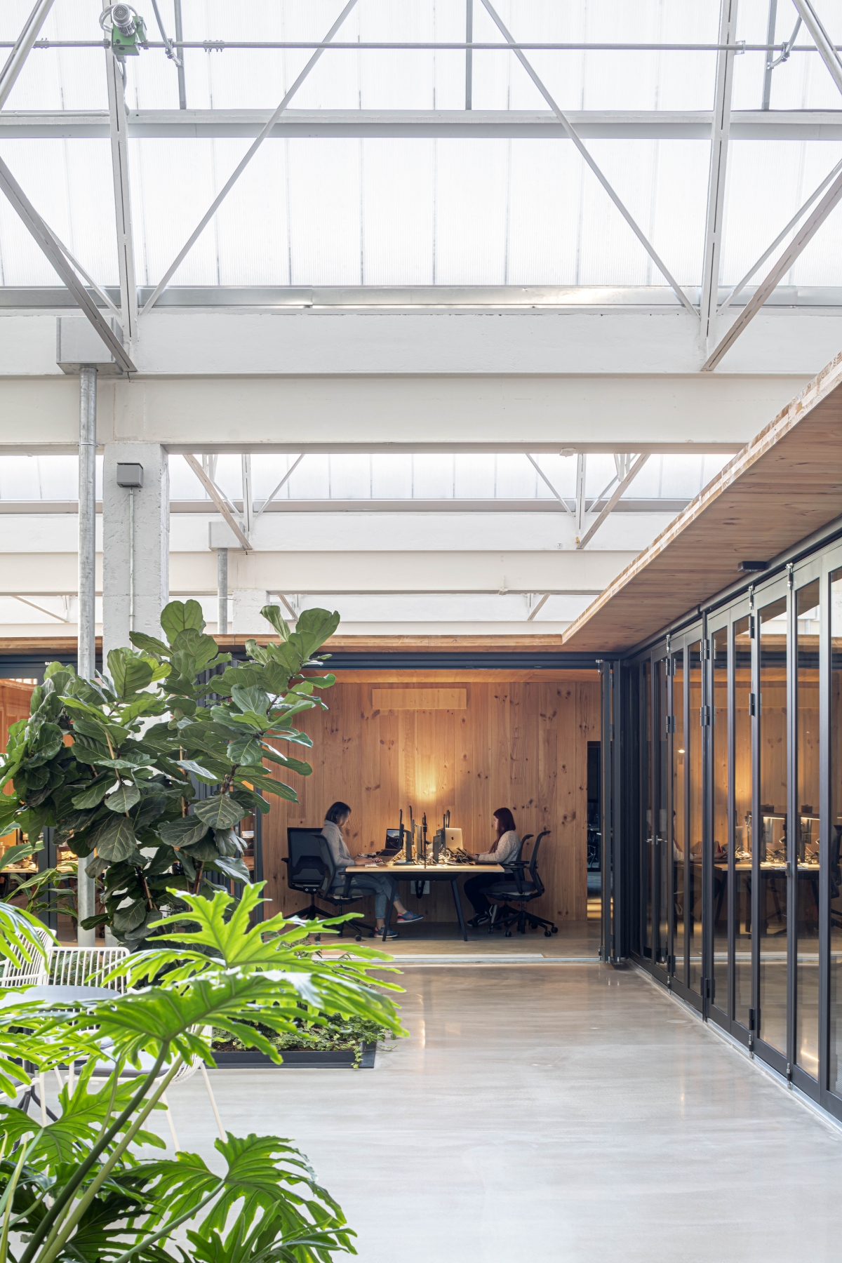 This type of industrial building usually has a lot of space and light but poor shelter from the elements, making it expensive to heat and hard to organise when the nuances of a company with 140 staff members, a dozen departments and major short-to-medium term growth are factored in. For this type of space and brief, the air must be ‘hierarchized’ in a climatic gradient, and work must be well-distributed for organizational and comfort purposes.