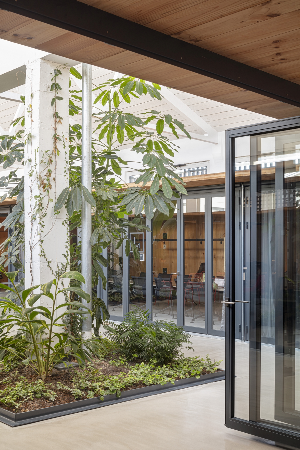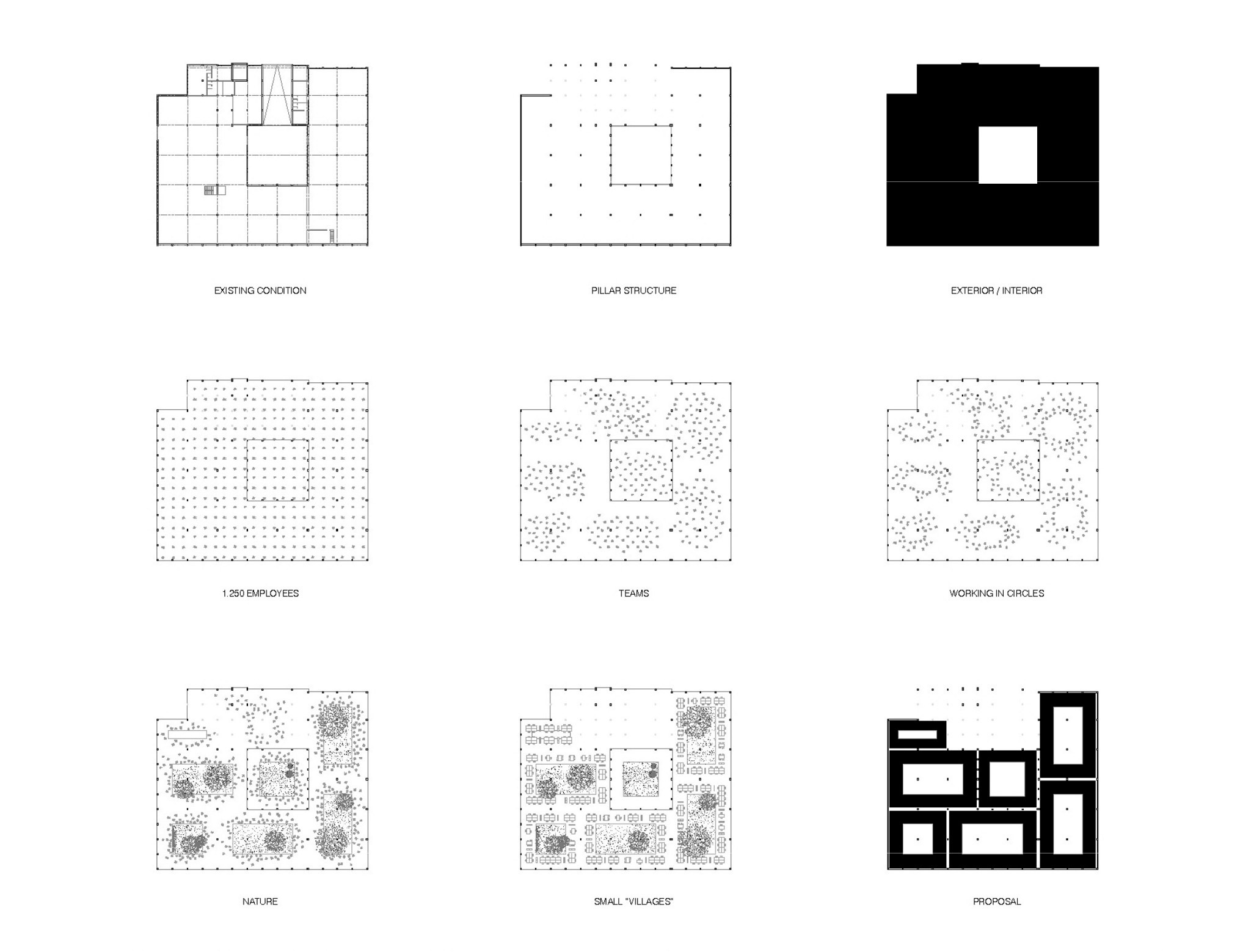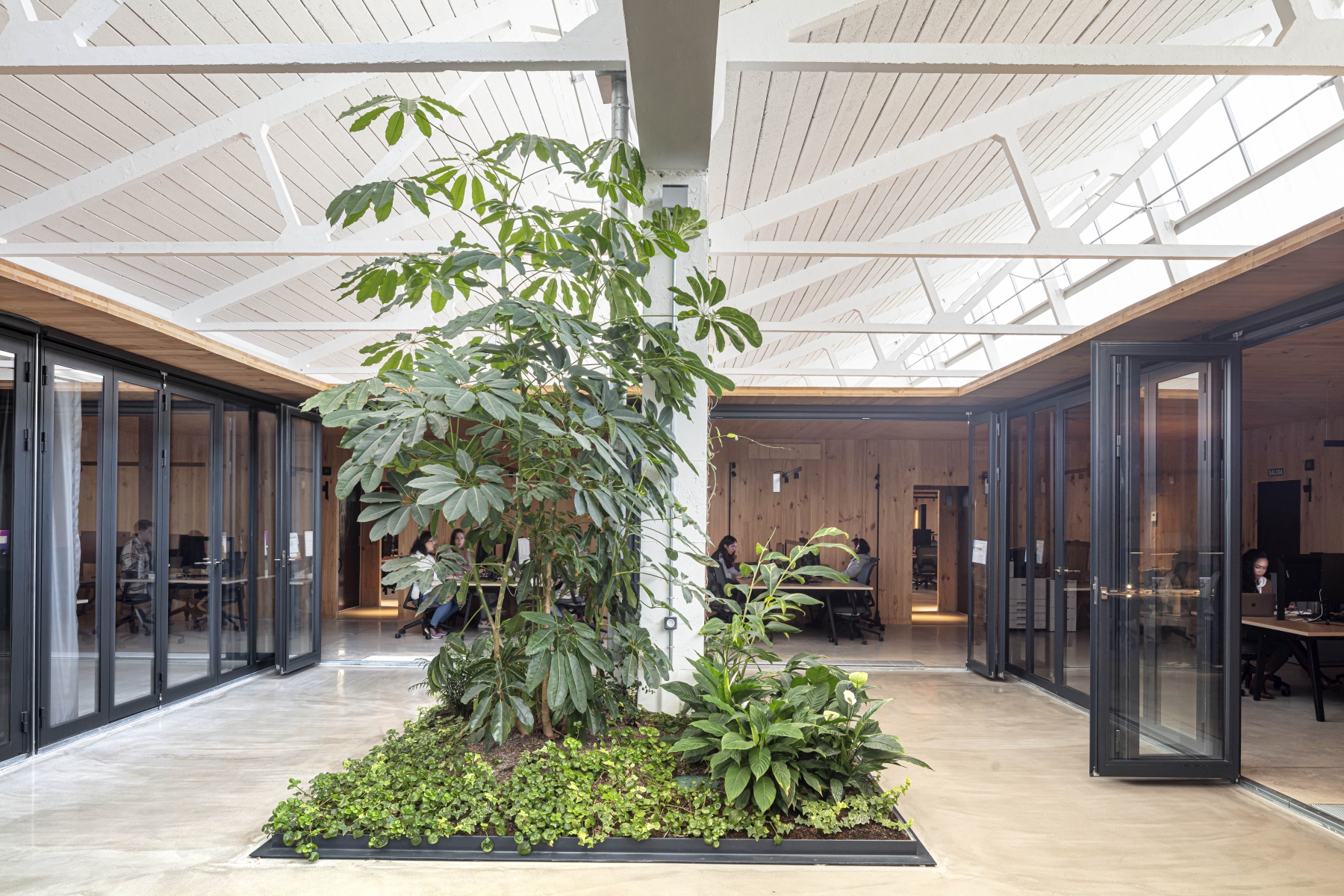 In order to distribute the open, undifferentiated floor plan around the courtyard both climatically and spatially, the project includes the client’s desire to organise the different departments in families or ‘tribes’ with different synergies. The proposal calls for these tribes to work in a circle around an unprogrammed space with a strong vegetation-related component. This layout admits the idea of the group, of horizontal relationships between people. It also facilitates the creation of work environments for small numbers of colleagues, leading to less noisy atmospheres. In the centre of the group is the void, a free space where the rest of the activities take place.