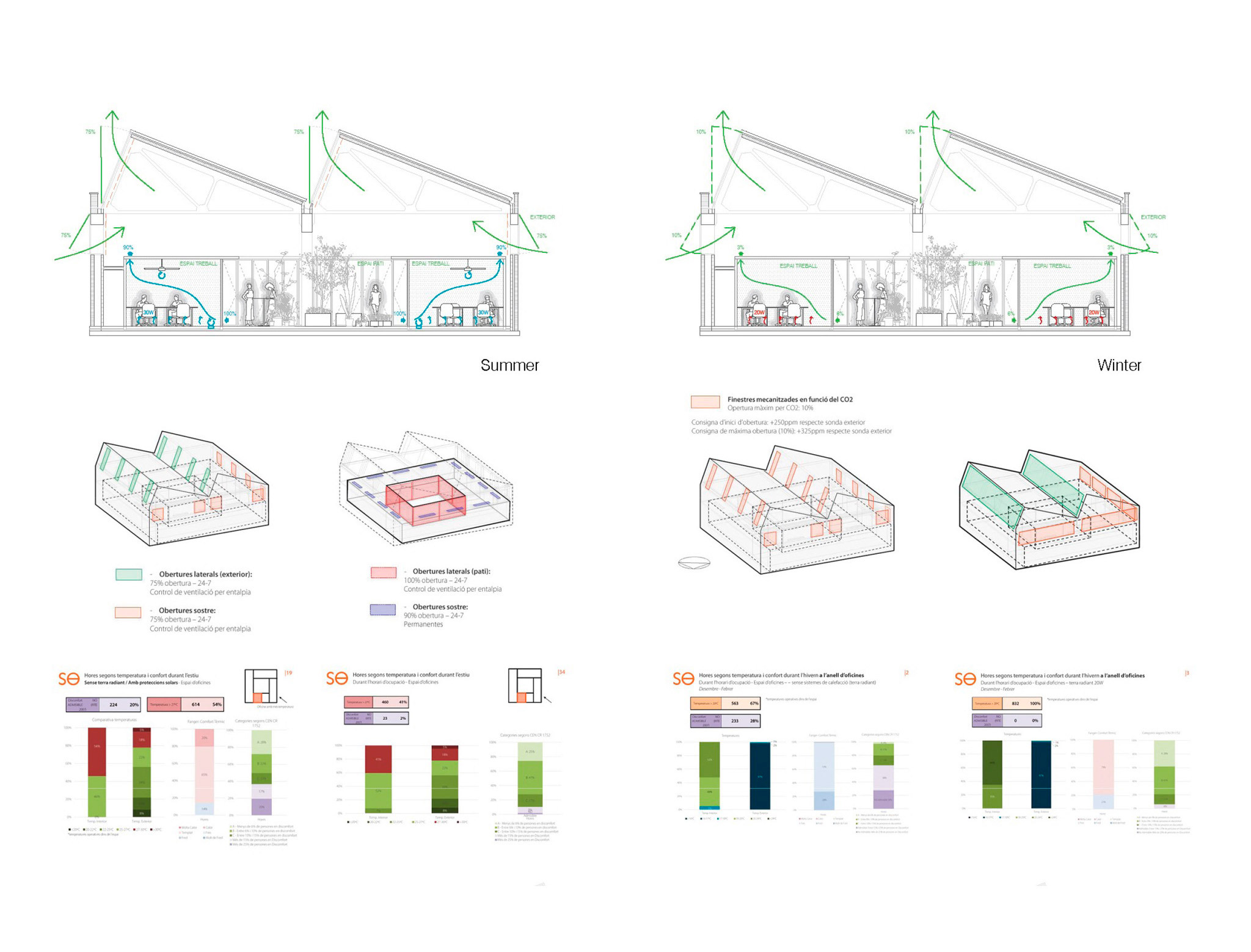 Climate control for the whole volume is not viable. The project therefore aims to improve the conditions of the enveloping walls to temper the precinct. This requires a pre-treated primary air renewal process for the active climate in the restricted work zones, a feasible option in these controlled spaces.