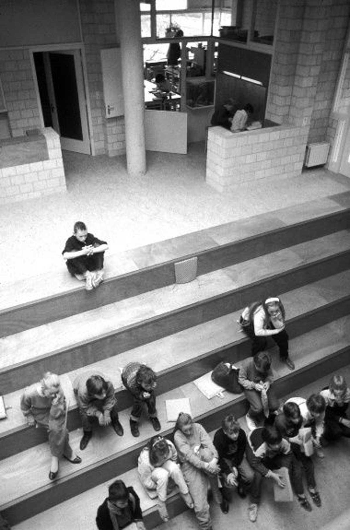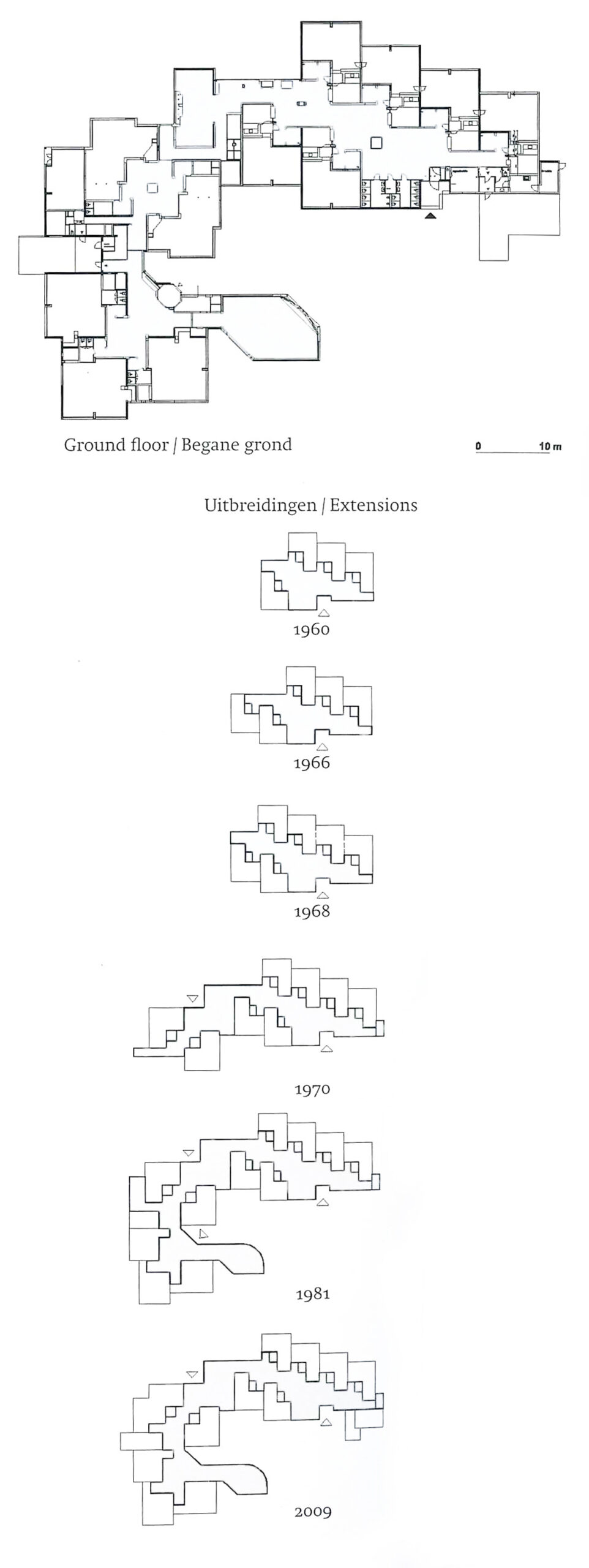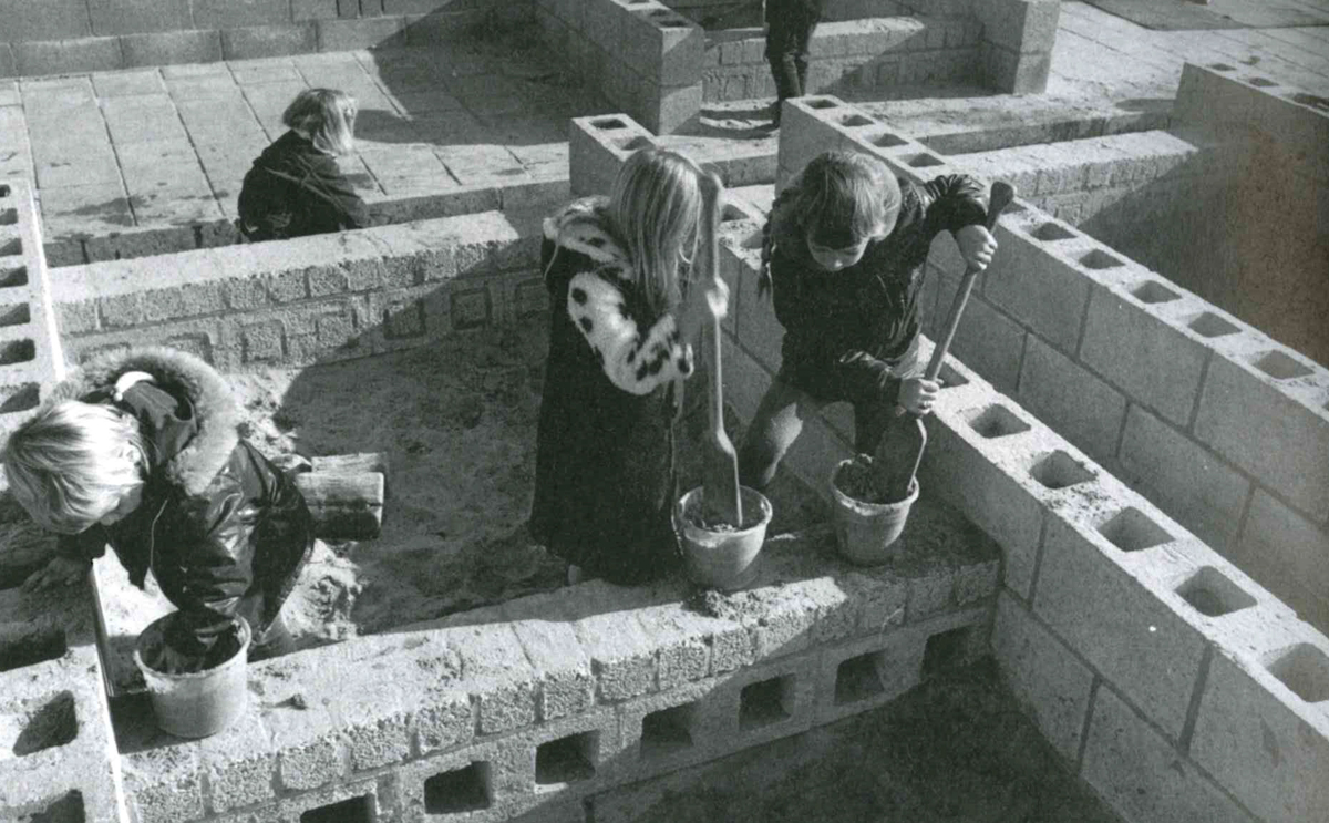 Montessori education requires as many places for individual activities as possible. It was high time a spatial solution was divised to this problem, in the form of a classroom with many corners and different zones- in other words, different from the traditional rectangle. If areas are linked around a hall, this will create, both there and outside, a whole series of corners and ultimately a highly articulated building mass that will be relatively easy to expand. This led each time afresh to a new structure which, tough fairly amorphous, did not lack clarity, and which, because of its extreme articulation, acquired a city-like aspect, with each classroom acquiring a unique appearance from the outside.