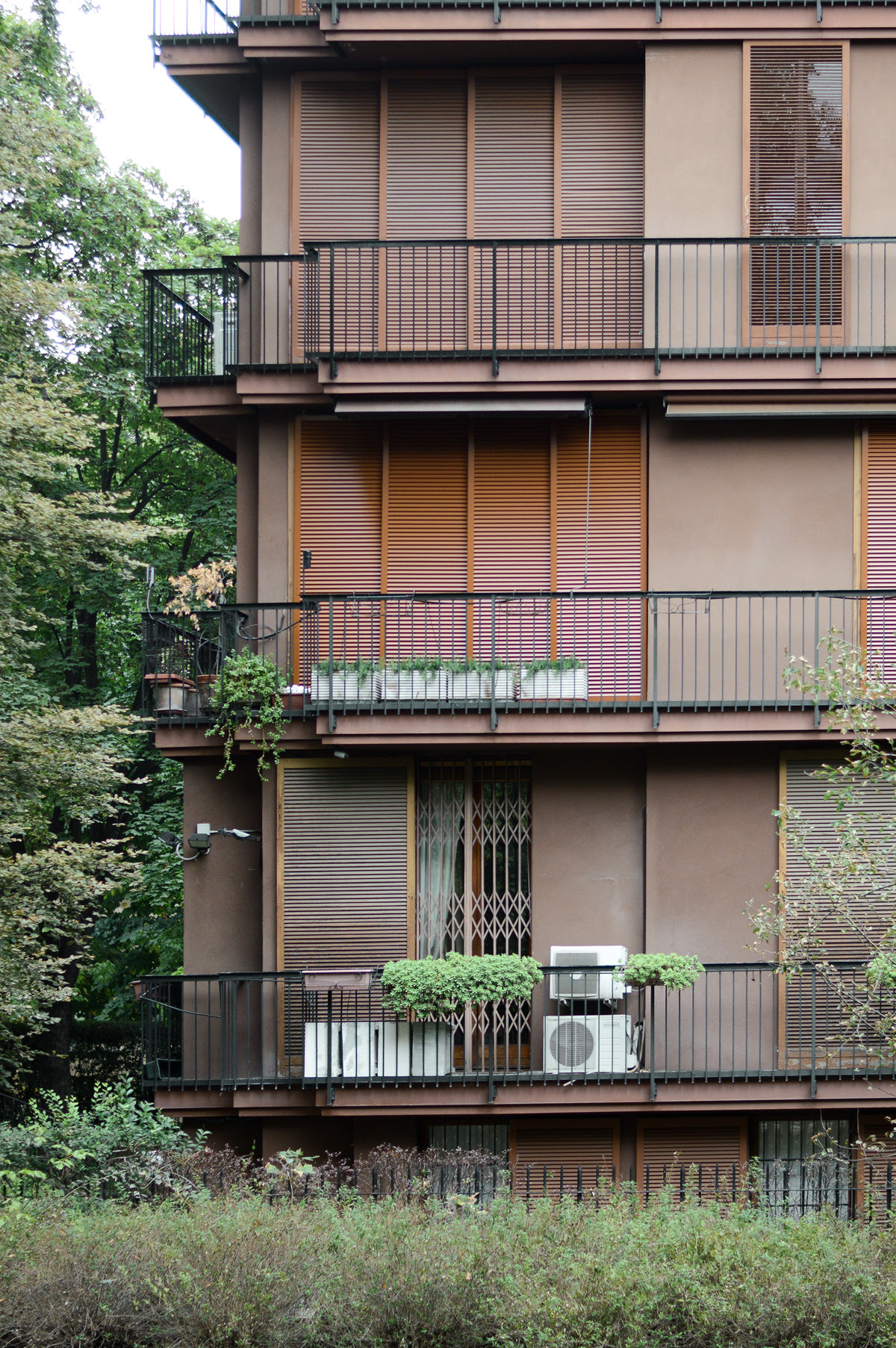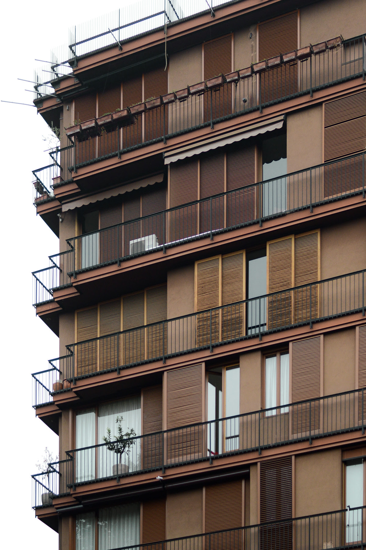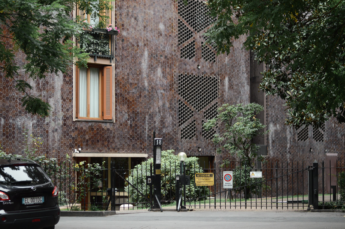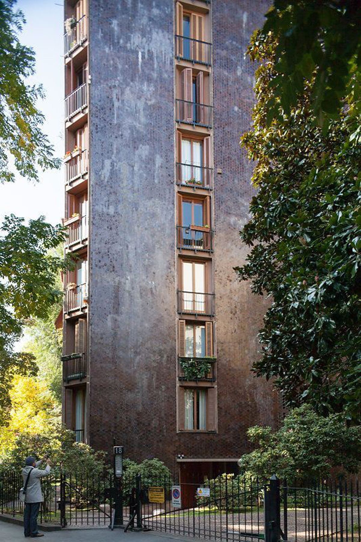 En el frente opuesto, una fachada de abertura continua, marcada por los forjados vistos continuos y las persianas corredizas que otorgan un efecto compositivo de gran movimiento. En todos los detalles se puede observar la sabiduría artesanal aplicada a la arquitectura que se convertirá en la marca de fábrica del estilo del arquitecto, recuperando el valor de la tradición milanesa.