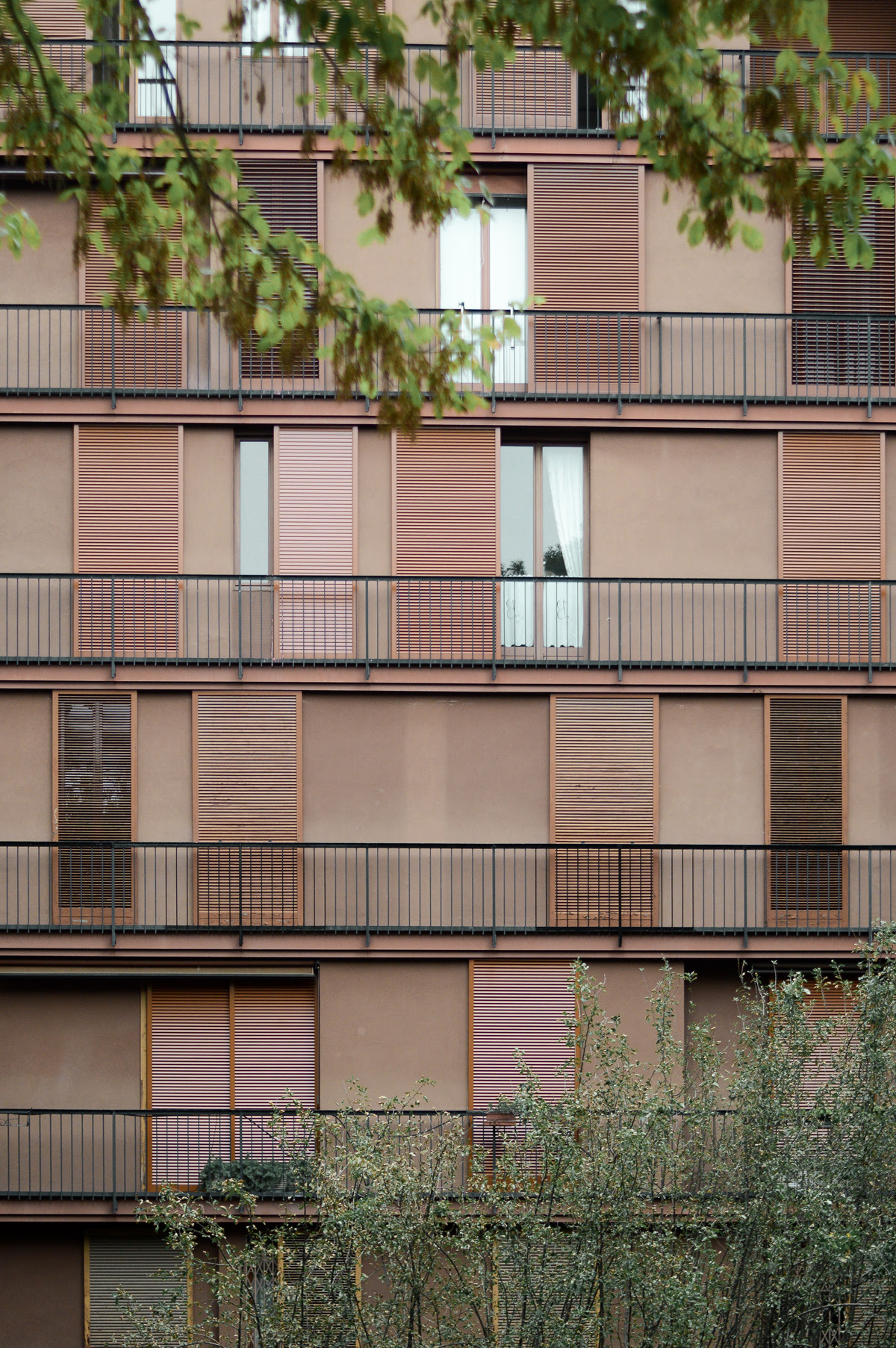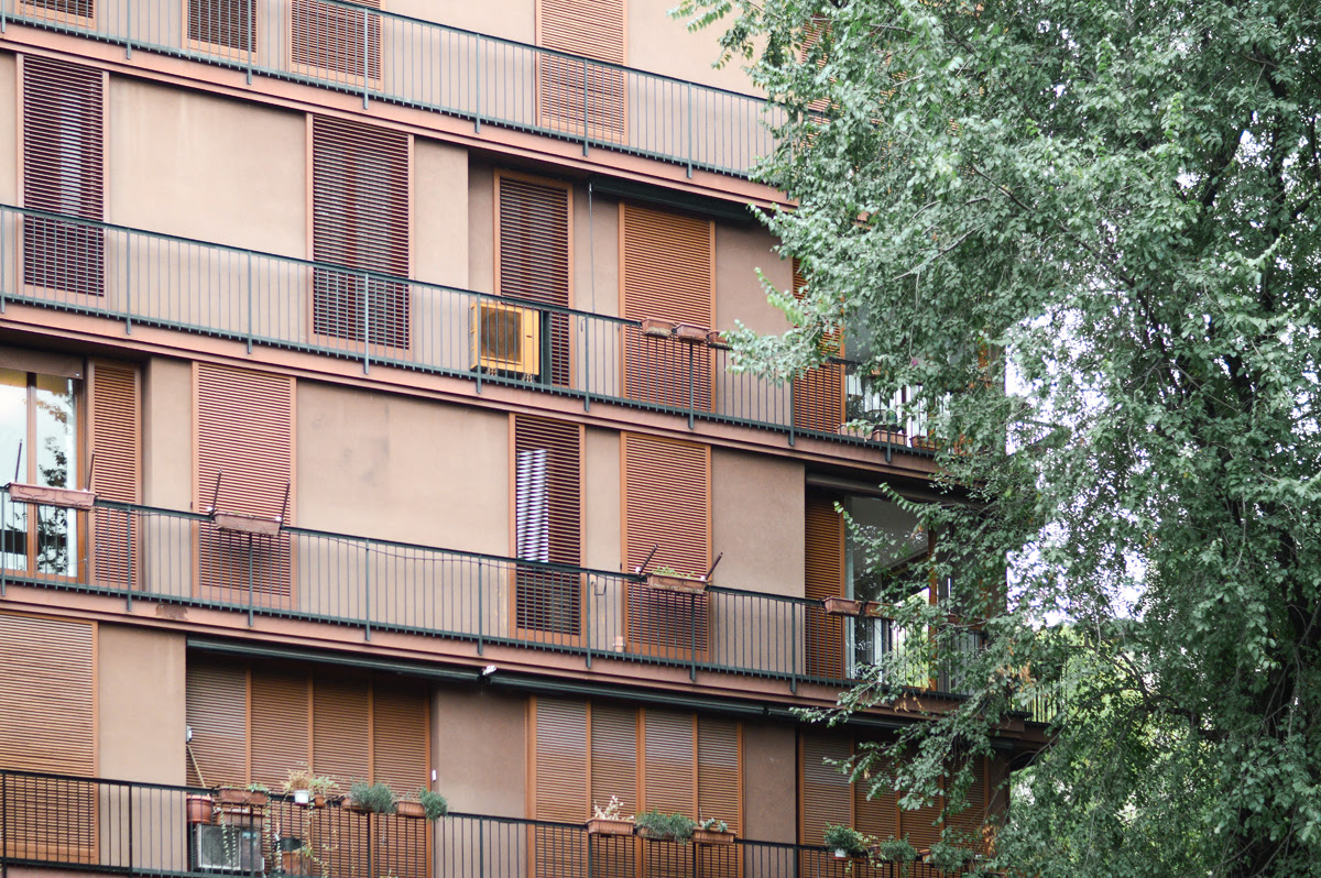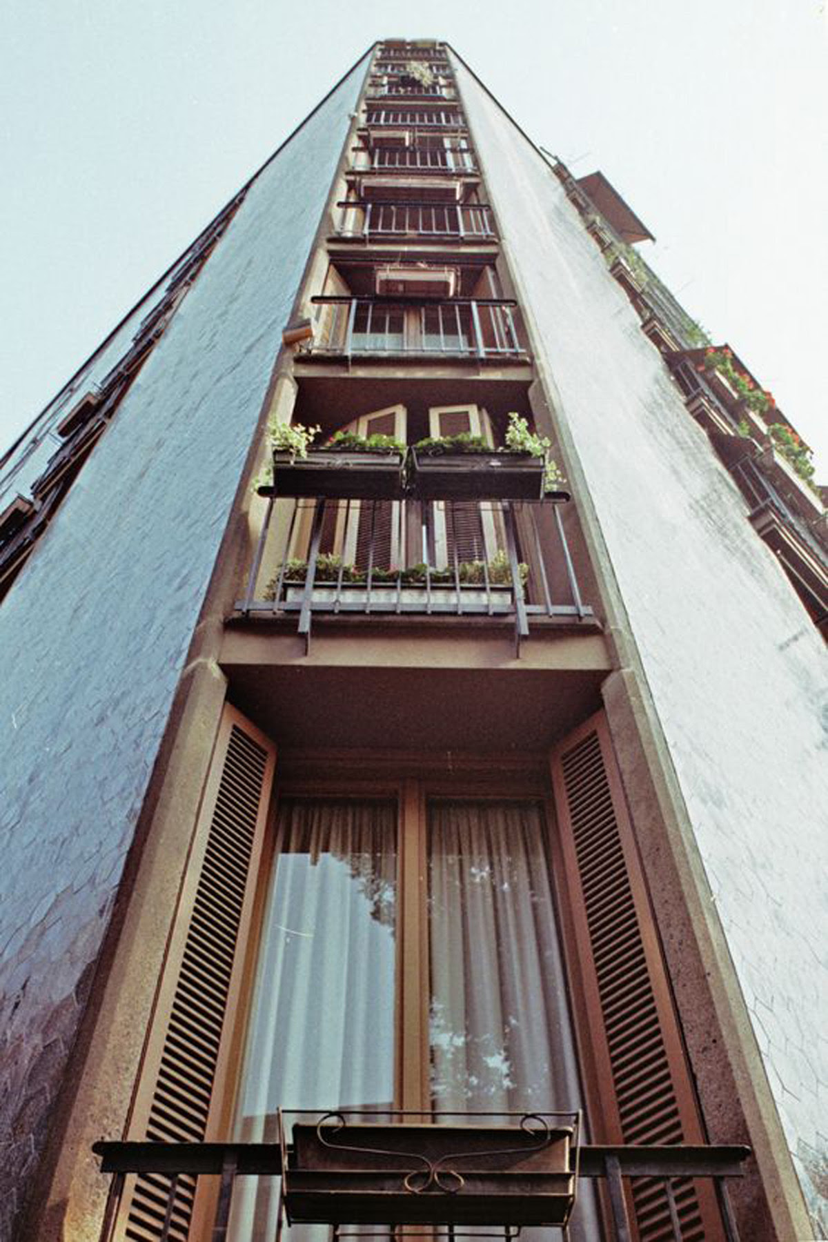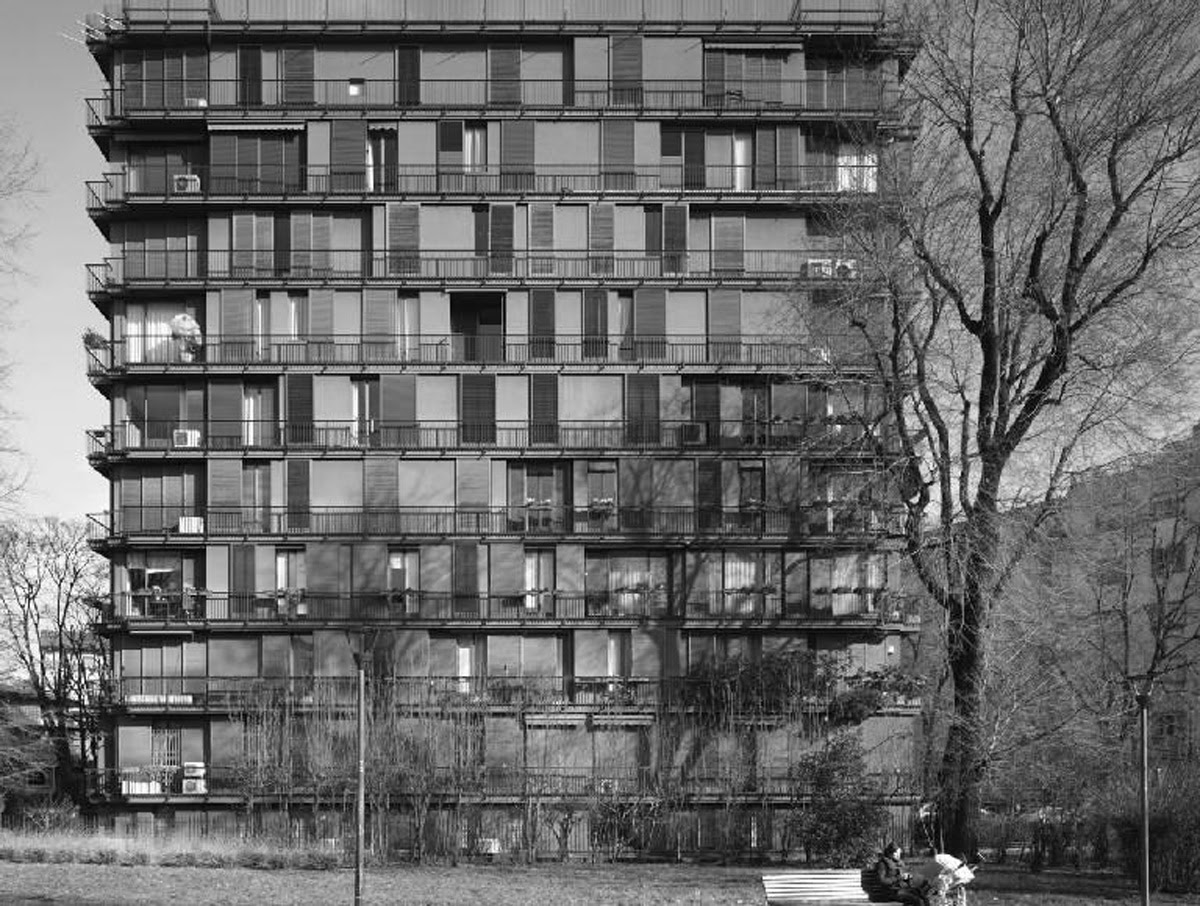 En el frente opuesto, una fachada de abertura continua, marcada por los forjados vistos continuos y las persianas corredizas que otorgan un efecto compositivo de gran movimiento. En todos los detalles se puede observar la sabiduría artesanal aplicada a la arquitectura que se convertirá en la marca de fábrica del estilo del arquitecto, recuperando el valor de la tradición milanesa.
