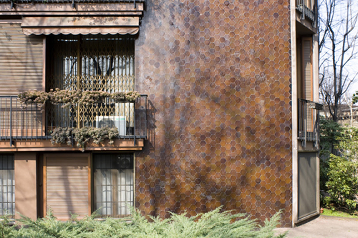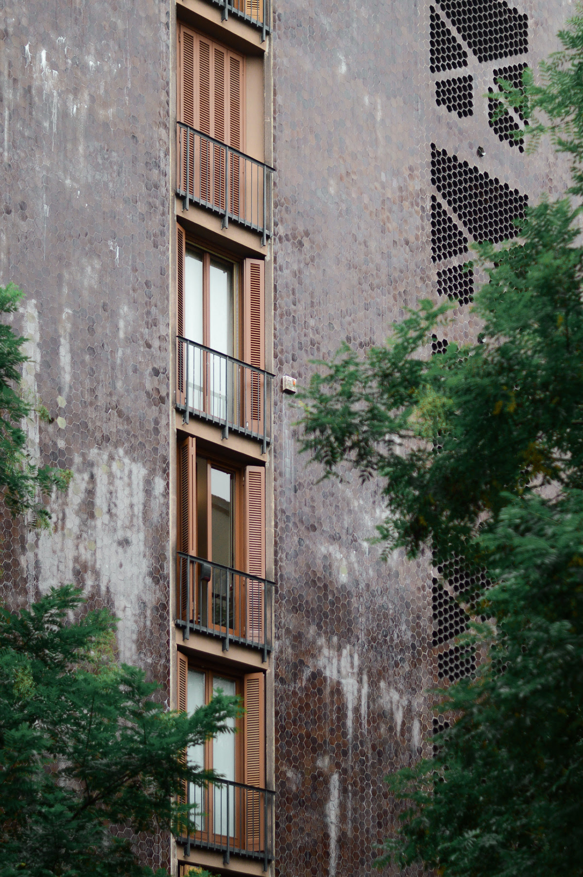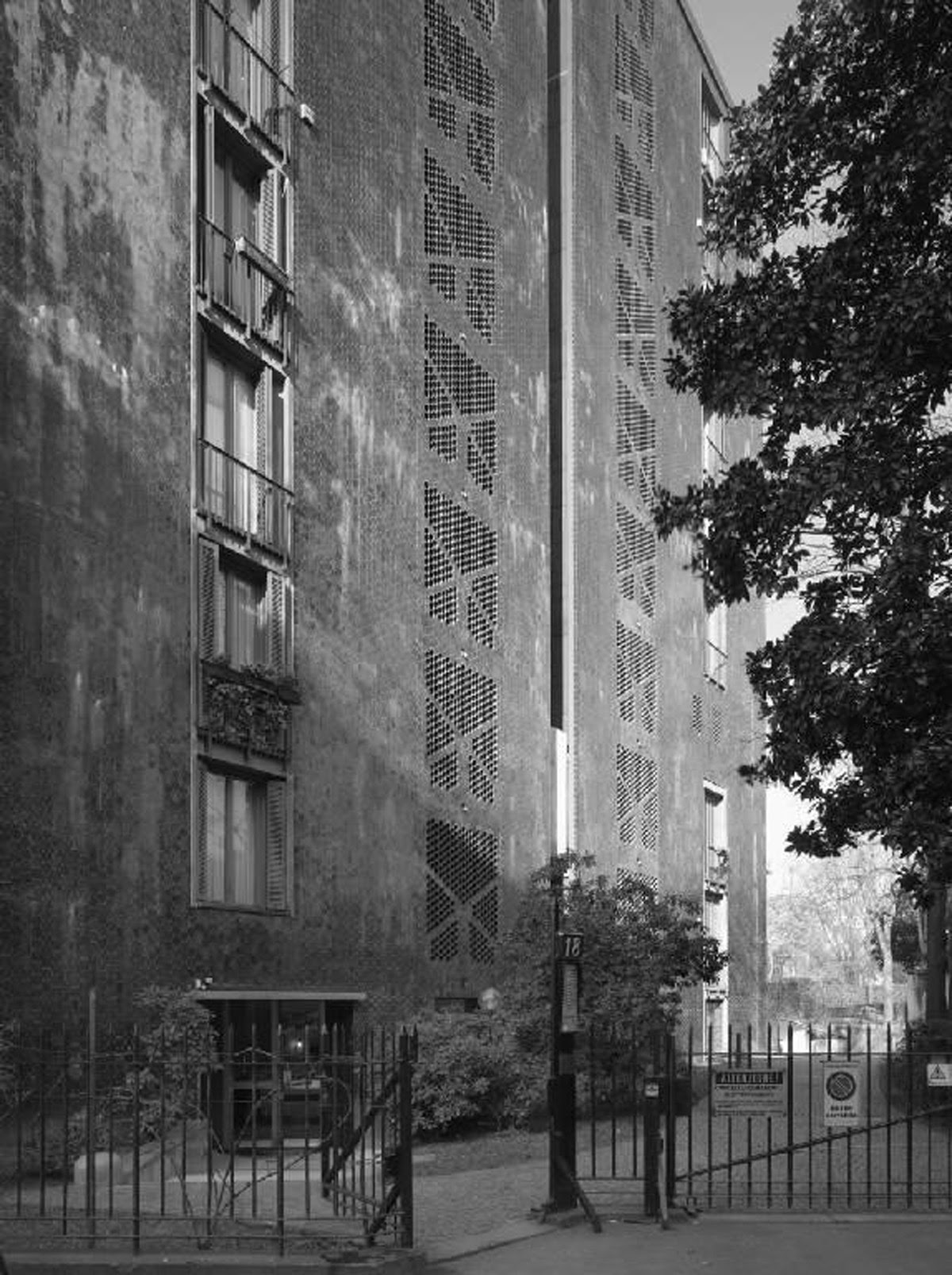 Sobre la esquina Este, rodeando las dos hileras verticales de ventanas, el revestimiento en azulejos cerámicos hexagonales que dan un efecto plástico “alveolar” que reencontramos en otras obras precedentes del autor.