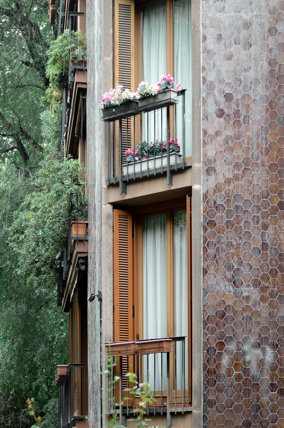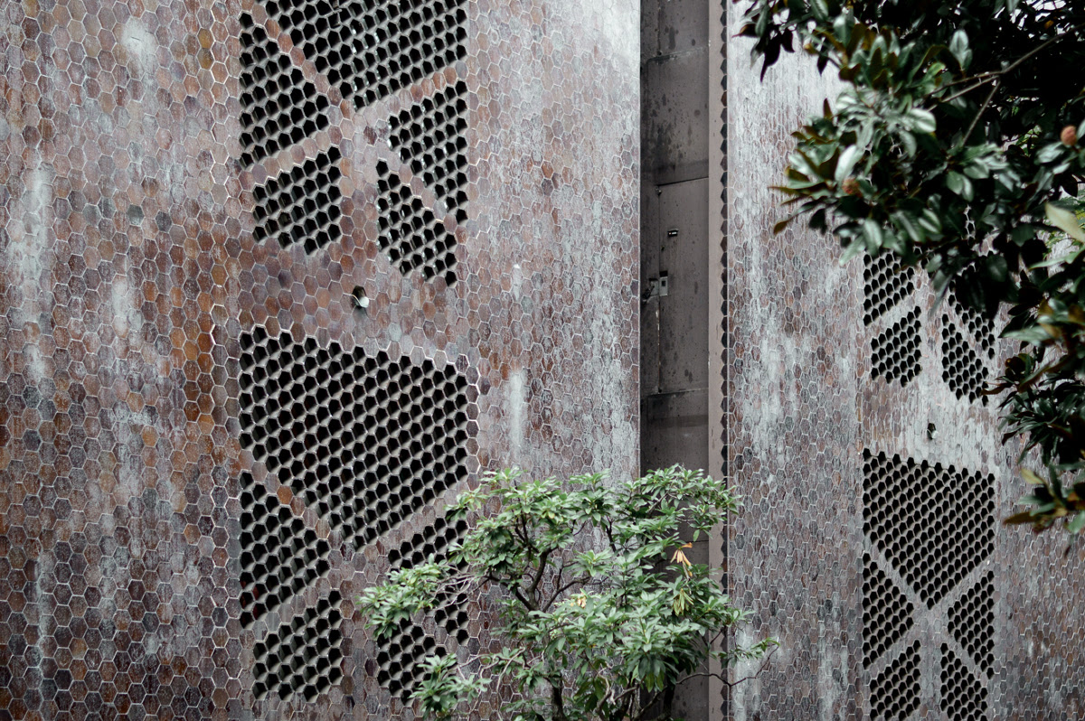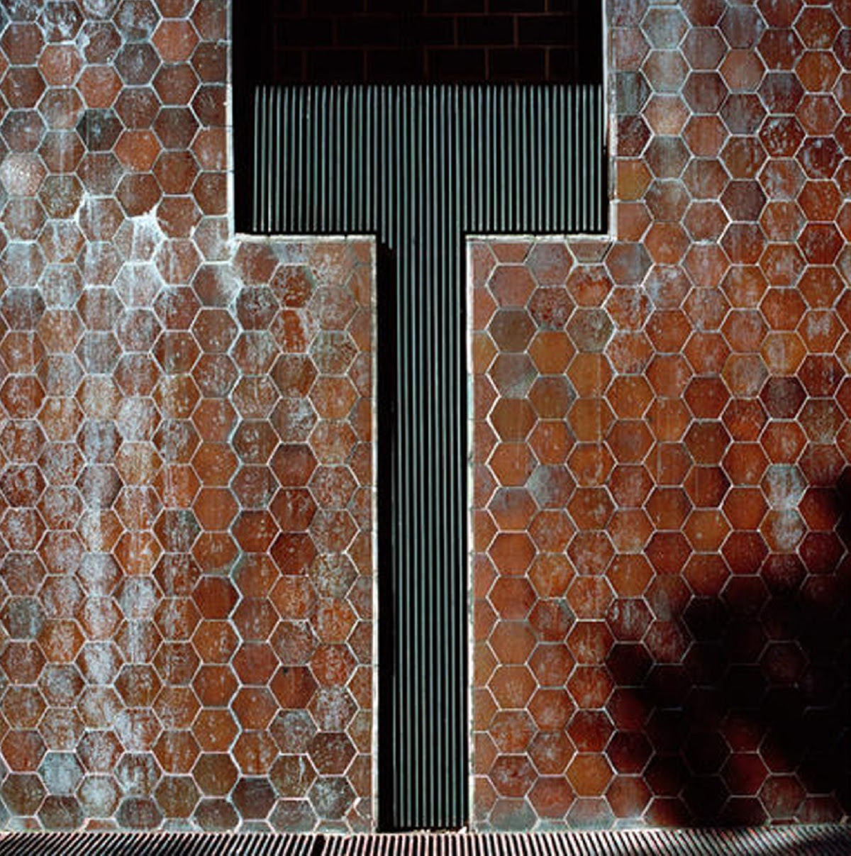 Sobre la esquina Este, rodeando las dos hileras verticales de ventanas, el revestimiento en azulejos cerámicos hexagonales que dan un efecto plástico “alveolar” que reencontramos en otras obras precedentes del autor.