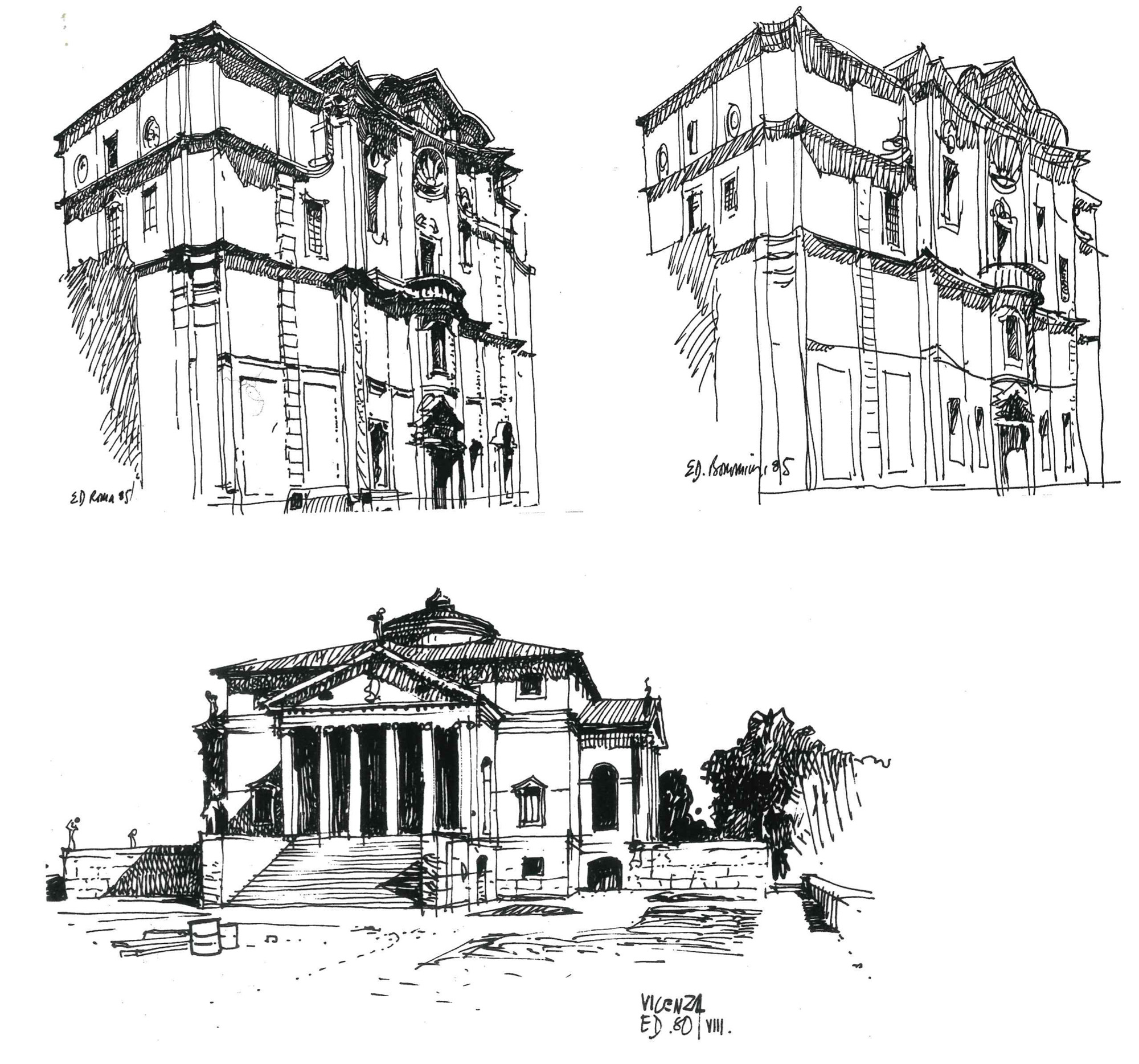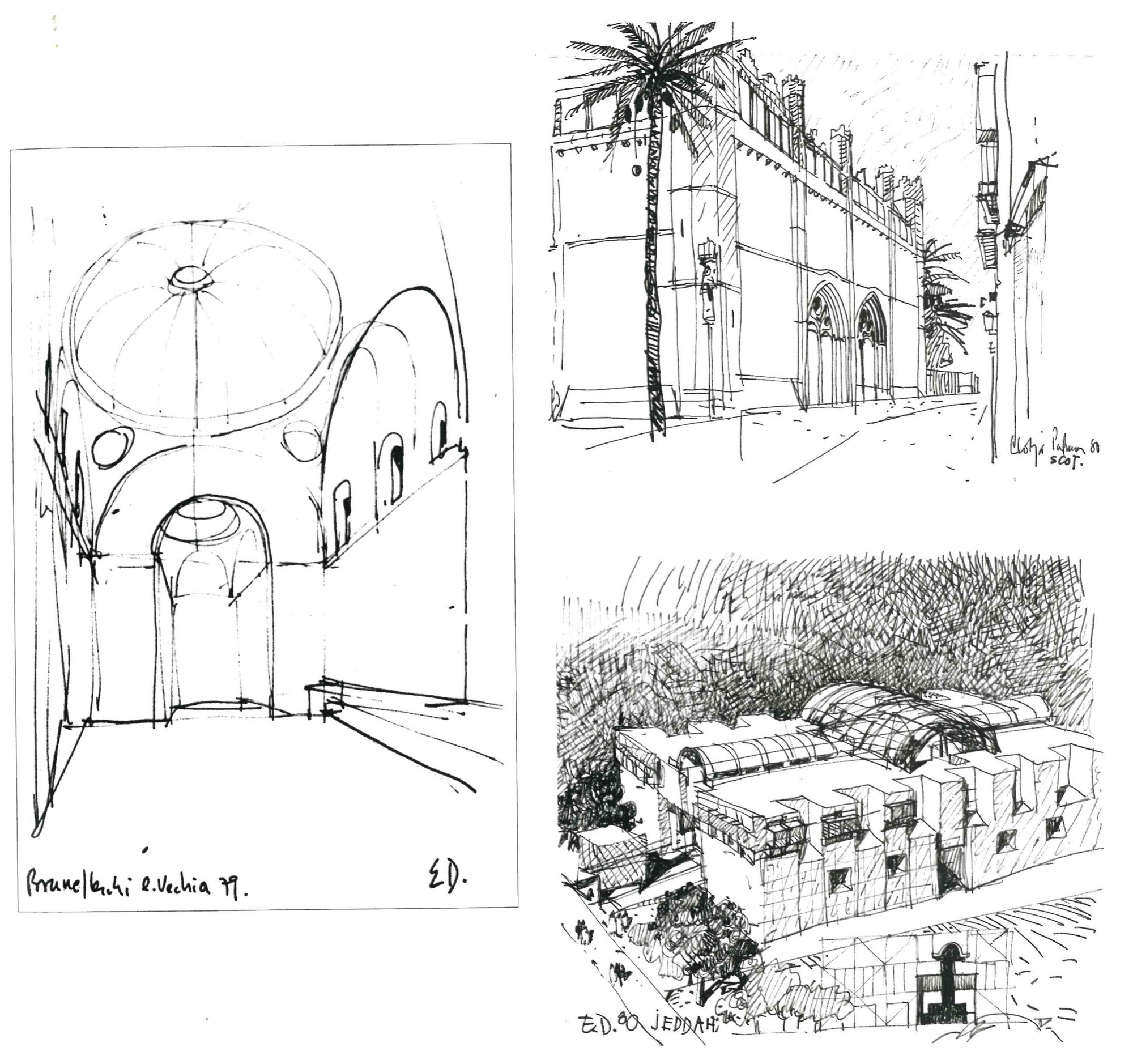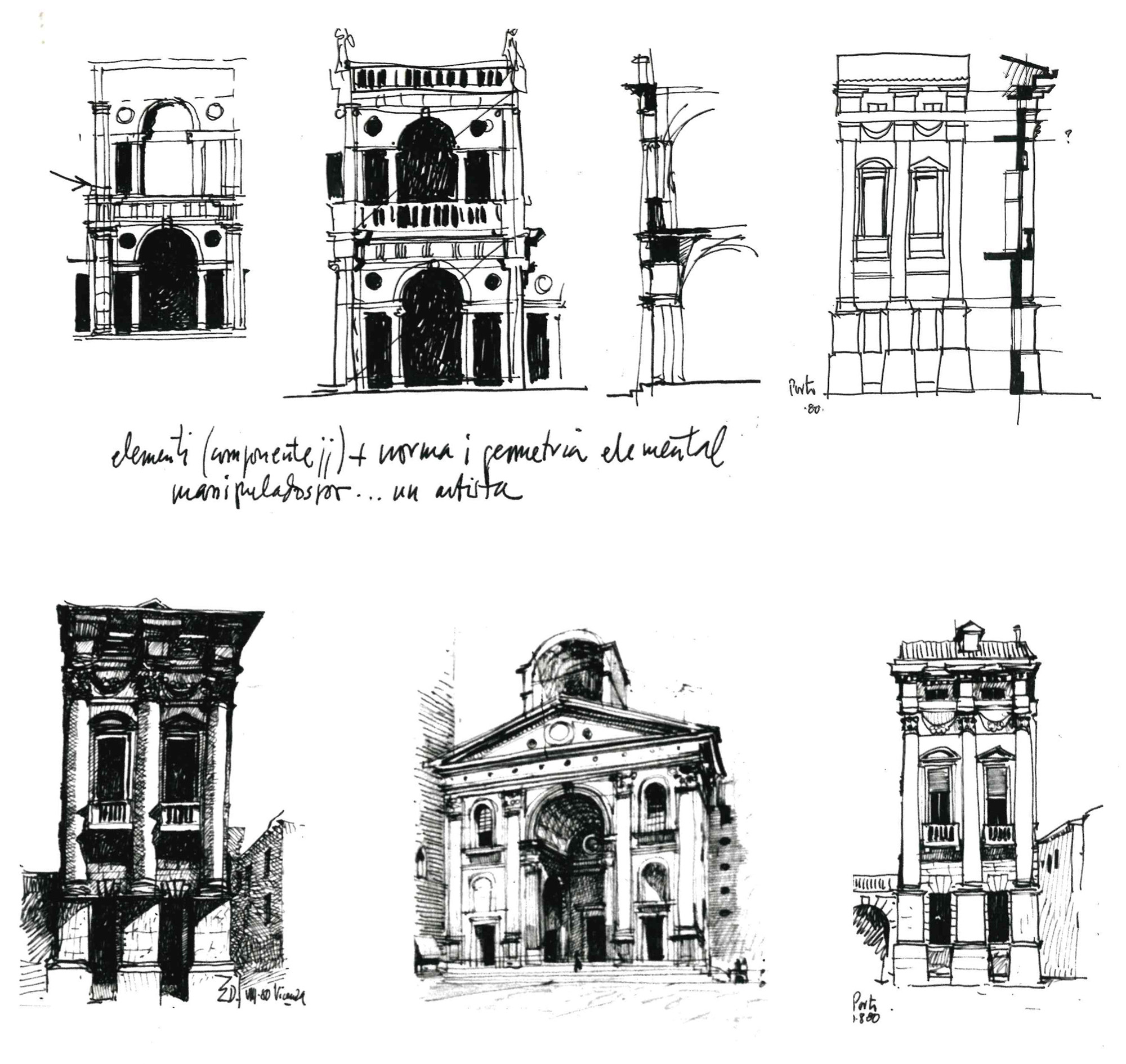 “Entonces, el camino recorrido, los rodeos y los retrocesos, pero sobre todo la vibración de cada uno de los trazos, el movimiento de cada una de las curvas, la vibración de cada una de las sombras, nos cuentan la historia de estos primeros encuentros y de este primer acuerdo con la materia del mundo, de ese surgimiento de la figura en claroscuro, sobre la claridad uniforme de la hoja de papel. Y es cuando el arquitecto, por las exigencias del objeto, se hace pintor y utiliza la perspectiva, o bien el color, por la relación que éste sugiere entre lo próximo y lo lejano, o bien la sombra y la luz, cuando el trazo fugado hace nacer la magia de la profundidad y la figura se vuelve forma, volumen, espacio, y es entonces cuando el dibujo nos envuelve por completo, como en los cuentos para niños en los cuales empezamos a convivir y adentrarnos en las imágenes y donde el ensueño se torna realidad.”