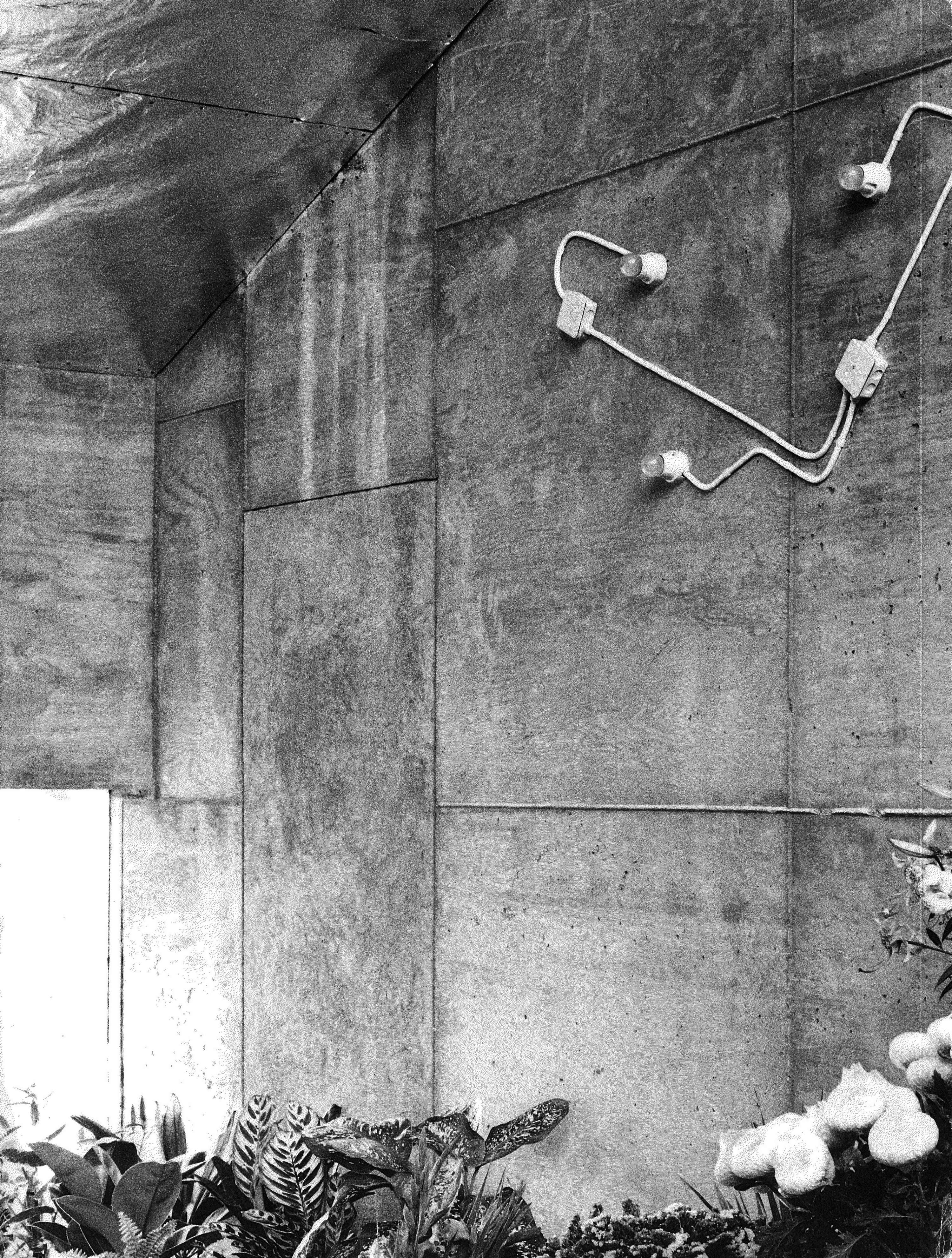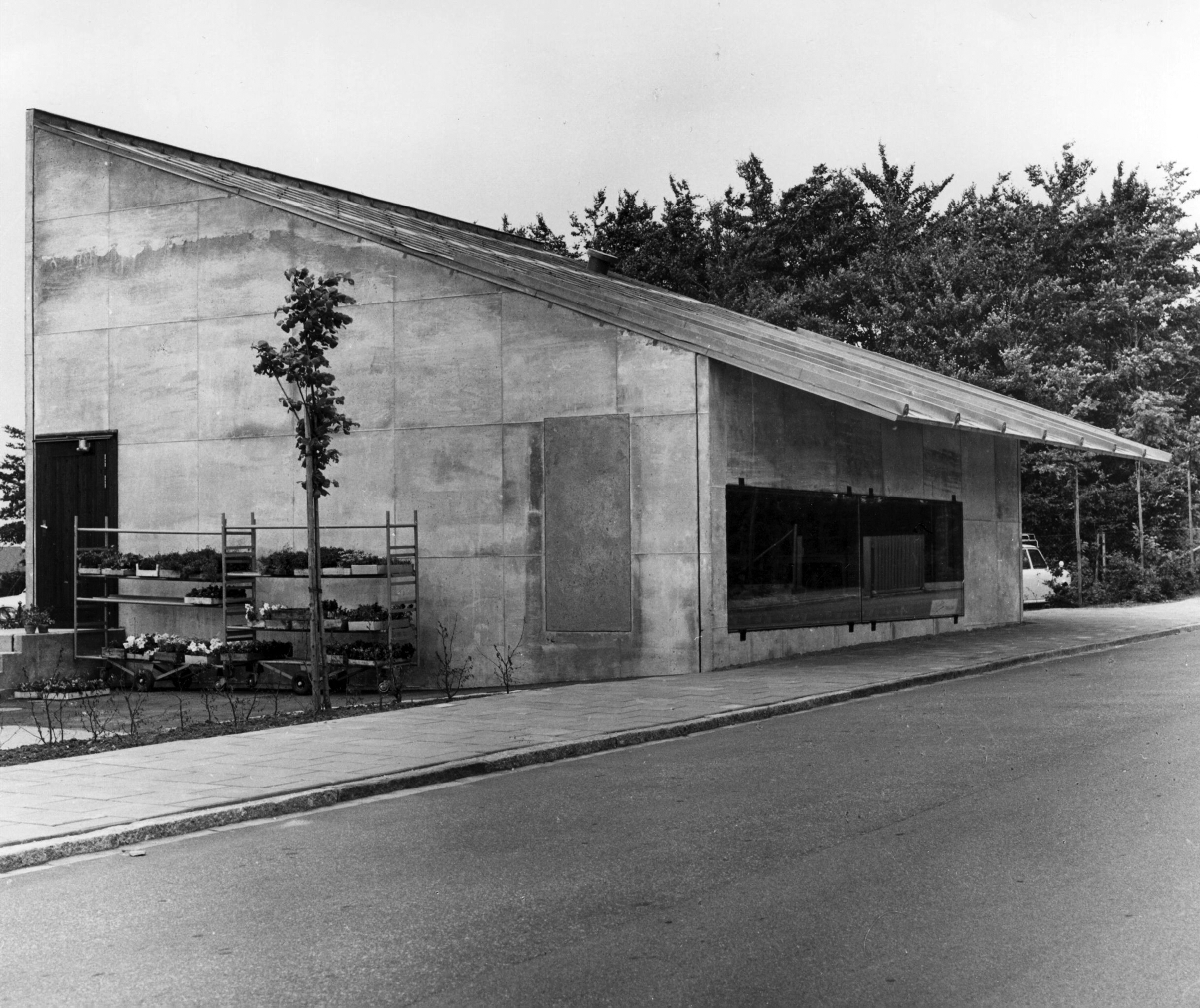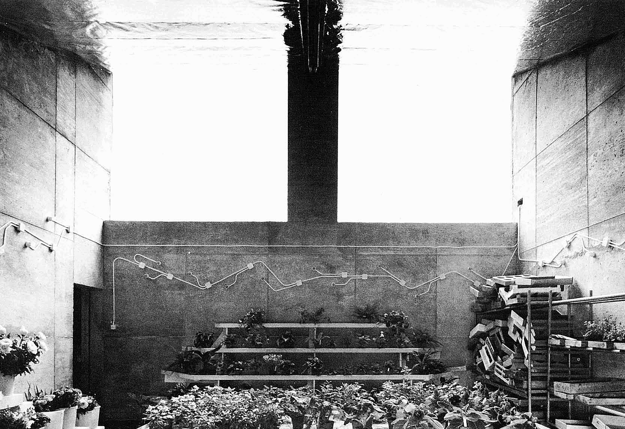 The flower kiosk at Malmö Cemetery, a tiny work completed by the 84-year-old Lewerentz in 1969, has concrete walls featuring plywood shutters and a steep roof cantilevered over the pavement with thin beams on the overside covered, like the rest of the roof, with copper. A door at the rear, seldom used, has been left without any steps so as not to disturb the surroundings. The electric wiring and lamps on the untreated concrete inside are arranged in an almost flower-like pattern that might seem affected had it not been done in such a straightforward way. Here Lewerentz broke all conventions, sceptical yet open at the same time and willing to reconsider everything. His reduction of vocabulary to bare essentials recalls Becket’s phrase, “The less there is to say, the better it is said.”