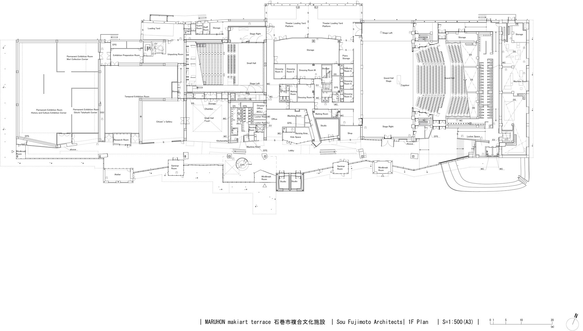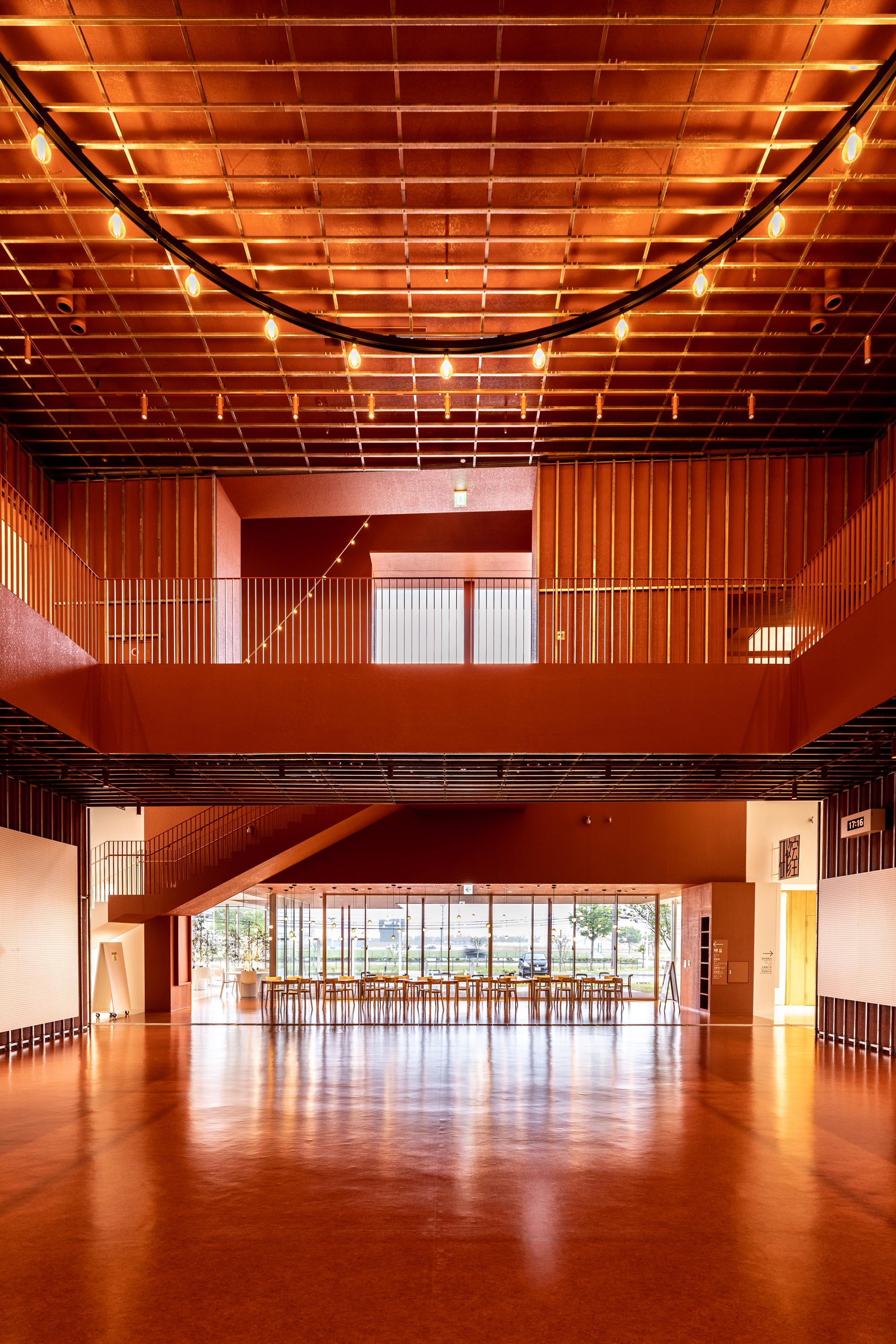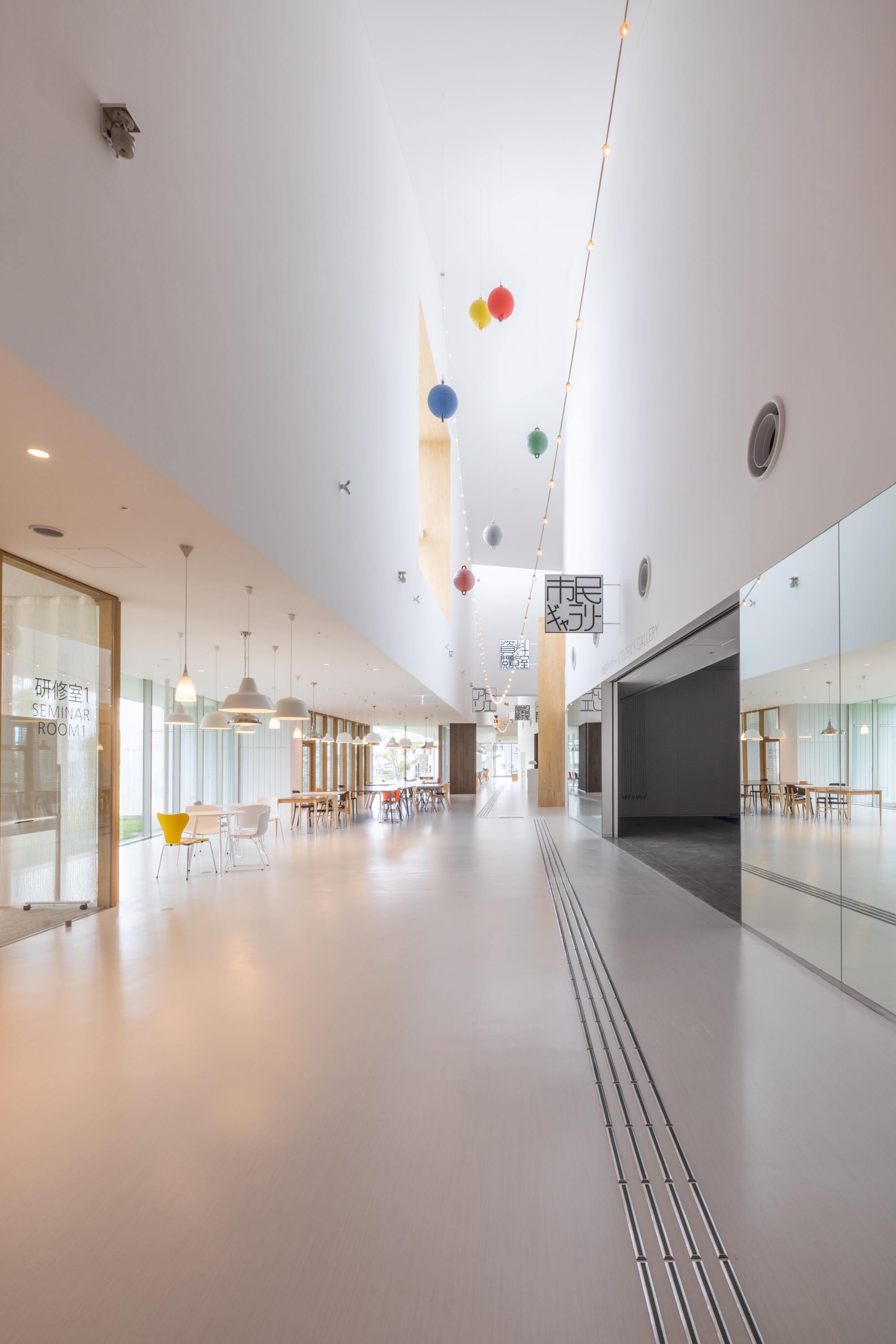 A simple plan configuration arranges programs linearly along a slender lobby of about 170 m in length. We placed the functions that are highly used by citizens, such as practice studios, and ateliers in such a way as to protrude into the lobby space. This creates interlocking effects of various scales as if to further segment the linear lobby. By carefully adjusting the entire space, including the selection and placement of furniture, as well as the density of signs and lighting fixtures, we intended to enable citizens to find a comfortable place in their daily lives; a place where local students study after school, people chit-chat, and read. As these rooms and functions began to appear like huts in the lobby space, we placed small house-shaped and chimney-shaped volumes on the lobby roof to bring in light and allow for smoke exhaust. By combining these house shapes and chimney-like shapes, the 13,000-square-meter building with a 30-meter fly tower is both a large facility and a human-scale structure. It has a strong identity but at the same time it is like a small town which evokes various impressions and meanings. The hope is that the building will not be a landmark that imposes a single effect, but something that is built on ambiguity and is flexible enough to allow various people to share their own impressions. All while having a strong presence. The landscape of rows of house-shaped volumes inherits the memory of the buildings that lined the former Kitakami River, which prospered through water trade.